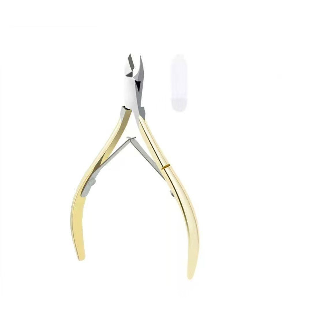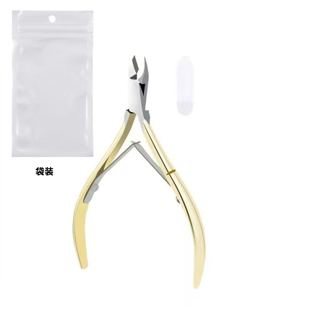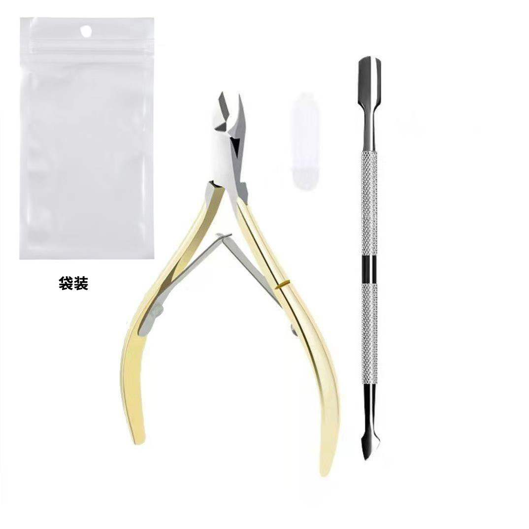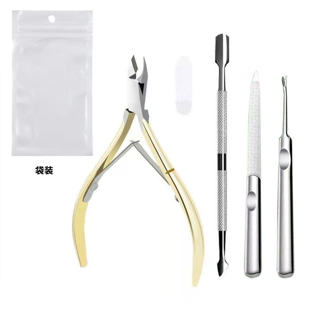 gold dead skin clipper + steel push + nail file + nipper for removing dead skin + white pearlescent bag