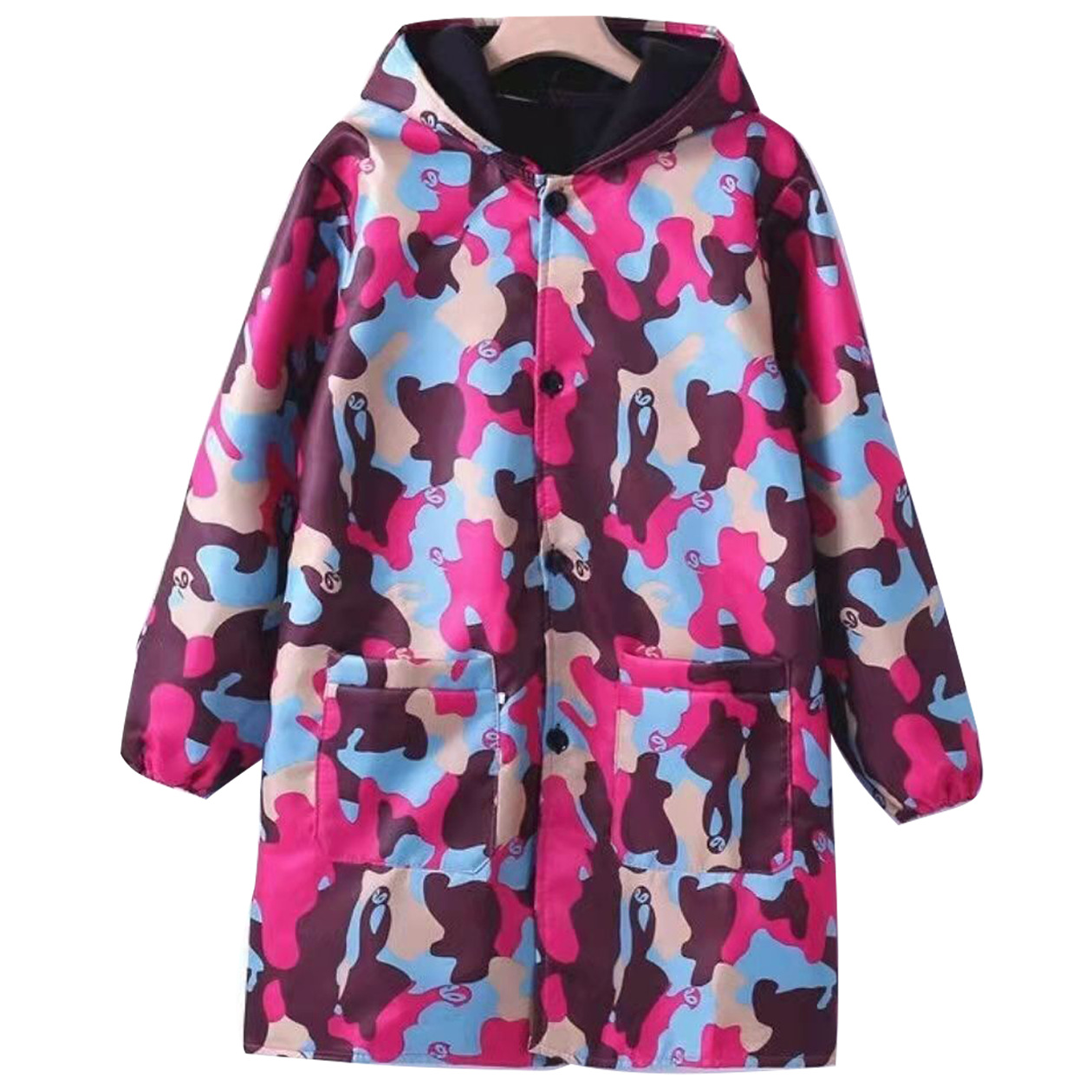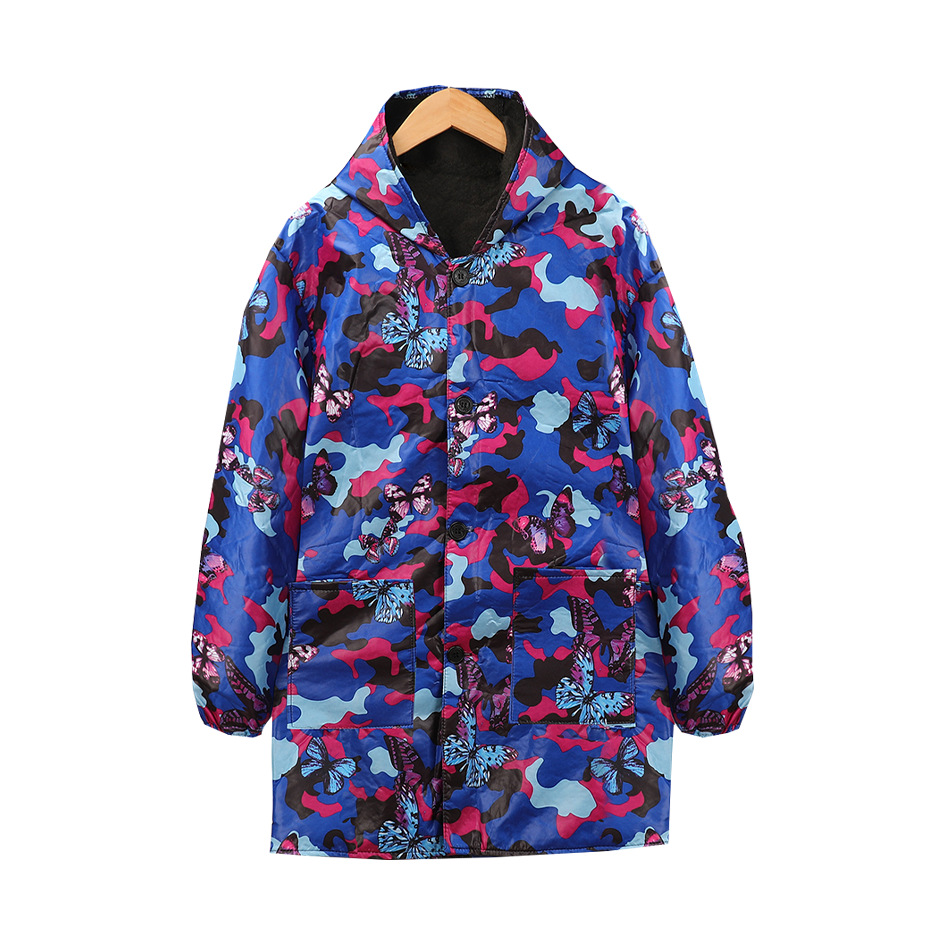 small size; blue butterfly-lined hooded style with buttons