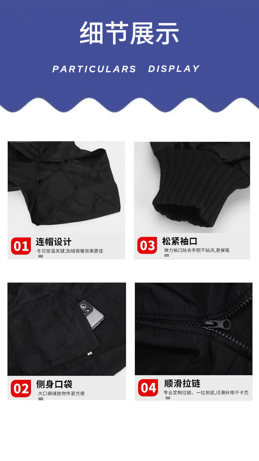large size; solid color (navy blue) plus velvet hooded zipper