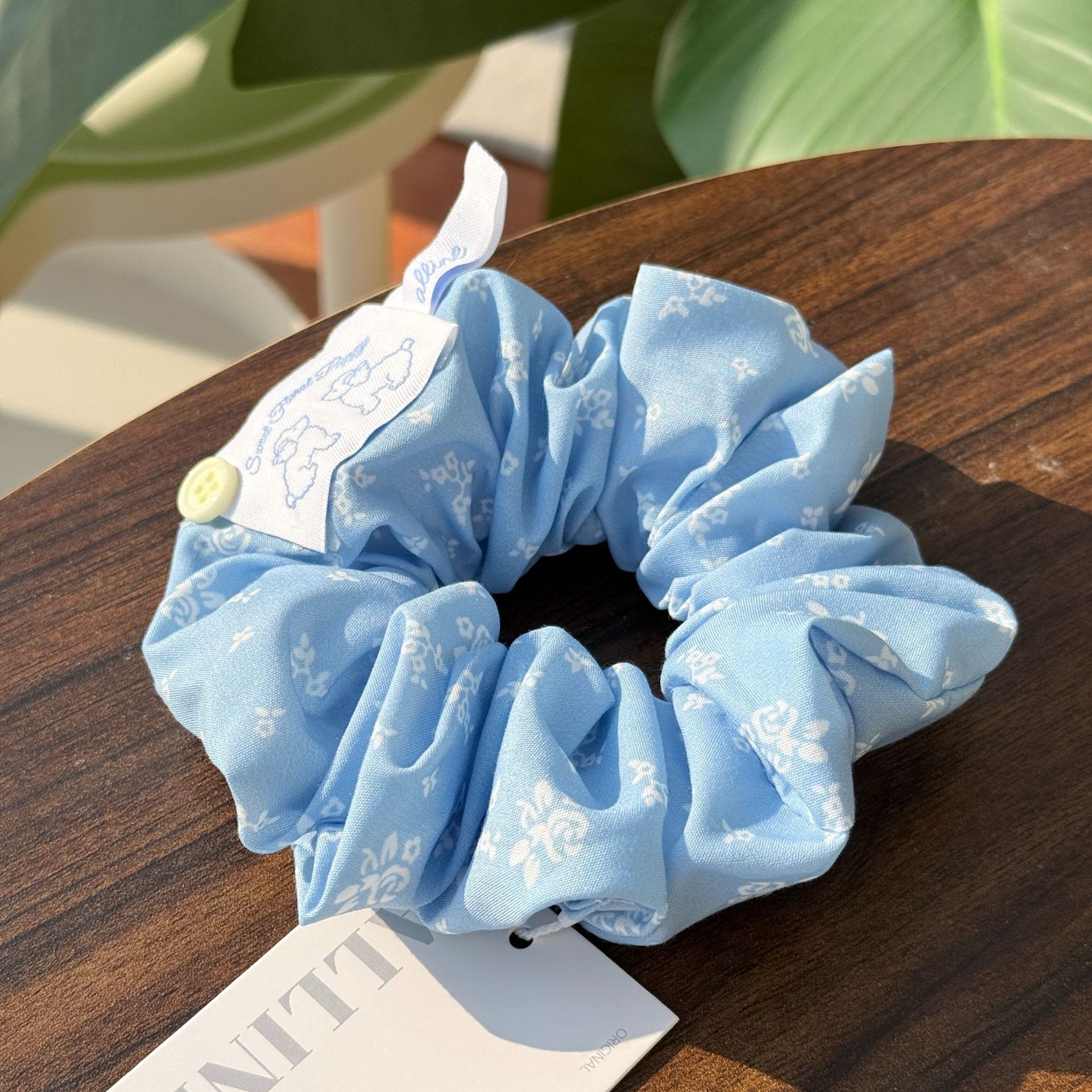 blue flowers-milky white button cloth label hair ring