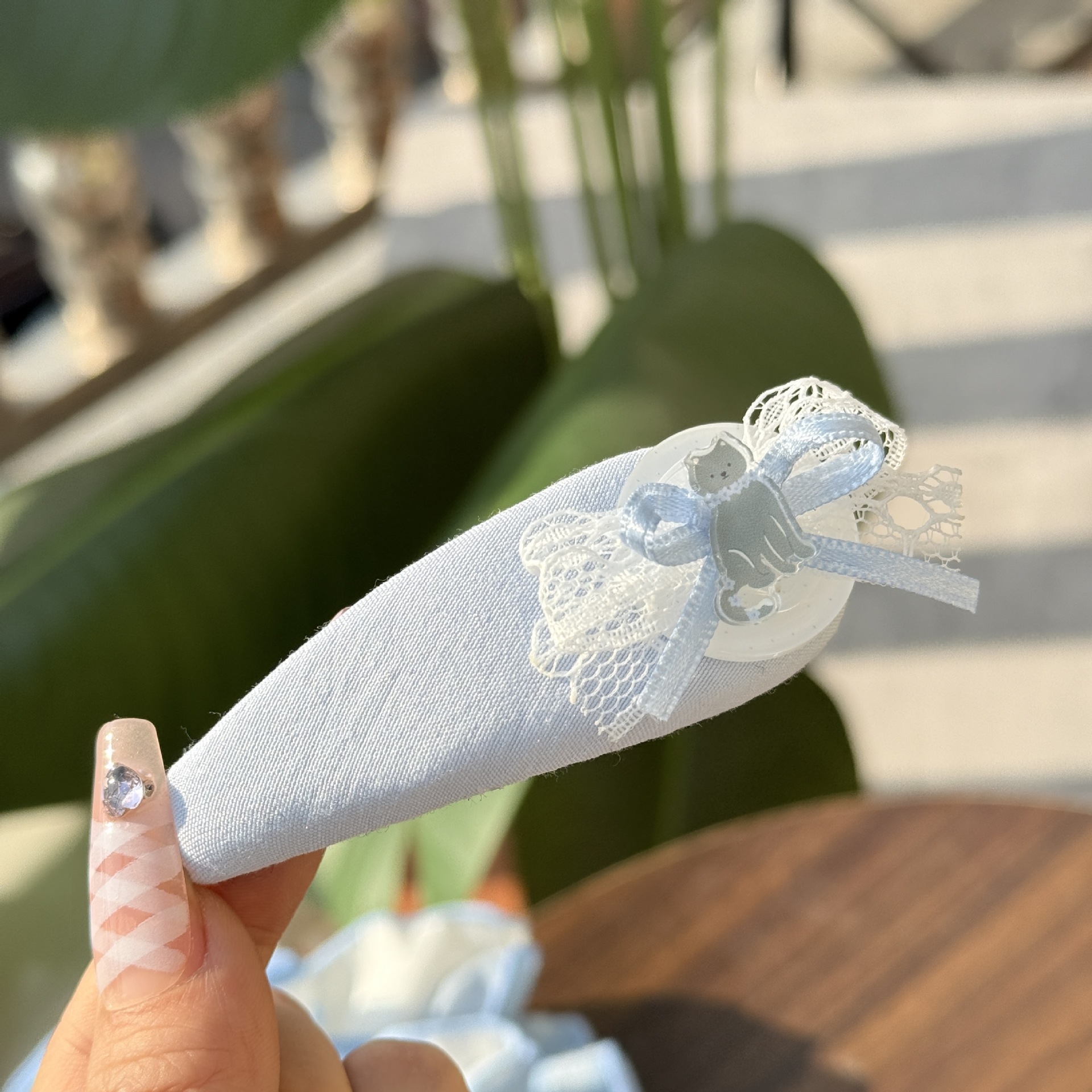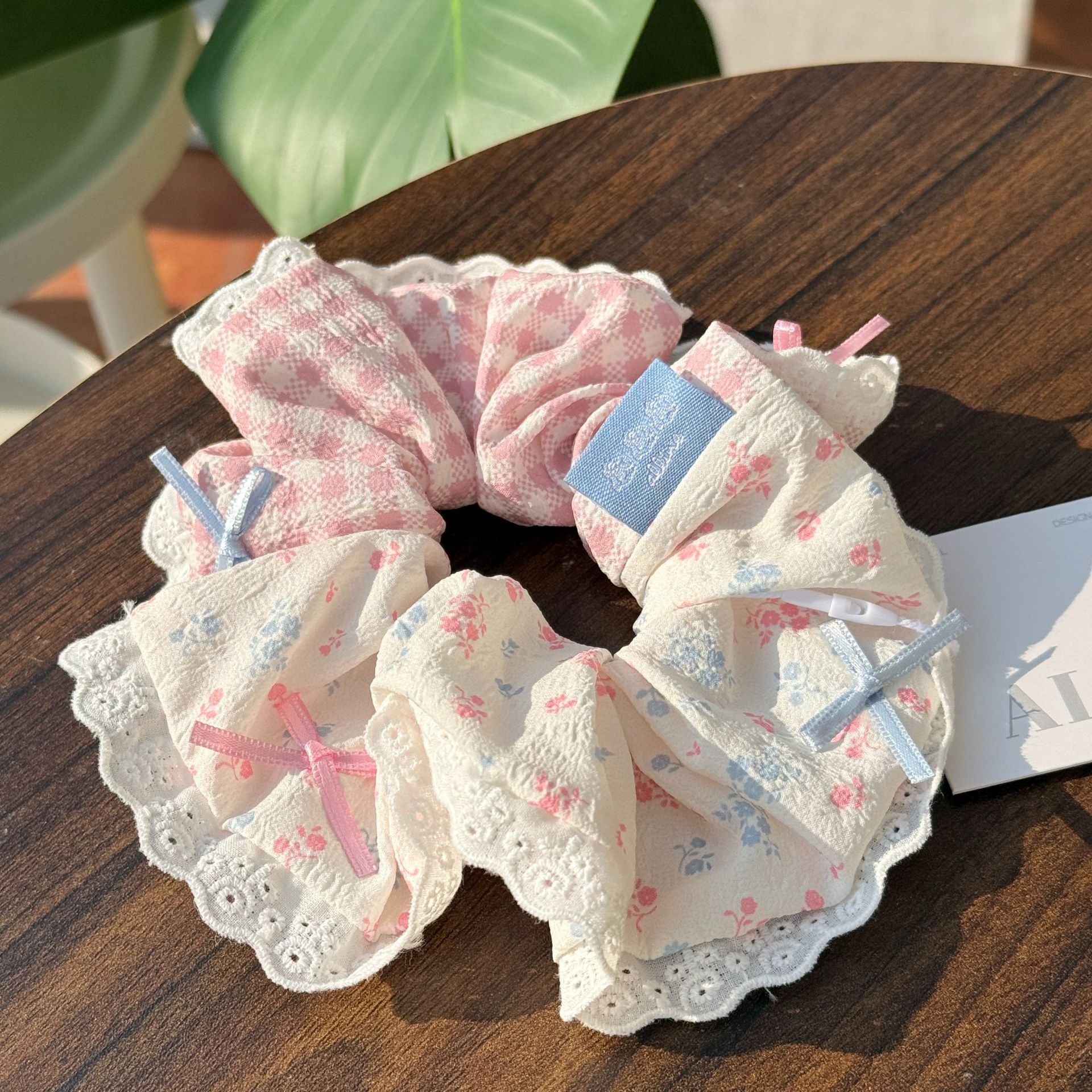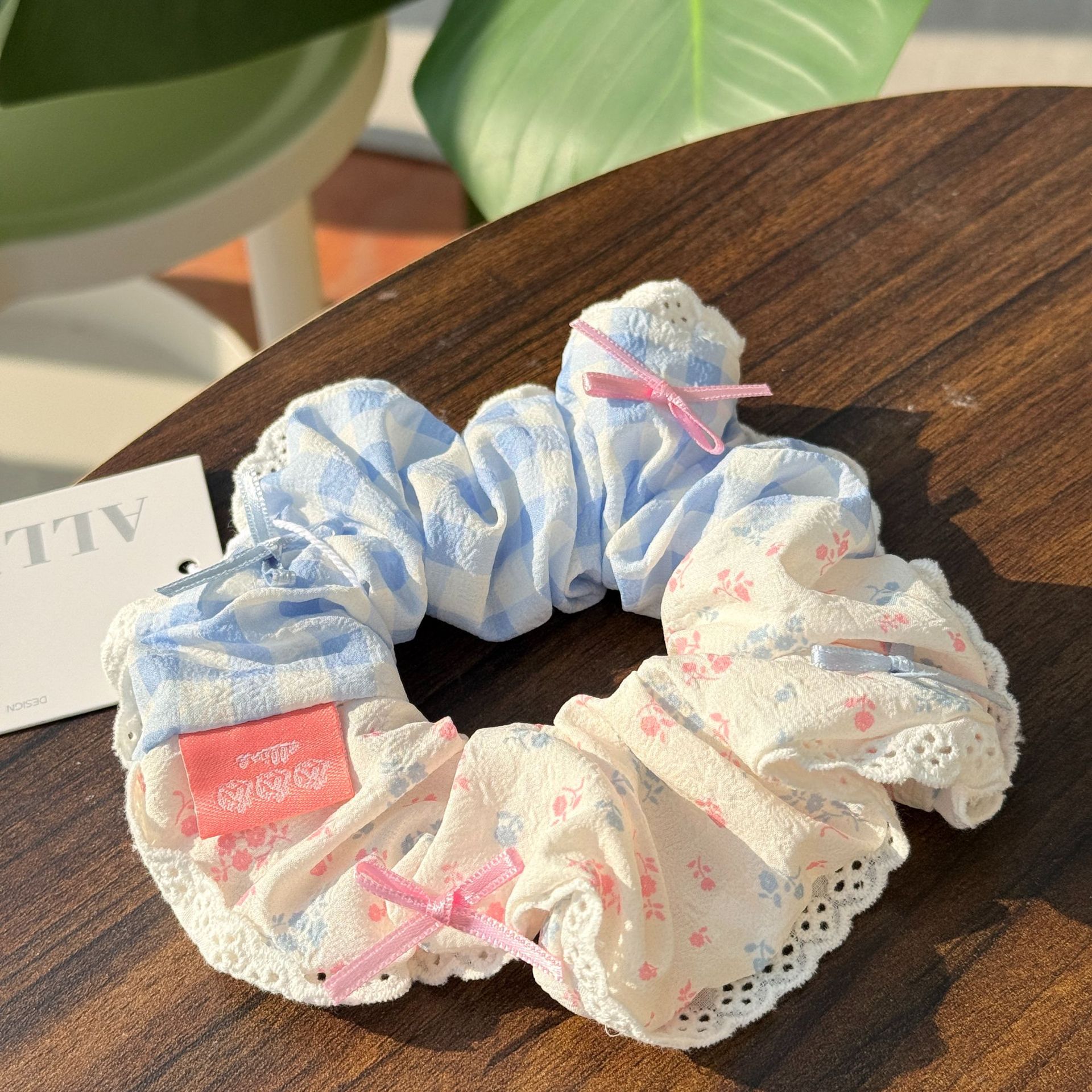 lace-blue plaid floral bowknot hair ring