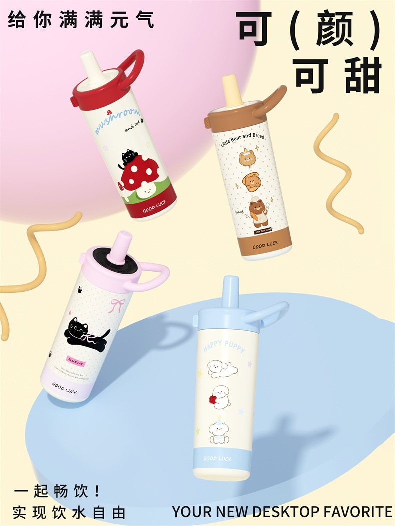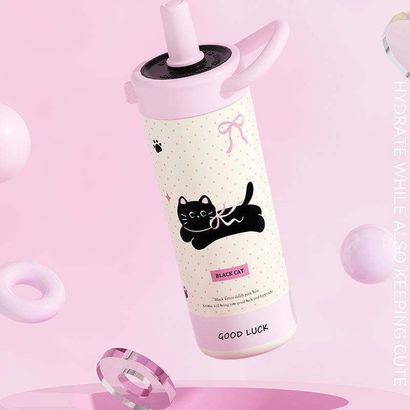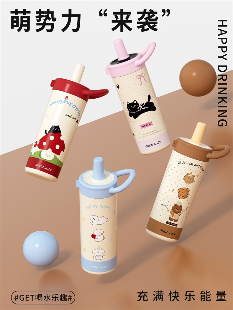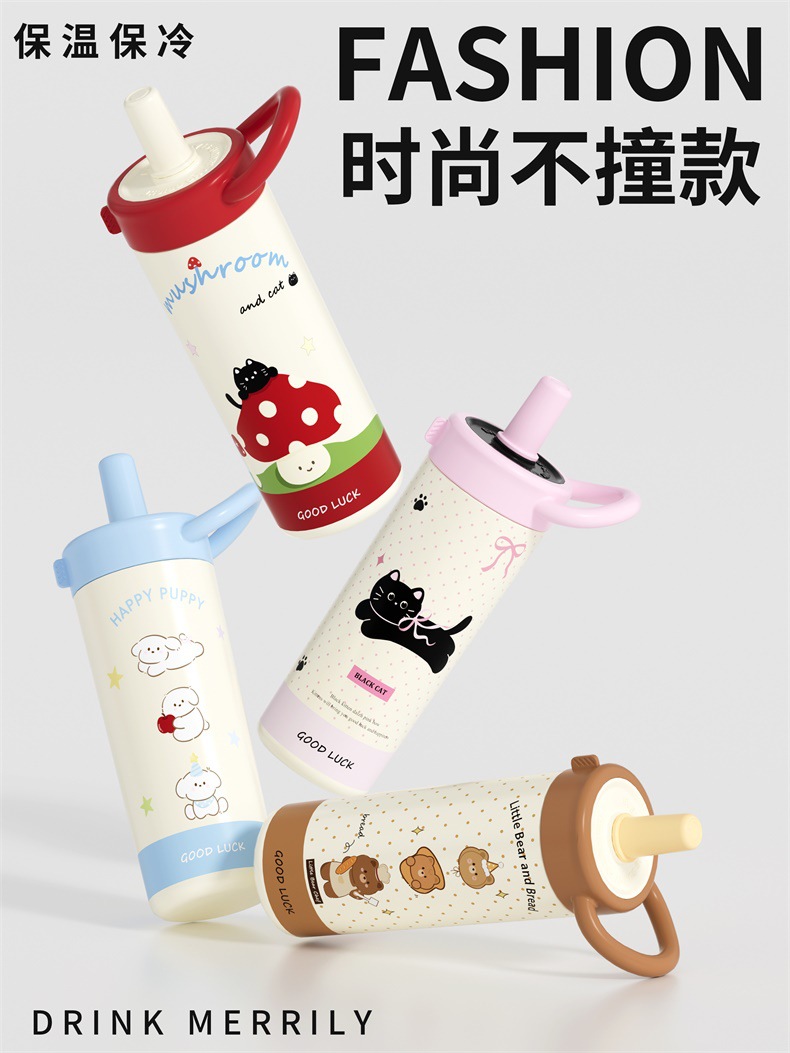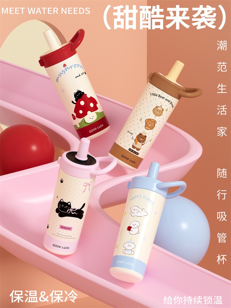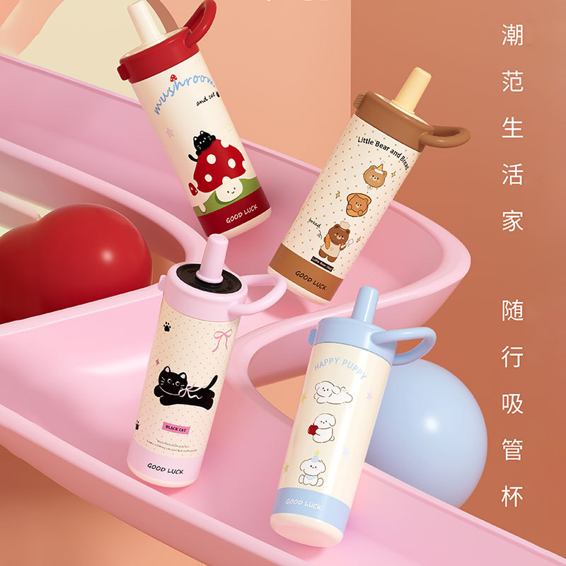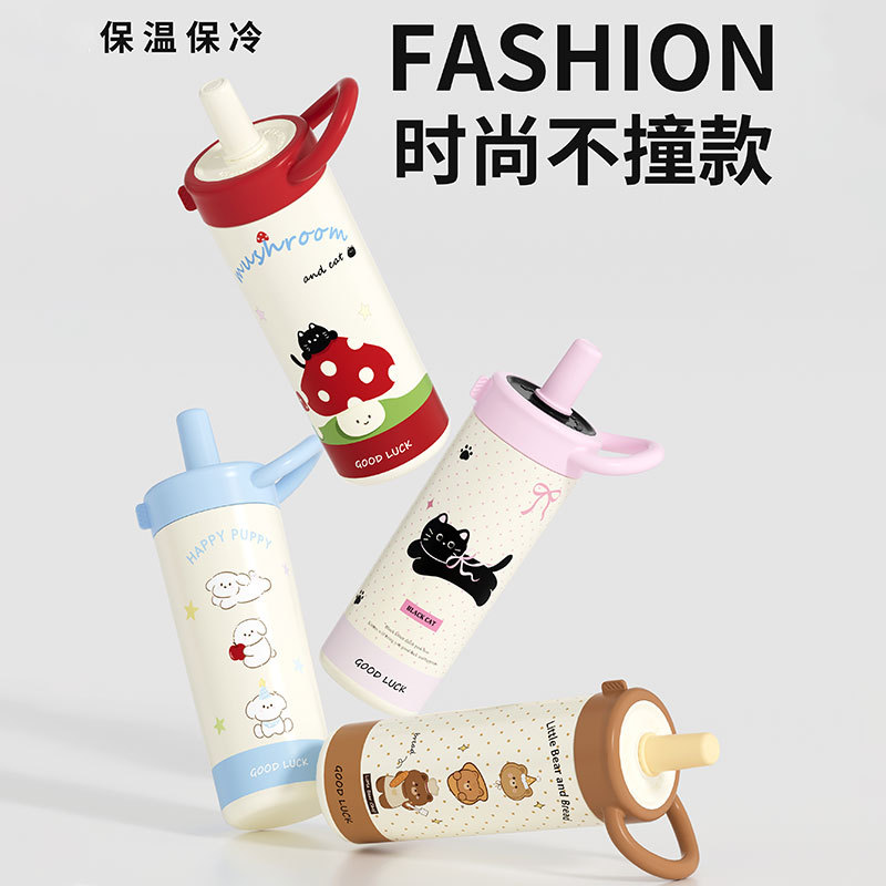 large-capacity 304 stainless steel cute good-looking cartoon cup for girls outdoor portable straw cup sports water bottle