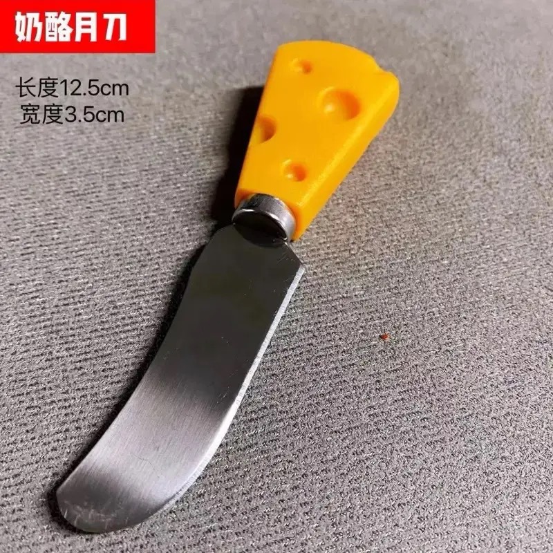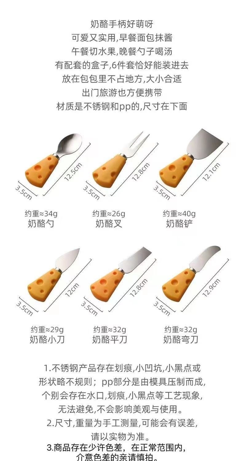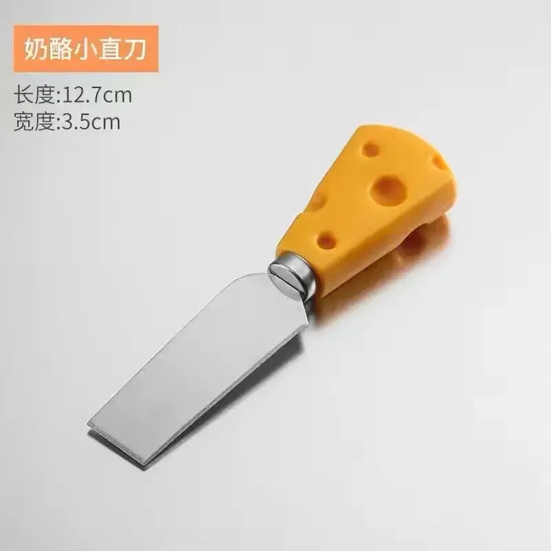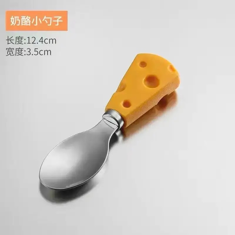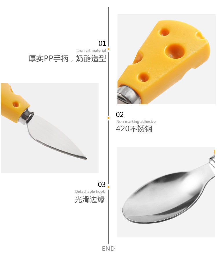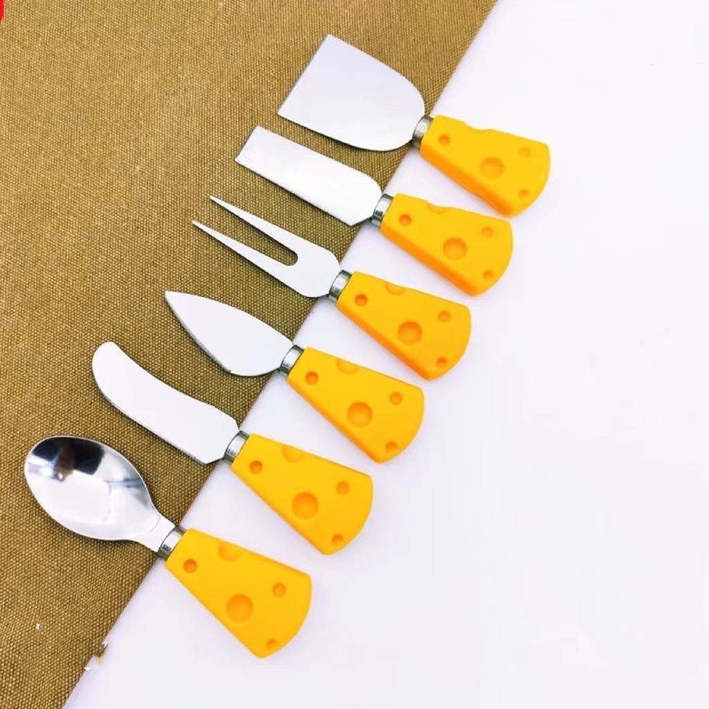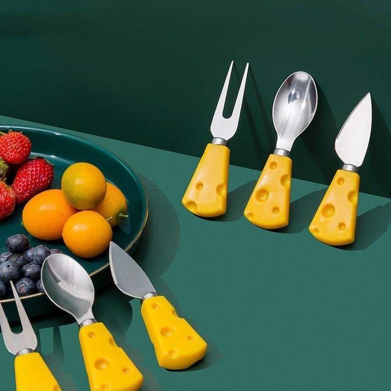 color: cheese fruit fork, cheese heart knife, cheese straight knife, cheese flat shovel
