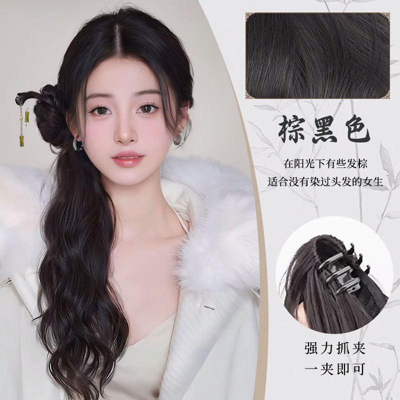 bamboo stick national style bud water ripple ponytail-dark brown