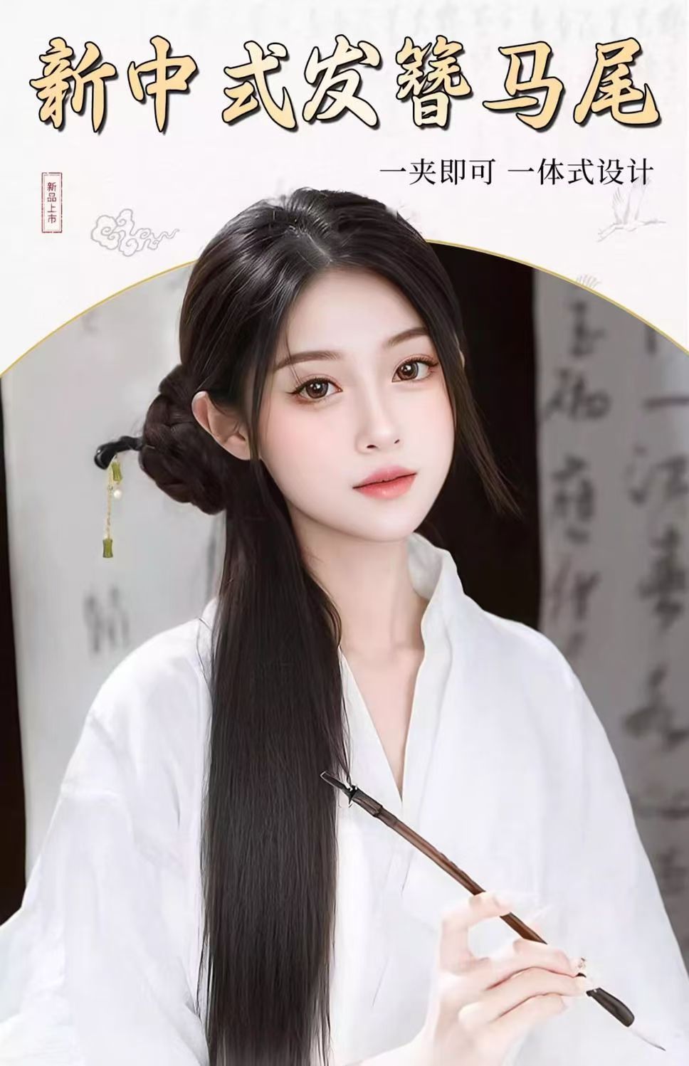 bamboo stick national style bud straight ponytail-dark brown
