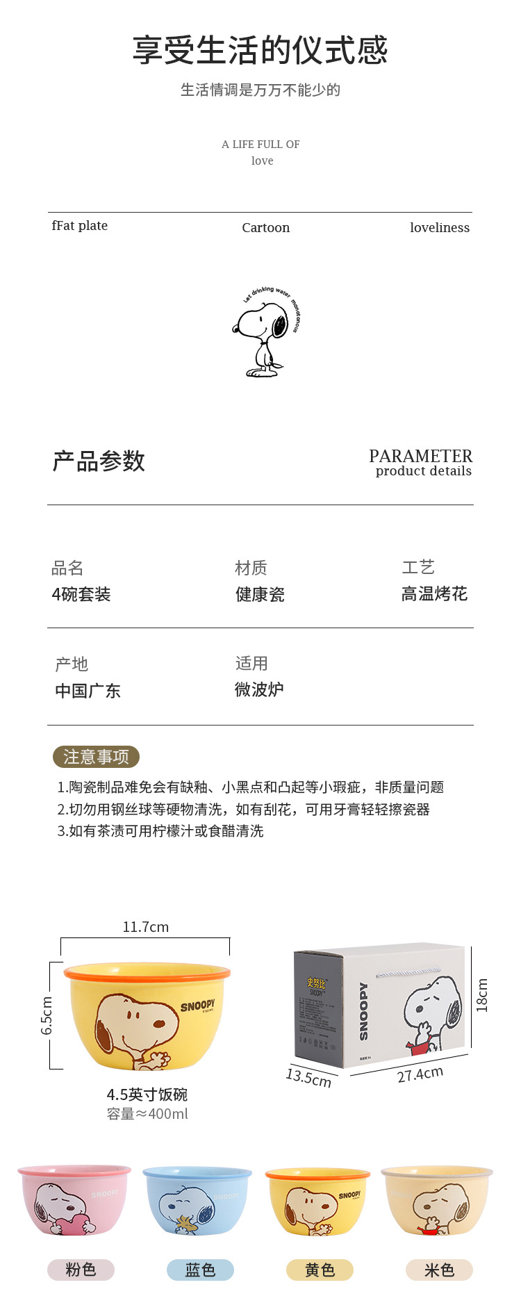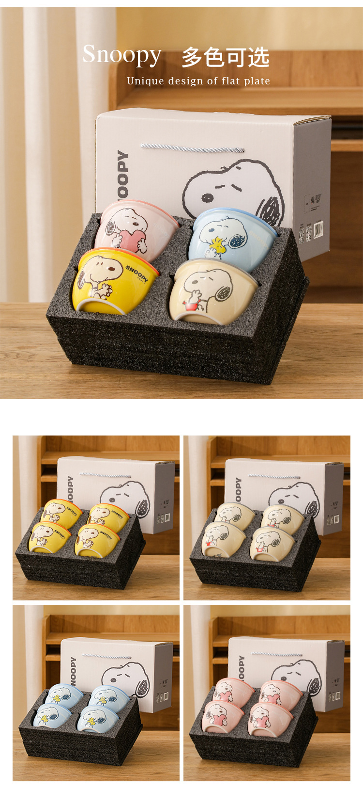 color: 4 bowl set snoopy-yellow-gift box, 4 bowl set history