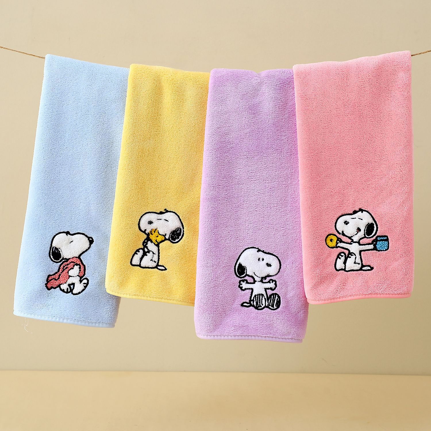 blue/reddish beige snoopy, yellow/toy snoopy, purple