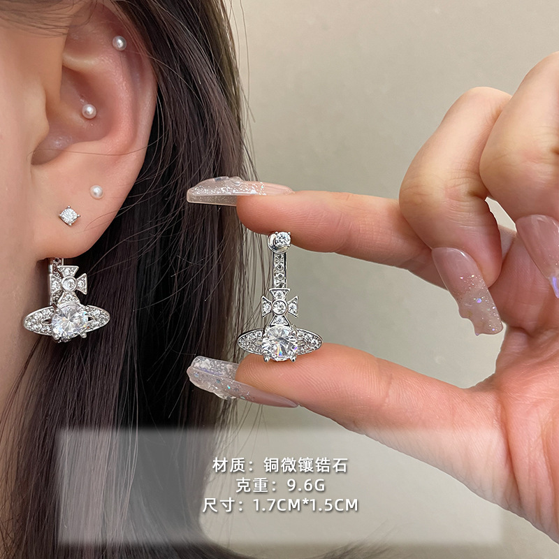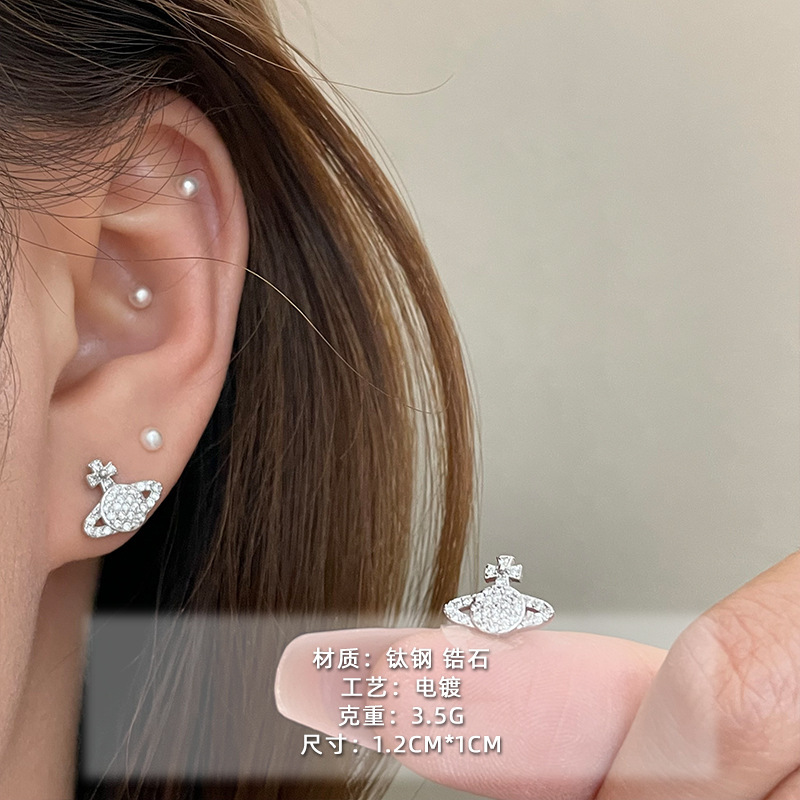 1614 electroplated silver-colored saturn pin studs [copper micro-inlaid zirconium style]