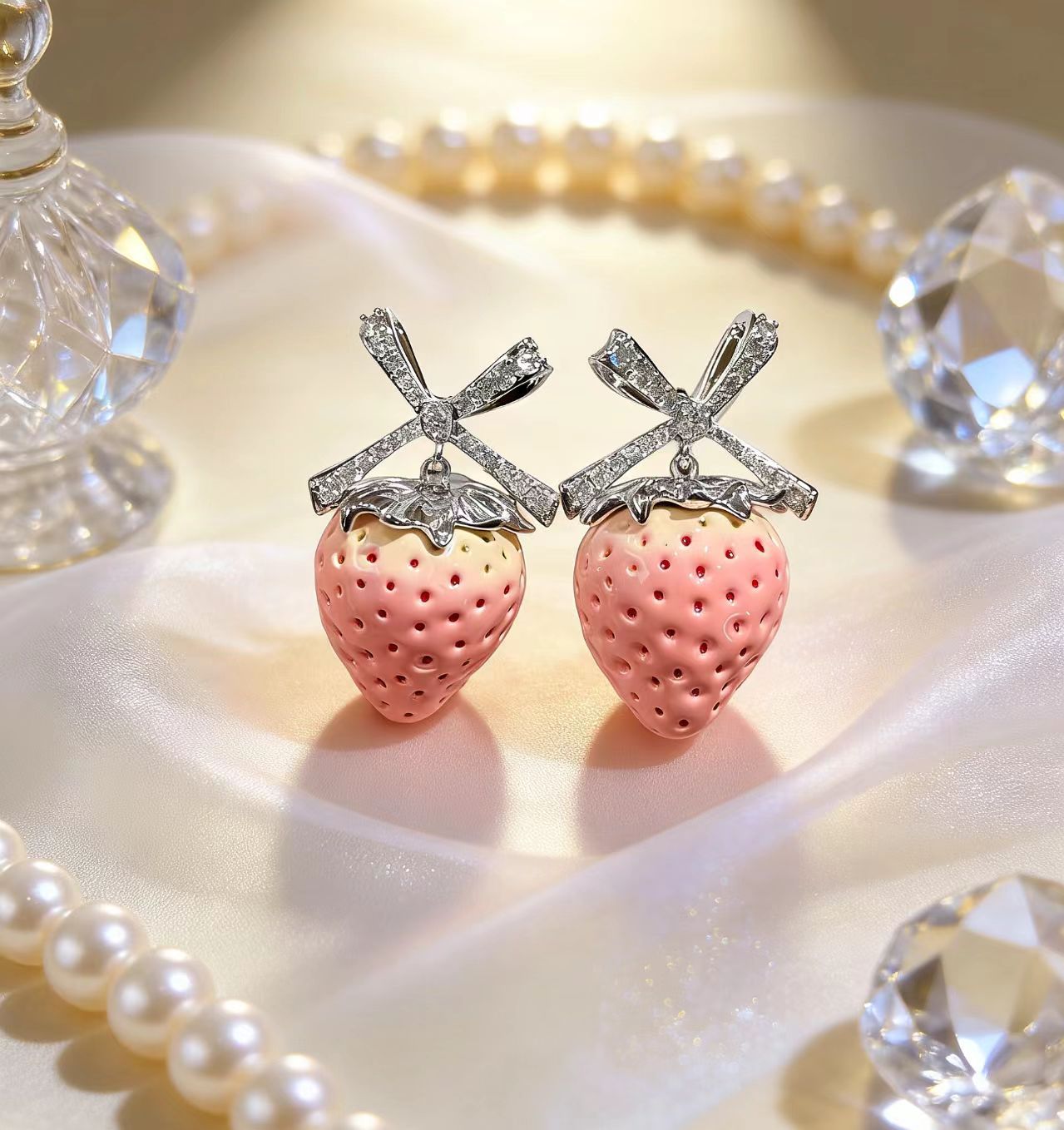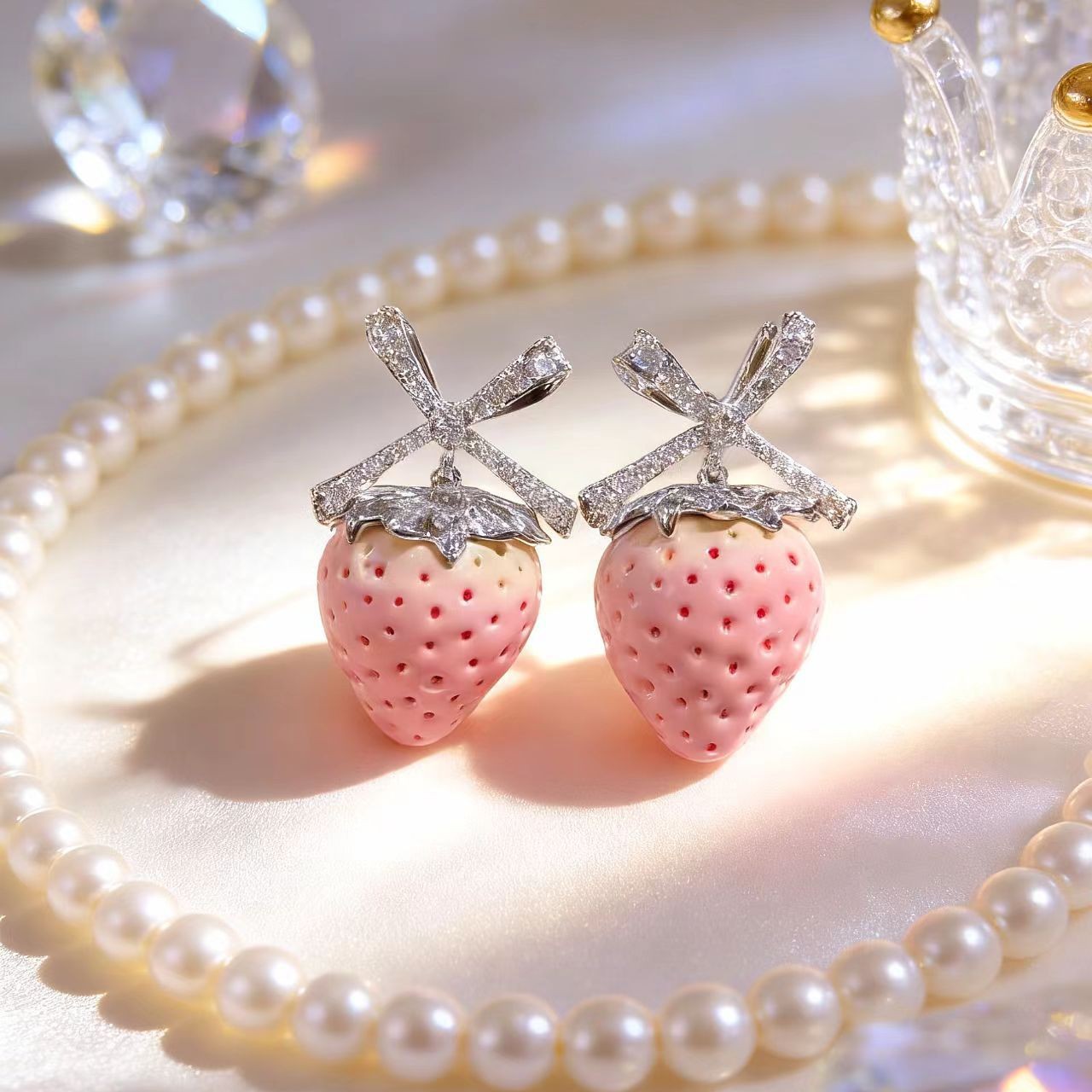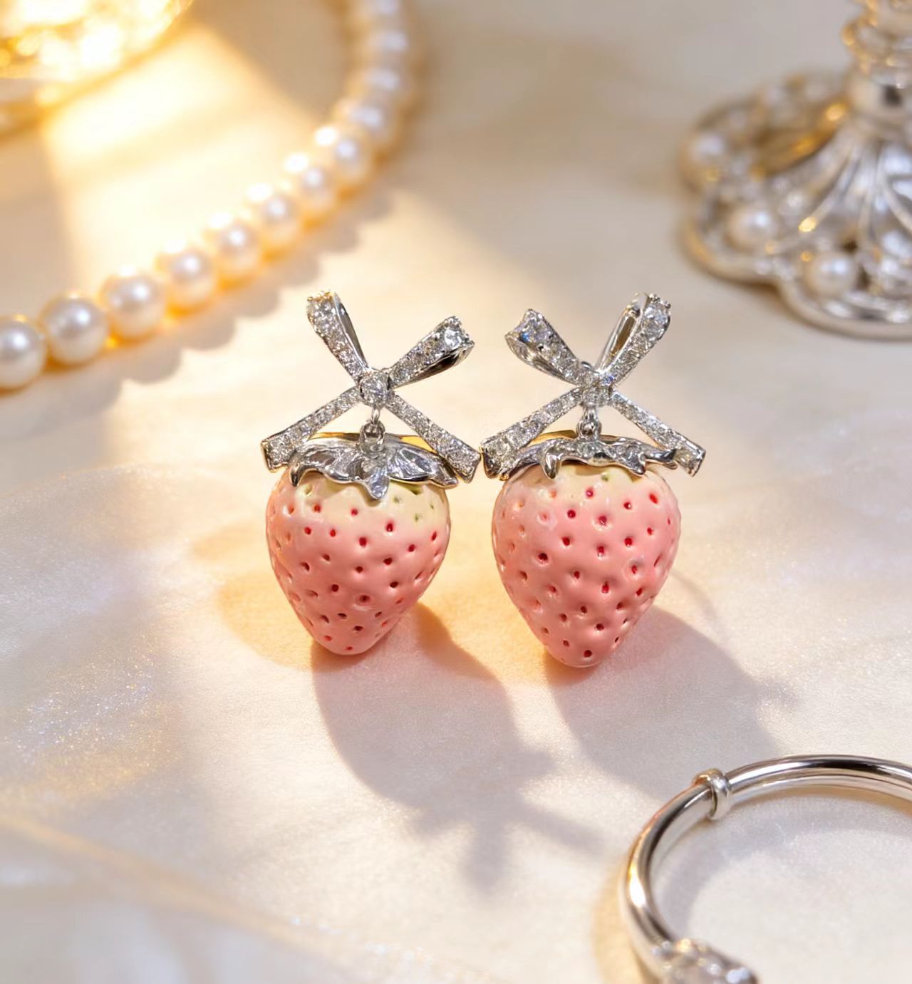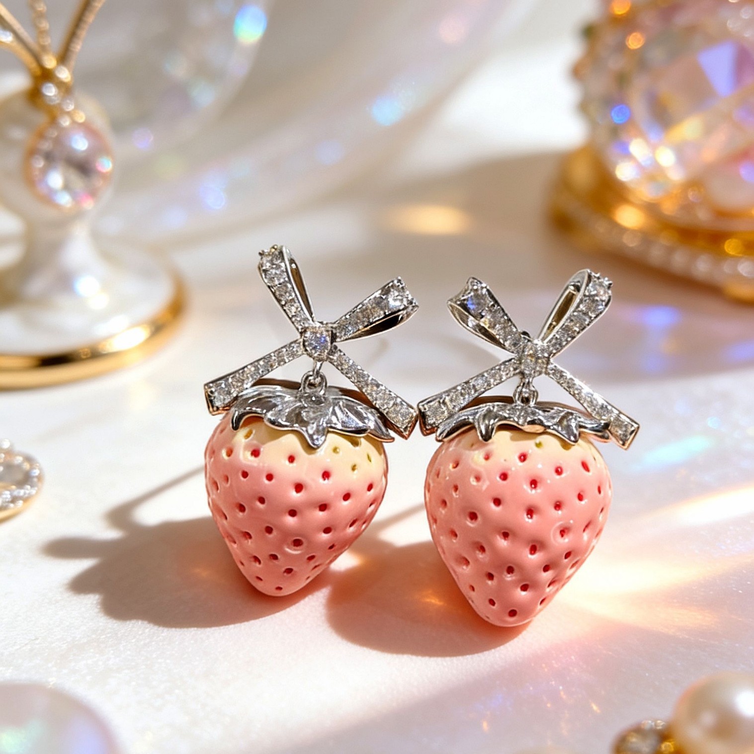 pink strawberry bow stud earrings