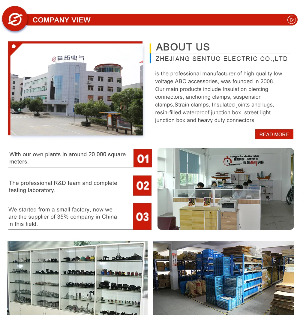 "company_description": "Zhejiang Sentuo Electric Co., Ltd. is a professional manufacturer of high-quality low-voltage ABC accessories, founded in 2008. It specializes in insulation piercing connectors, anchoring clamps, suspension
