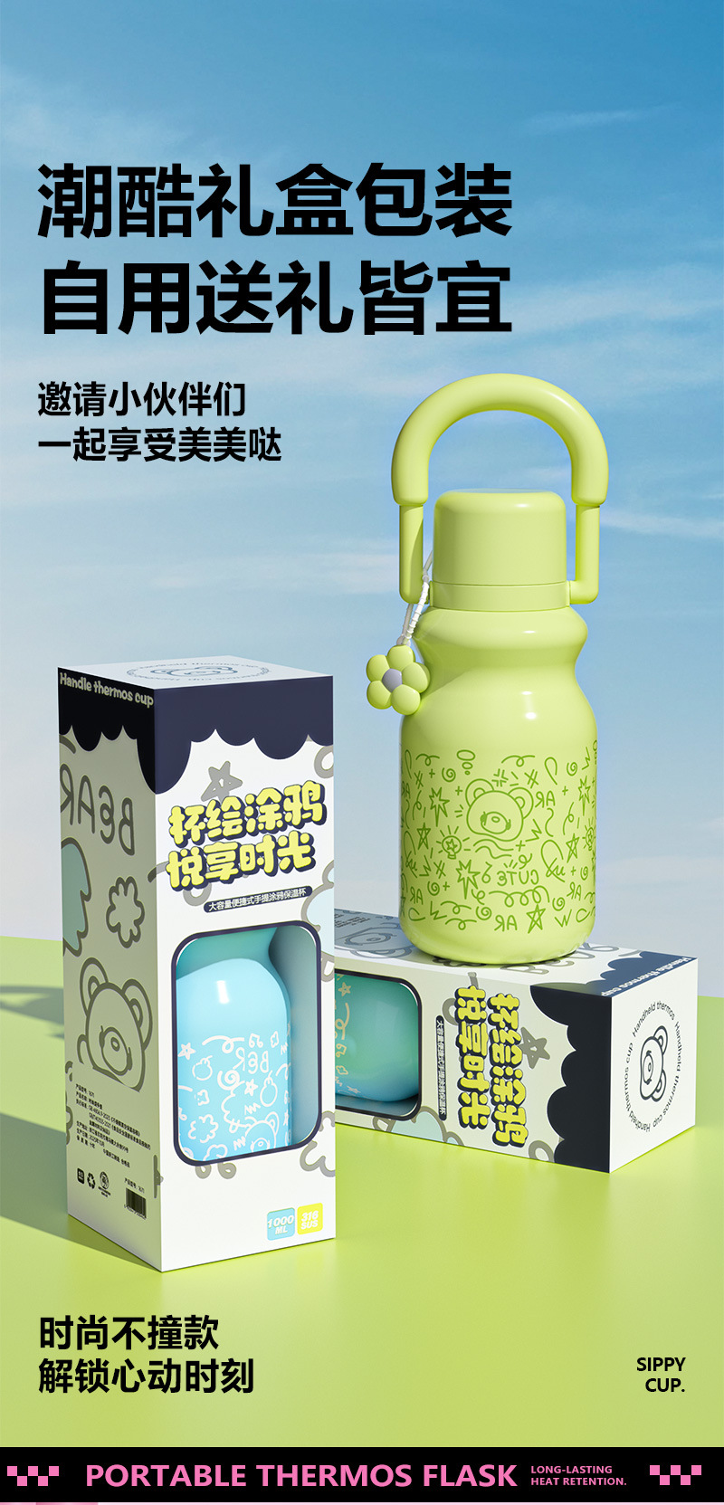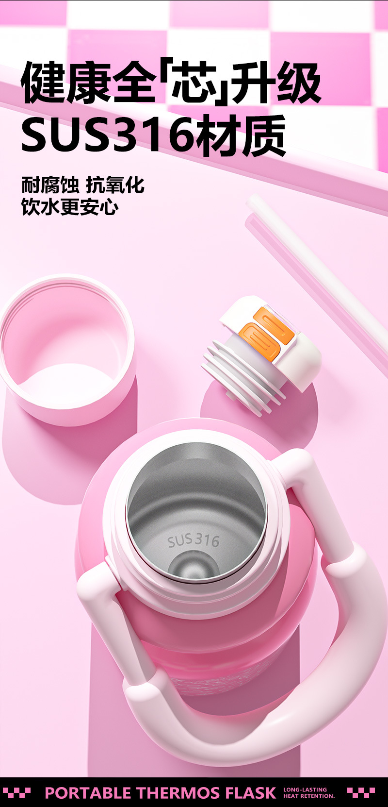 style: with handle, large capacity, with straw