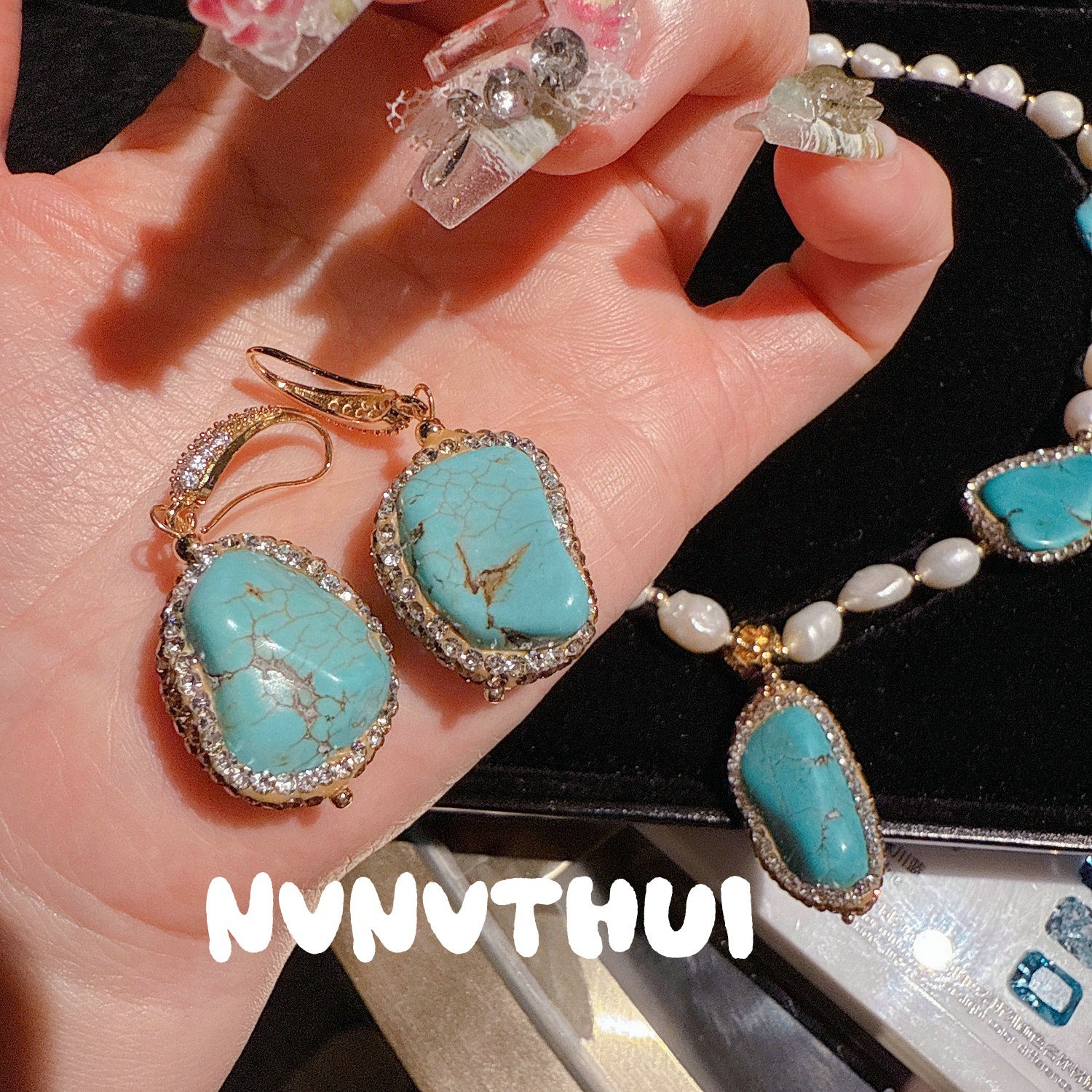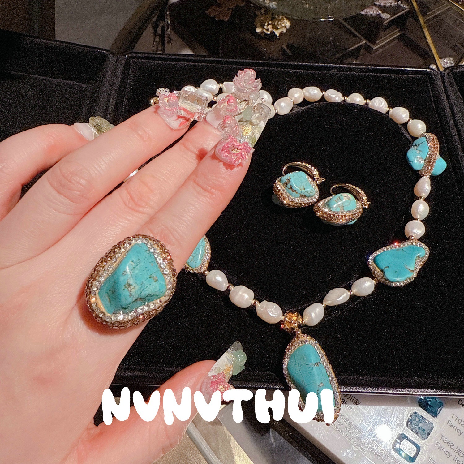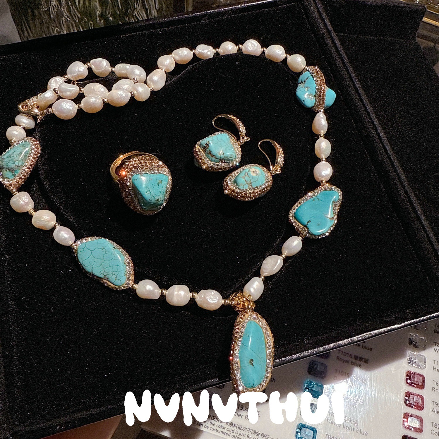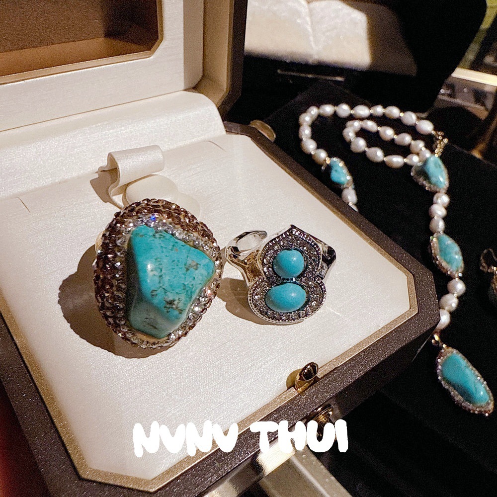 930ssi artificial turquoise pearl sweater chain + earrings + open ring ~ no box