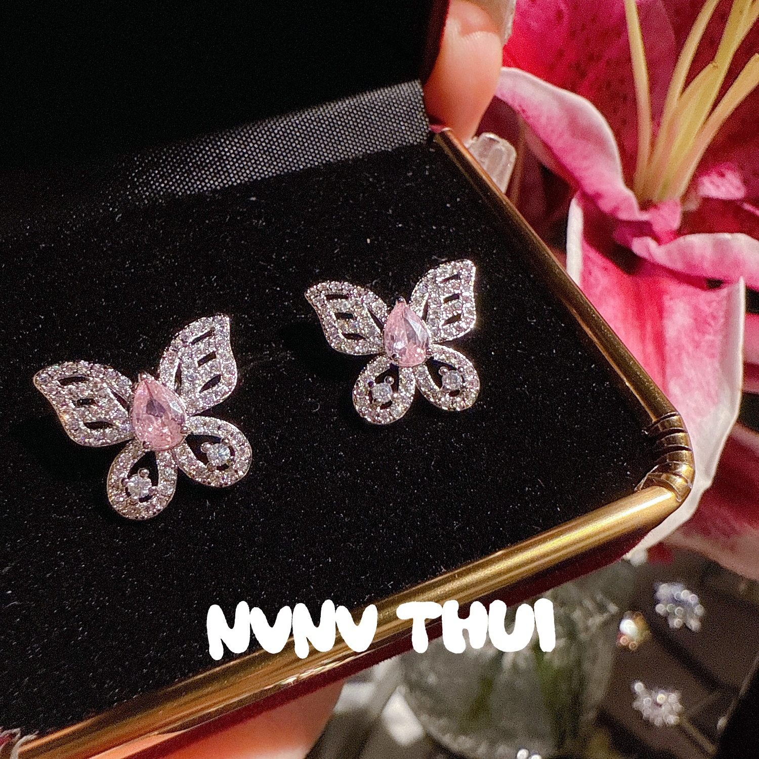 172zz [pink water drop butterfly] ear studs ~ no box