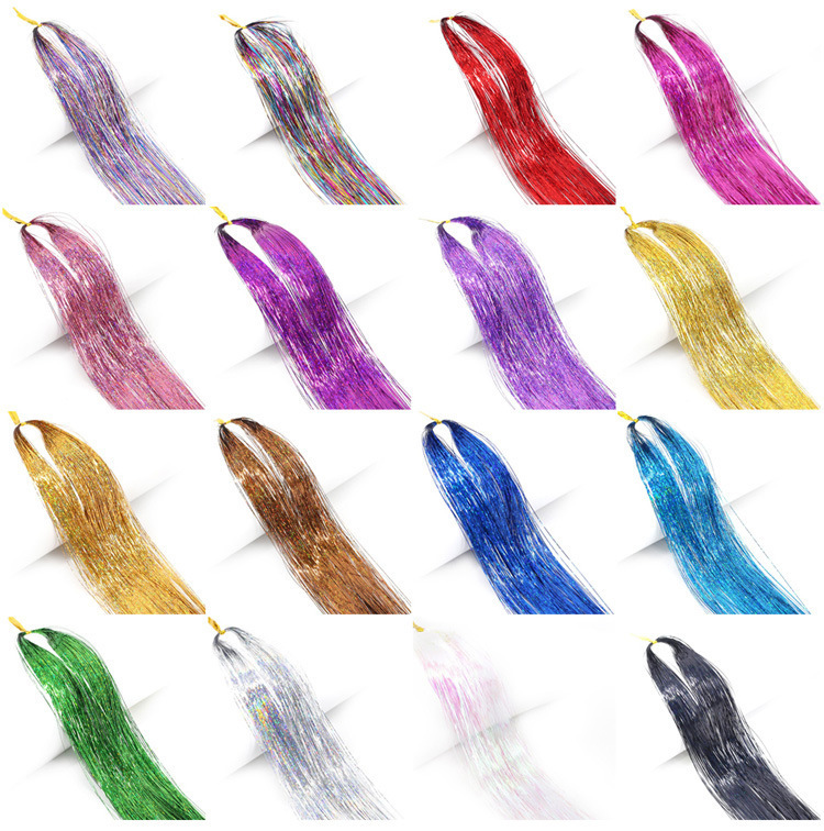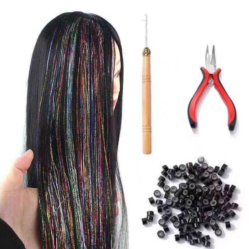 120cm laser hair strands in 12 colors [200 silicone clips + crochet hook + pliers]