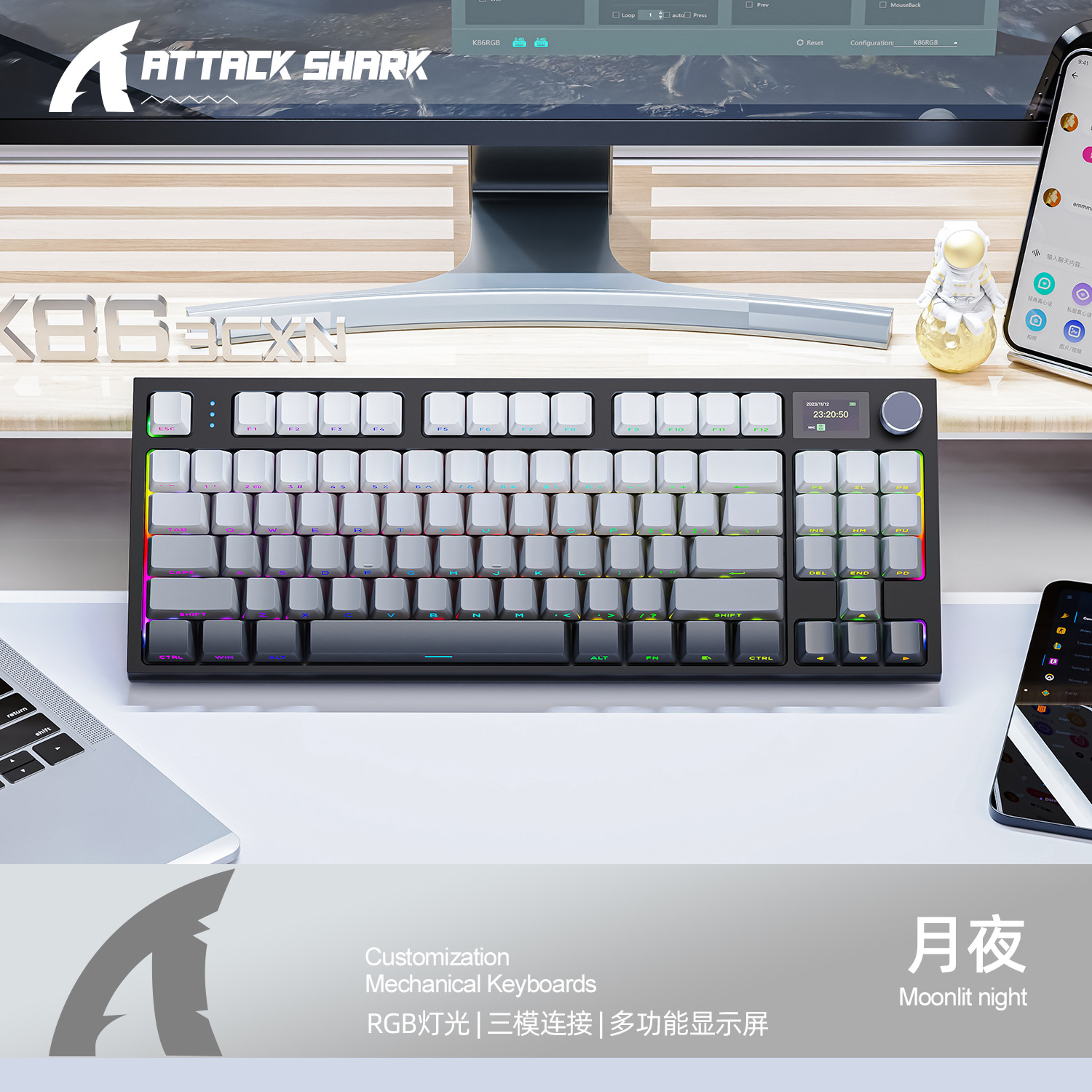 attack shark k86 tri-mode rgb keyboard, moonlit blue whale switches