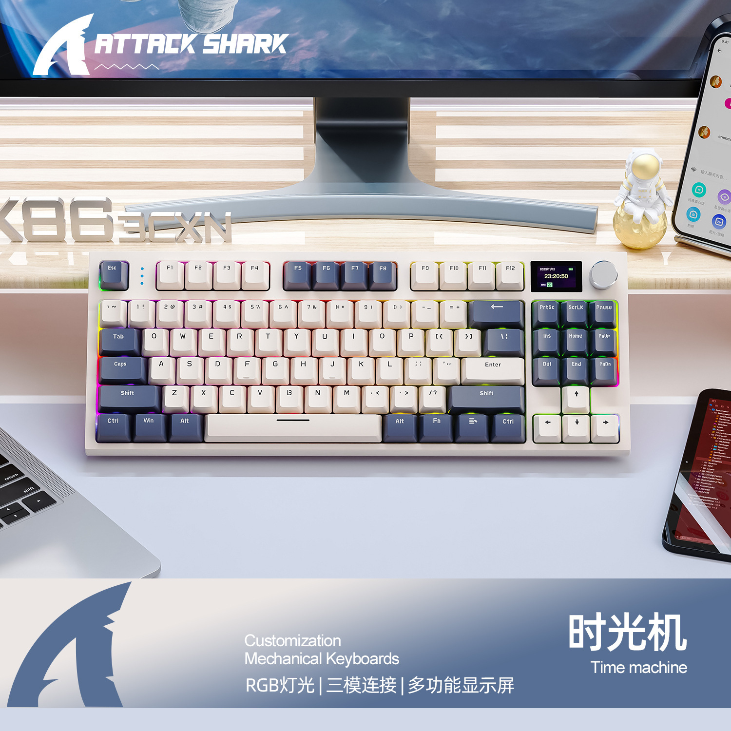 attack shark k86 tri-mode rgb keyboard with time machine blue whale switches