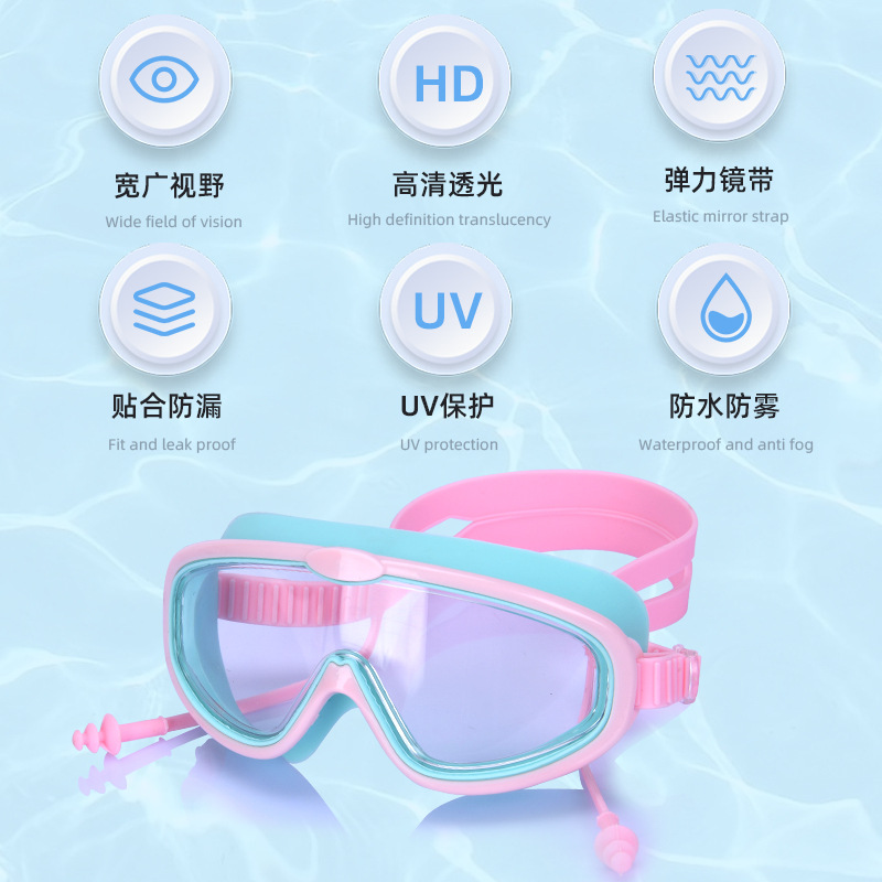 pink goggles + nasal splint earplugs + swimming goggle box