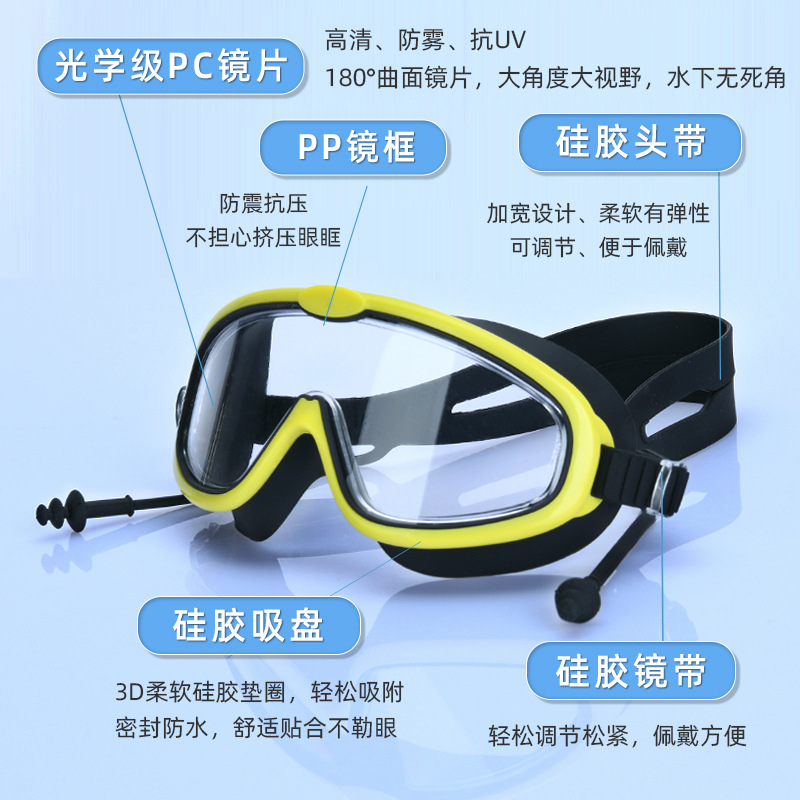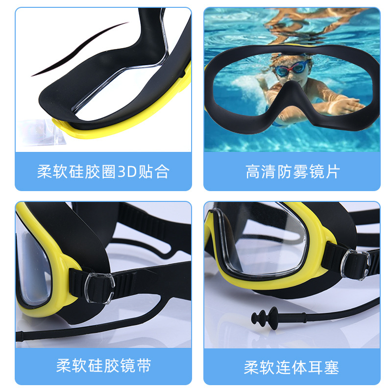 black and yellow goggles + nasal splint earplugs + swimming goggle box