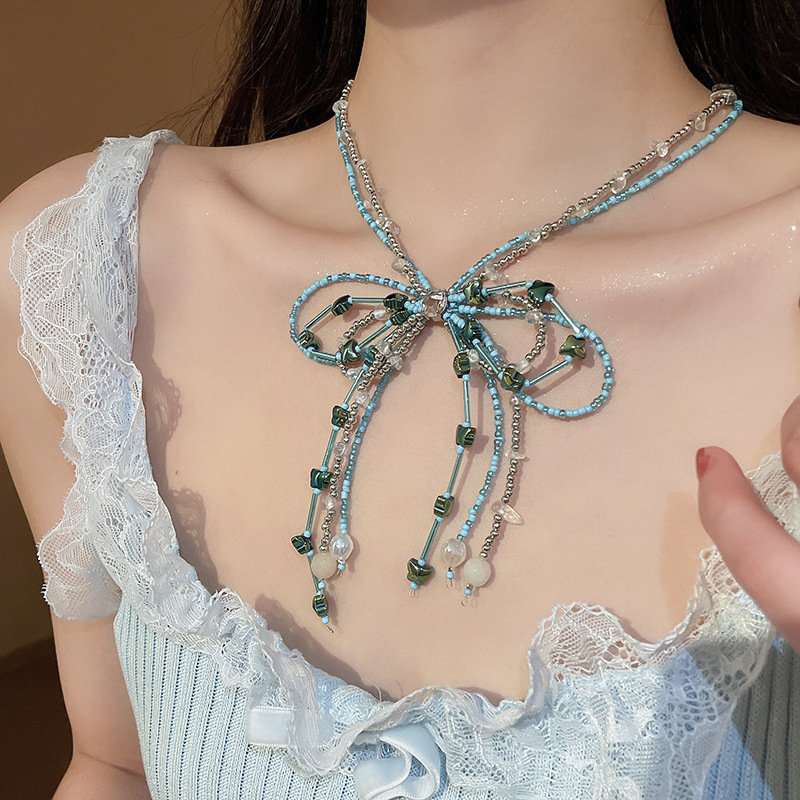50# necklace-silver-blue-bow knot