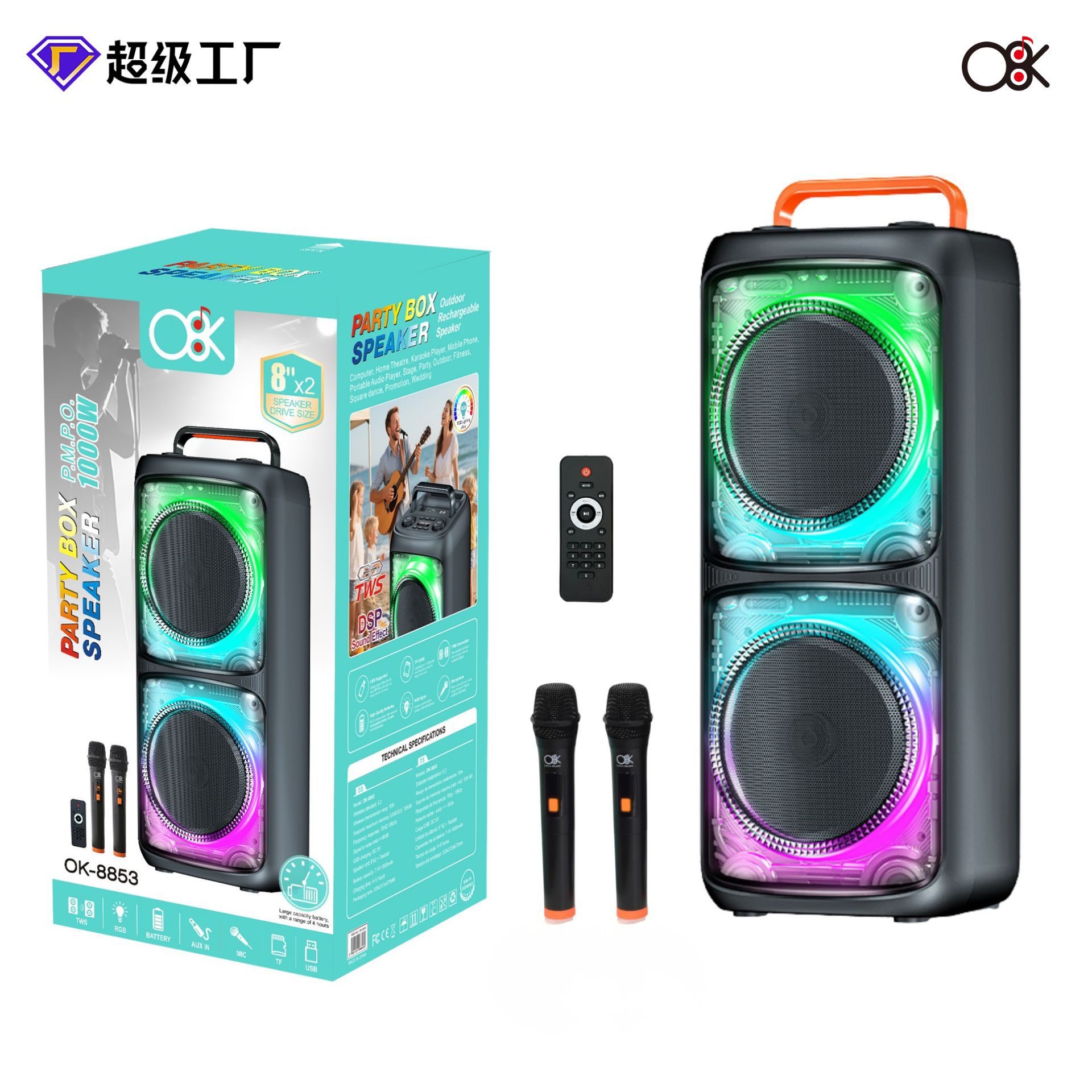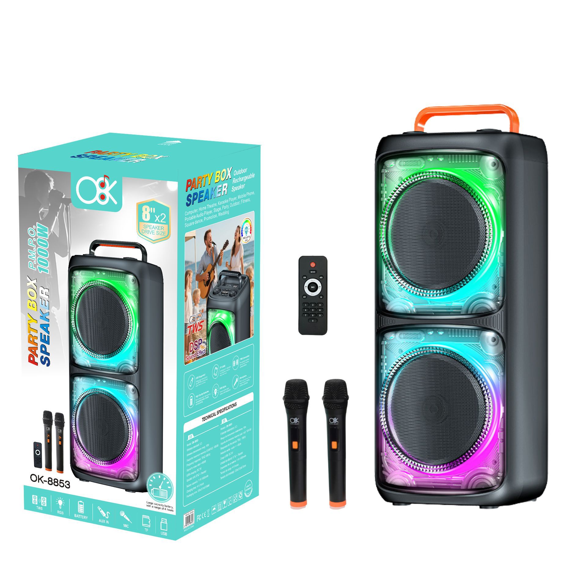accessories: wireless microphone x2, remote control, charging cable