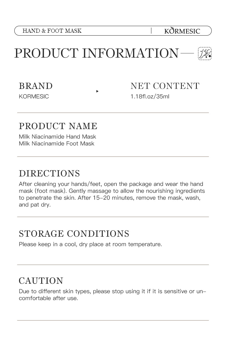 product specifications: kormesic milk nicotinamide hand mask 35ml [