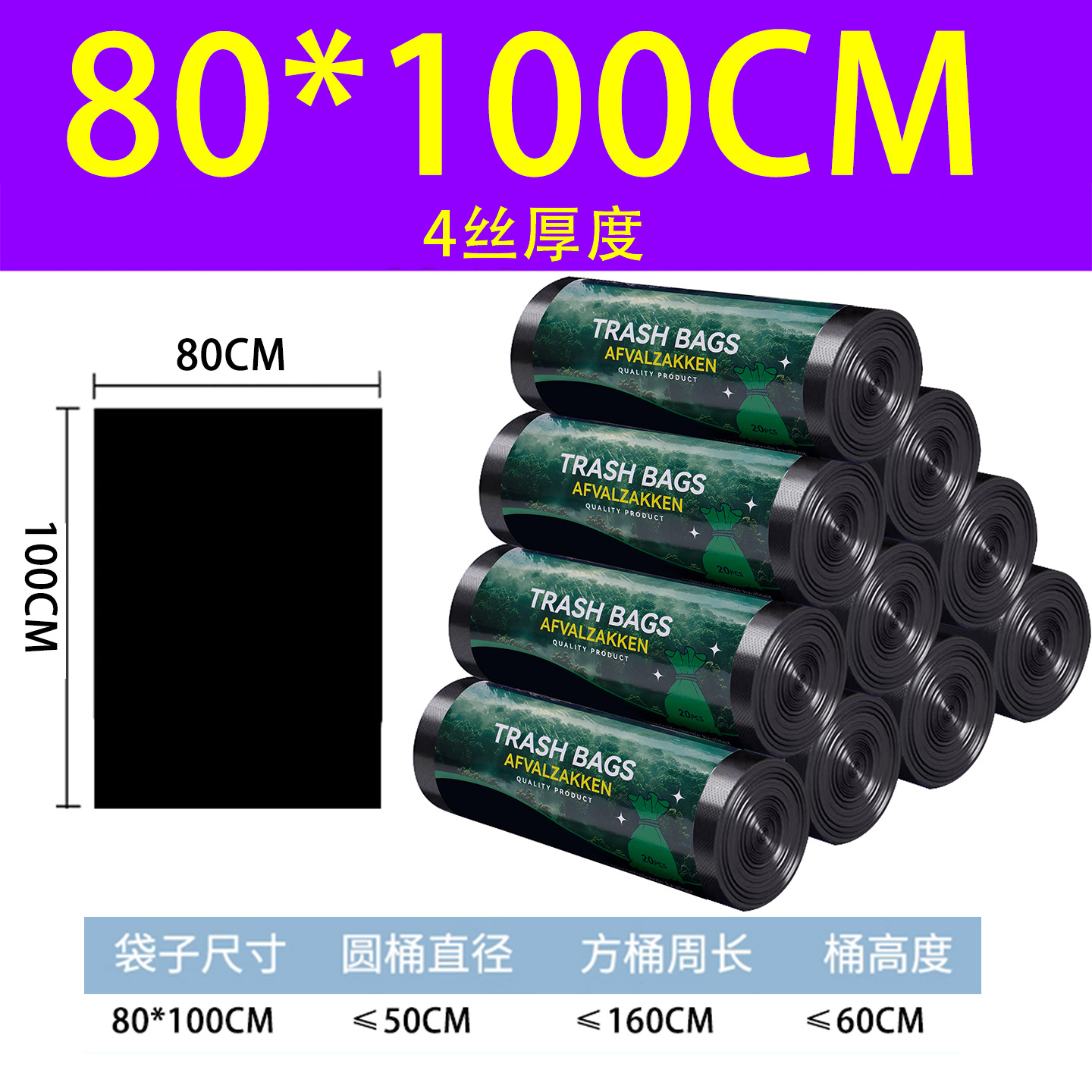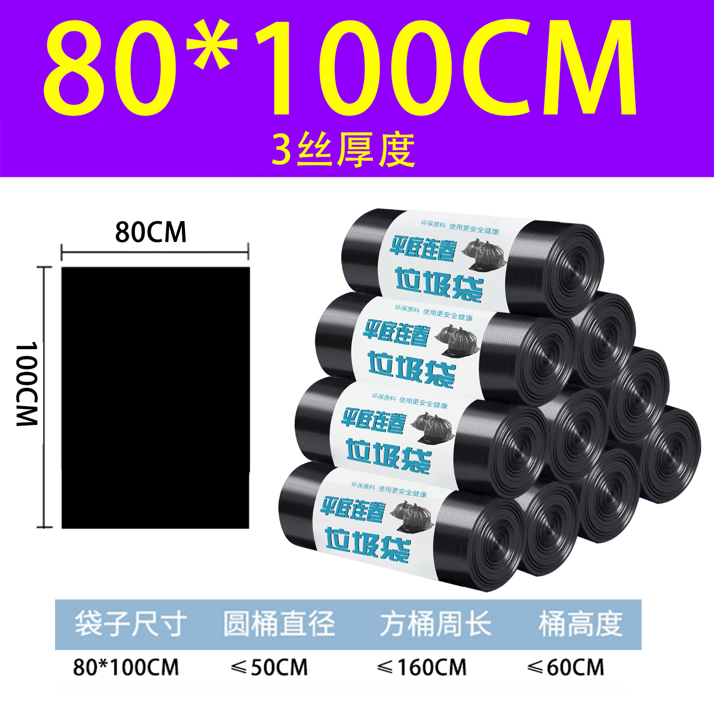 80*100 japanese-style (4-mil thickness), 5 rolls per bag, 100 pieces per bag.