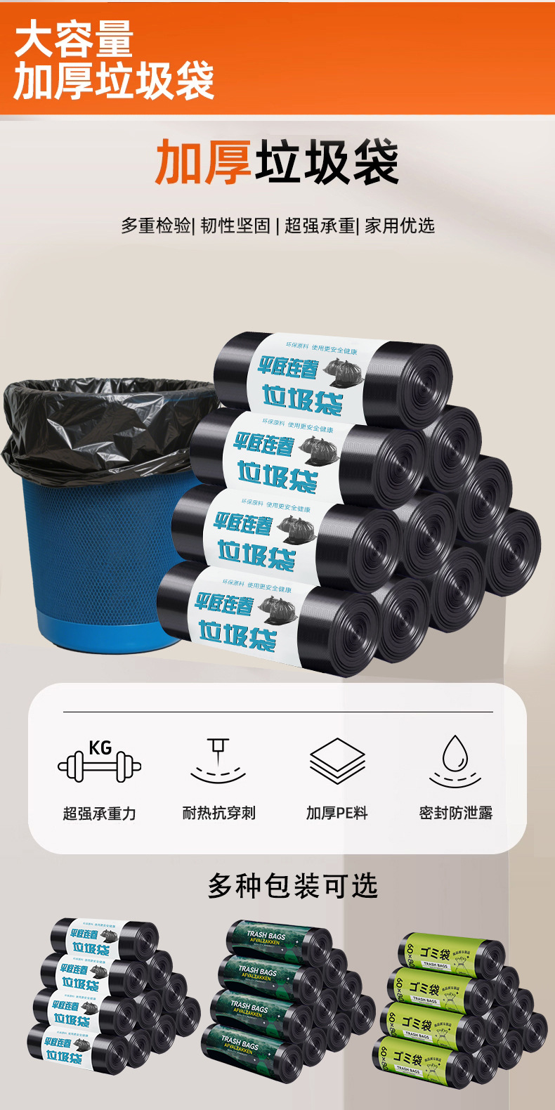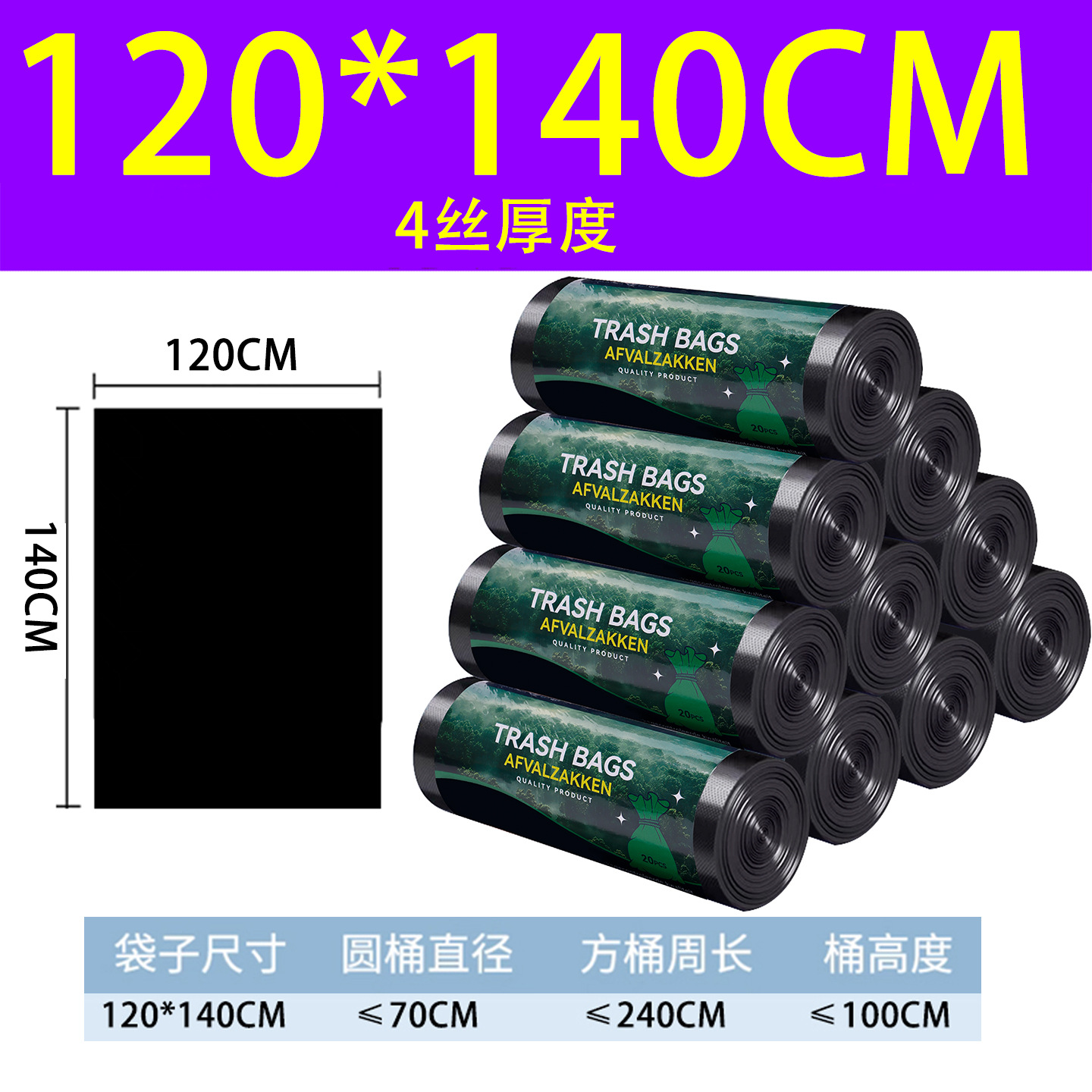 120*140 japanese-style (3-mil thickness), 10 rolls per bag, 100 bags.