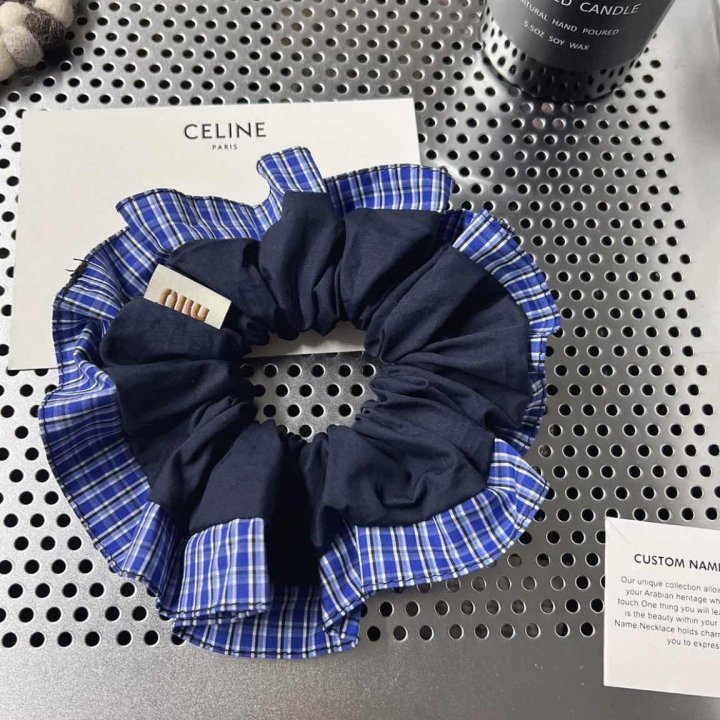 20# blue plaid black-edged four-layer hair tie, approximately 15 cm.