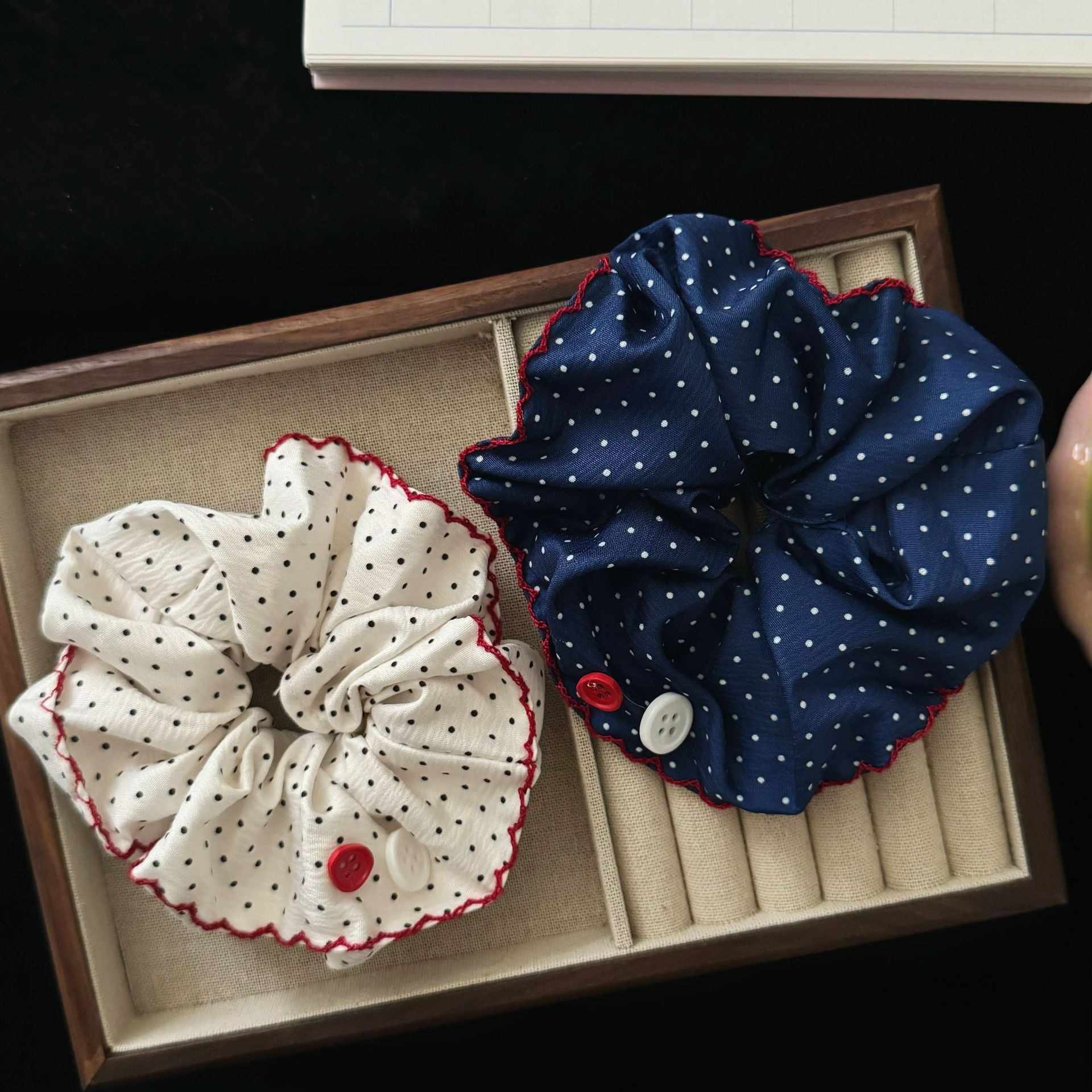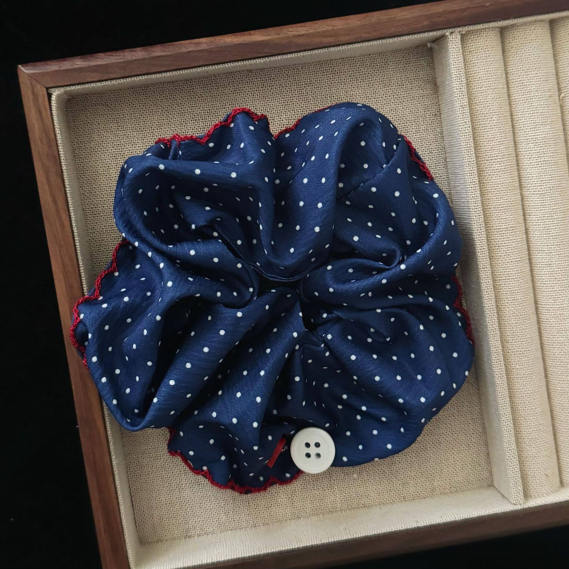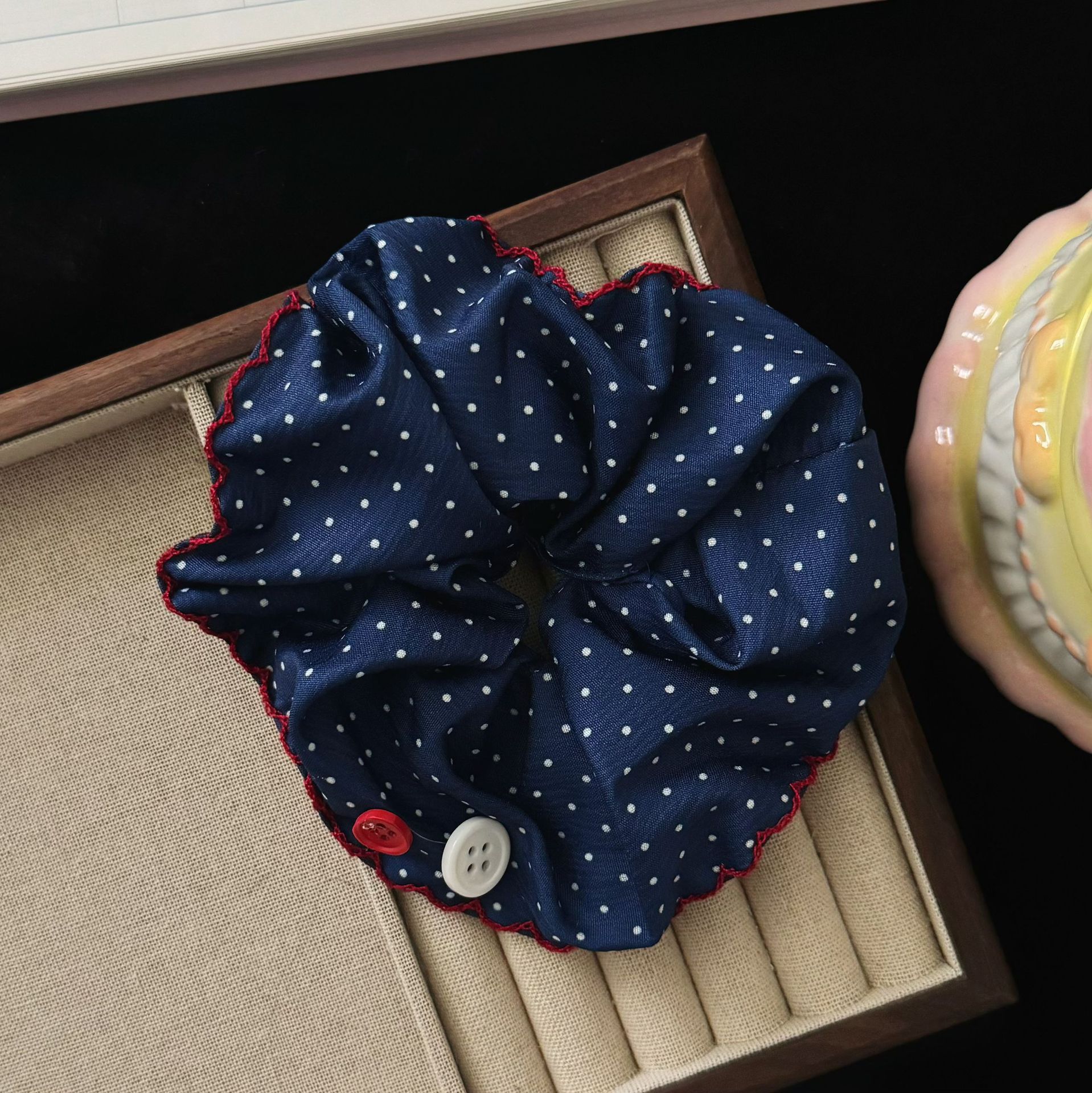 navy blue polka-dot button hair tie