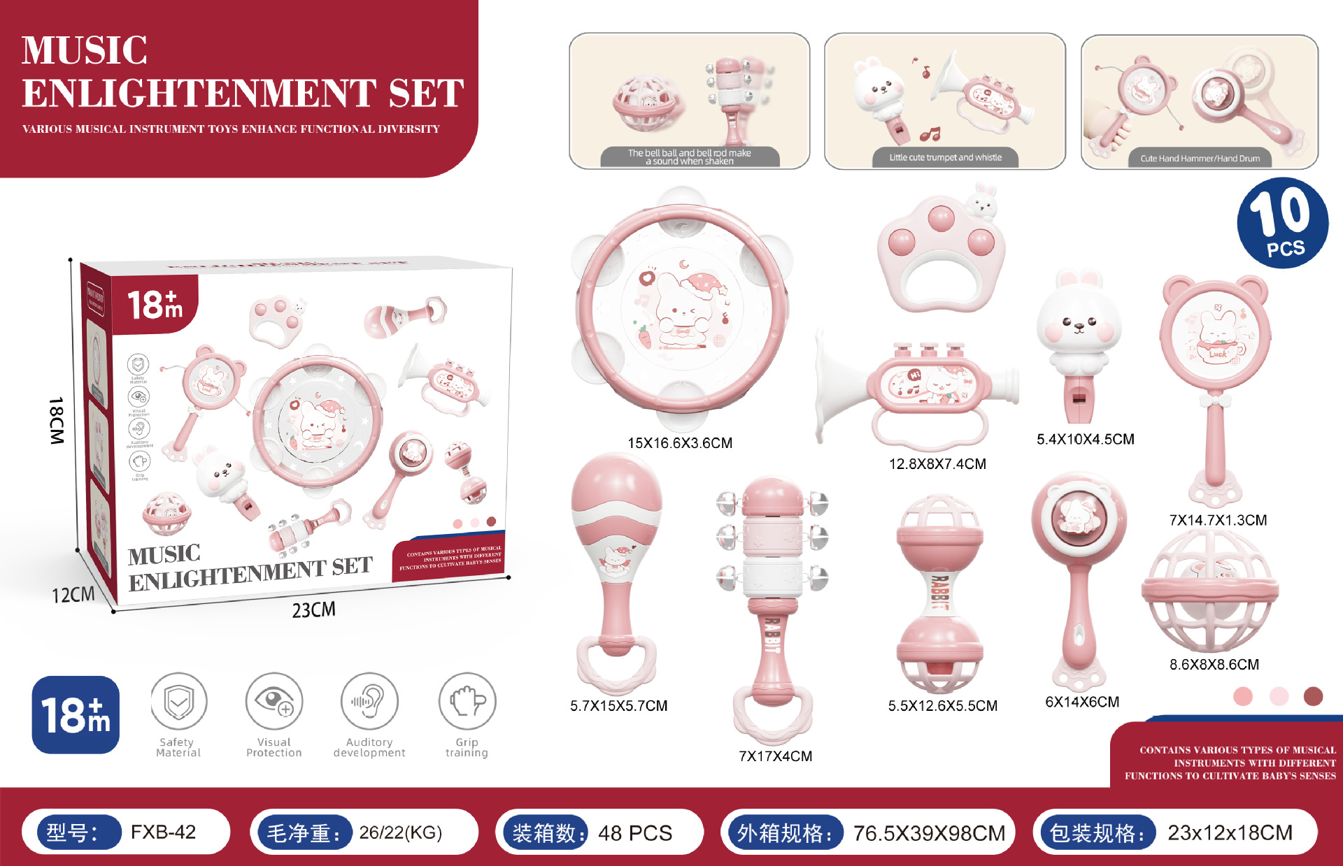 pink rabbit [10 pcs set rattle instruments] chinese color box