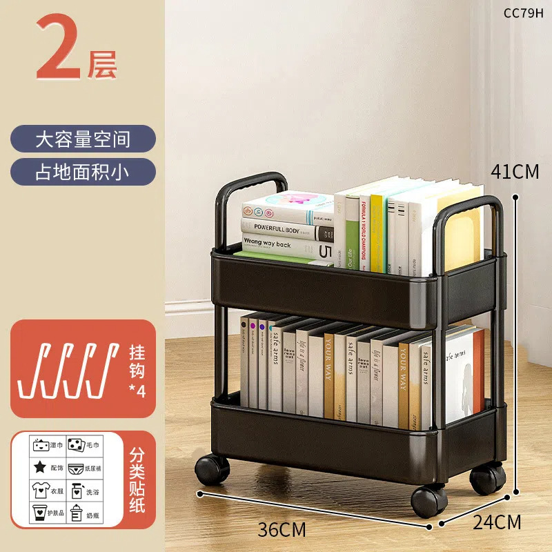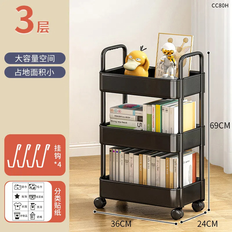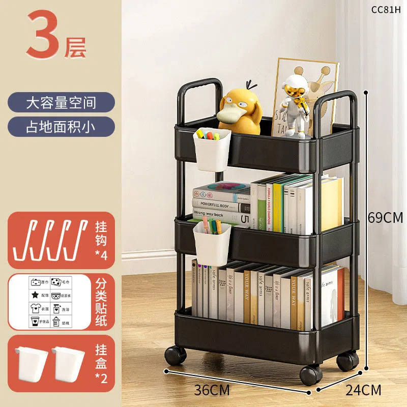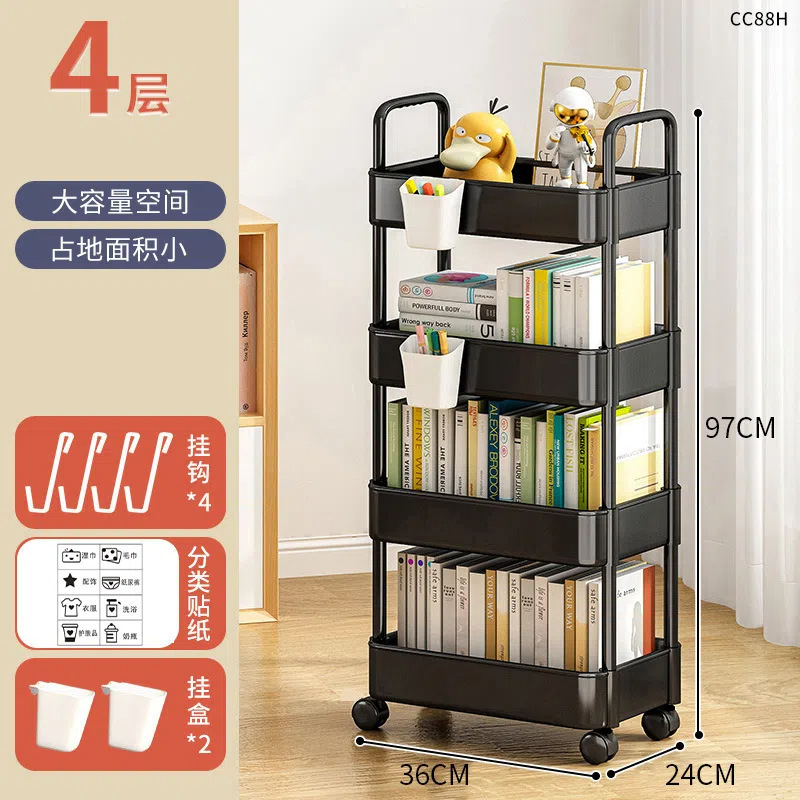 four-tier black (with wheels + hooks + stickers), no brakes