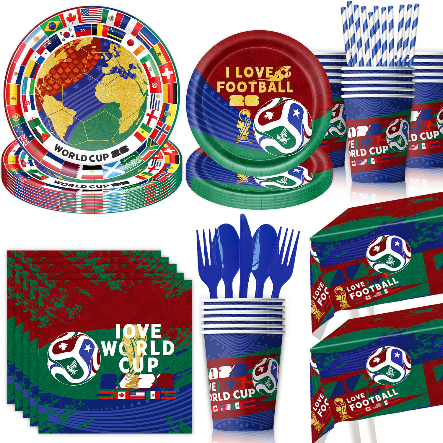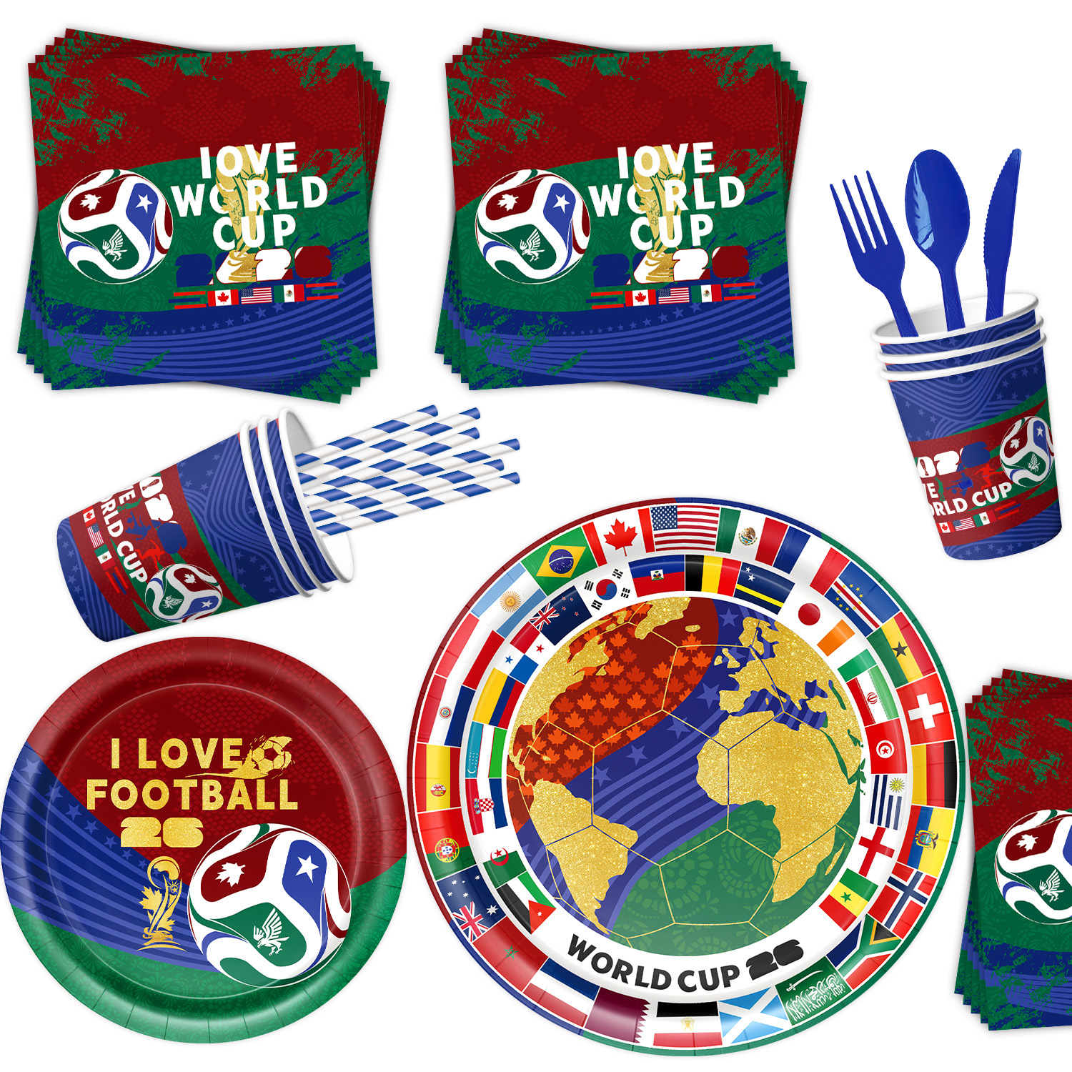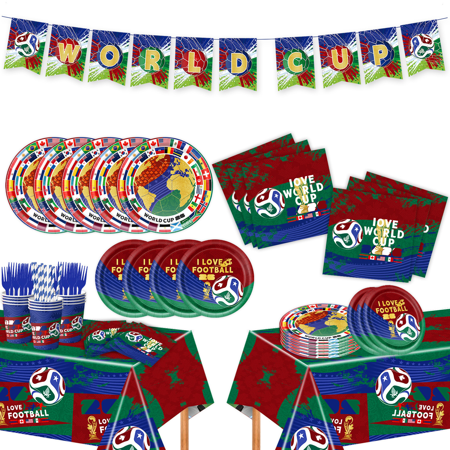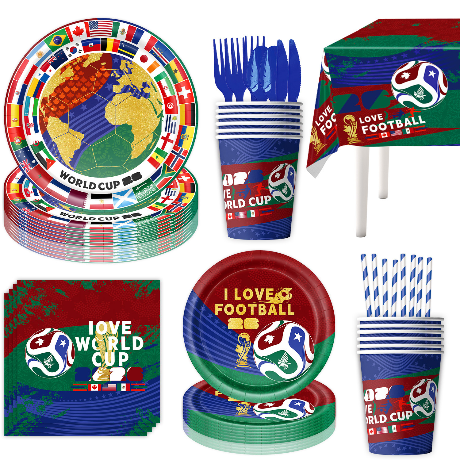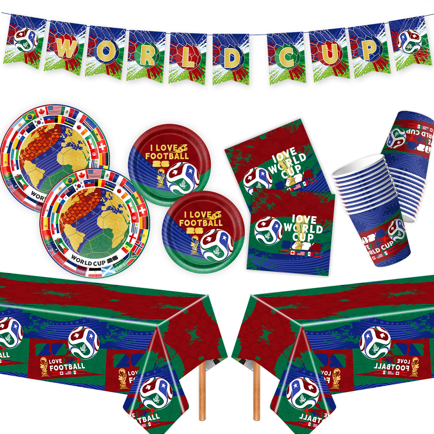world cup 10-piece set (7-inch + 9-inch + hanging flag + paper napkins + paper cups + knife, fork and spoon straws + tablecloth)
