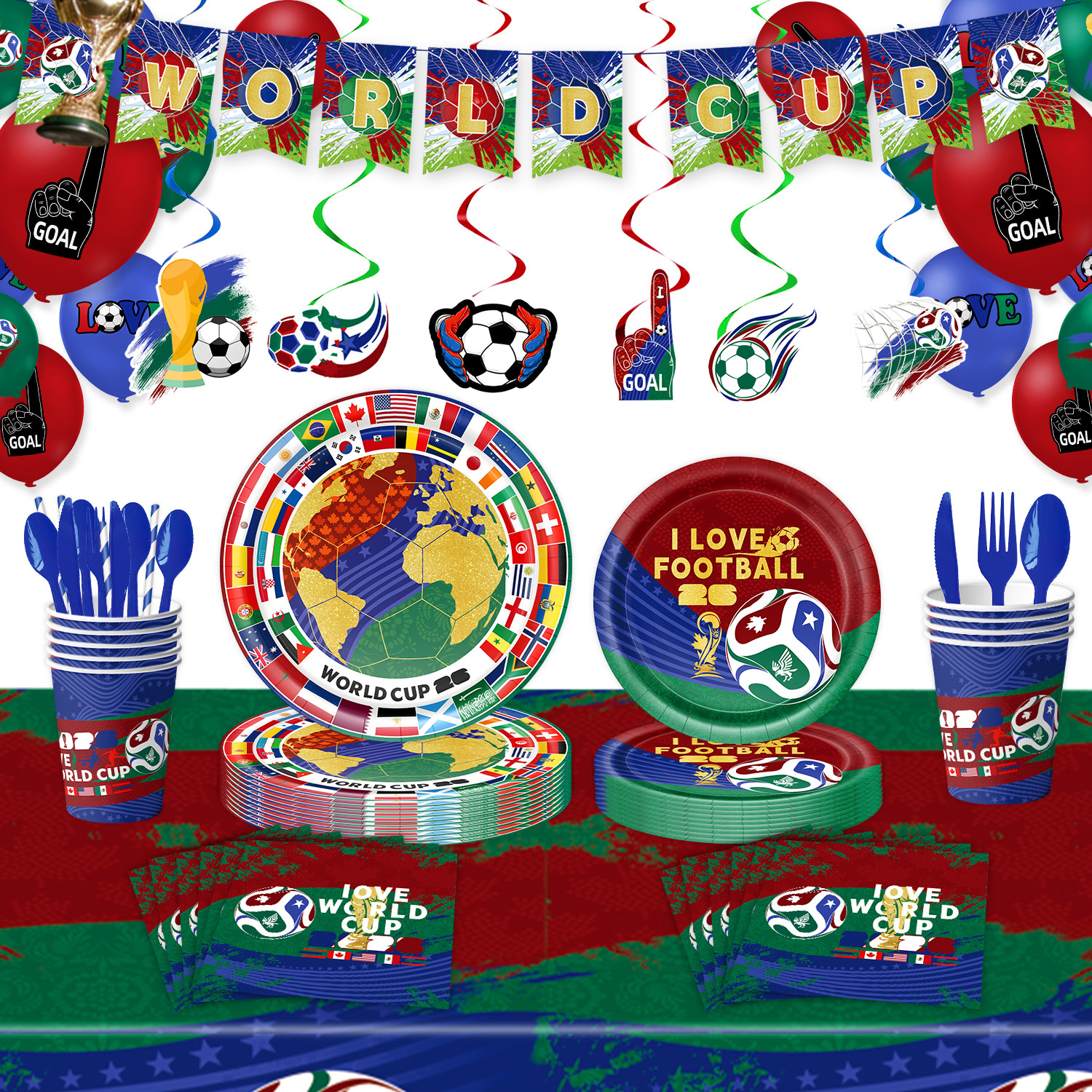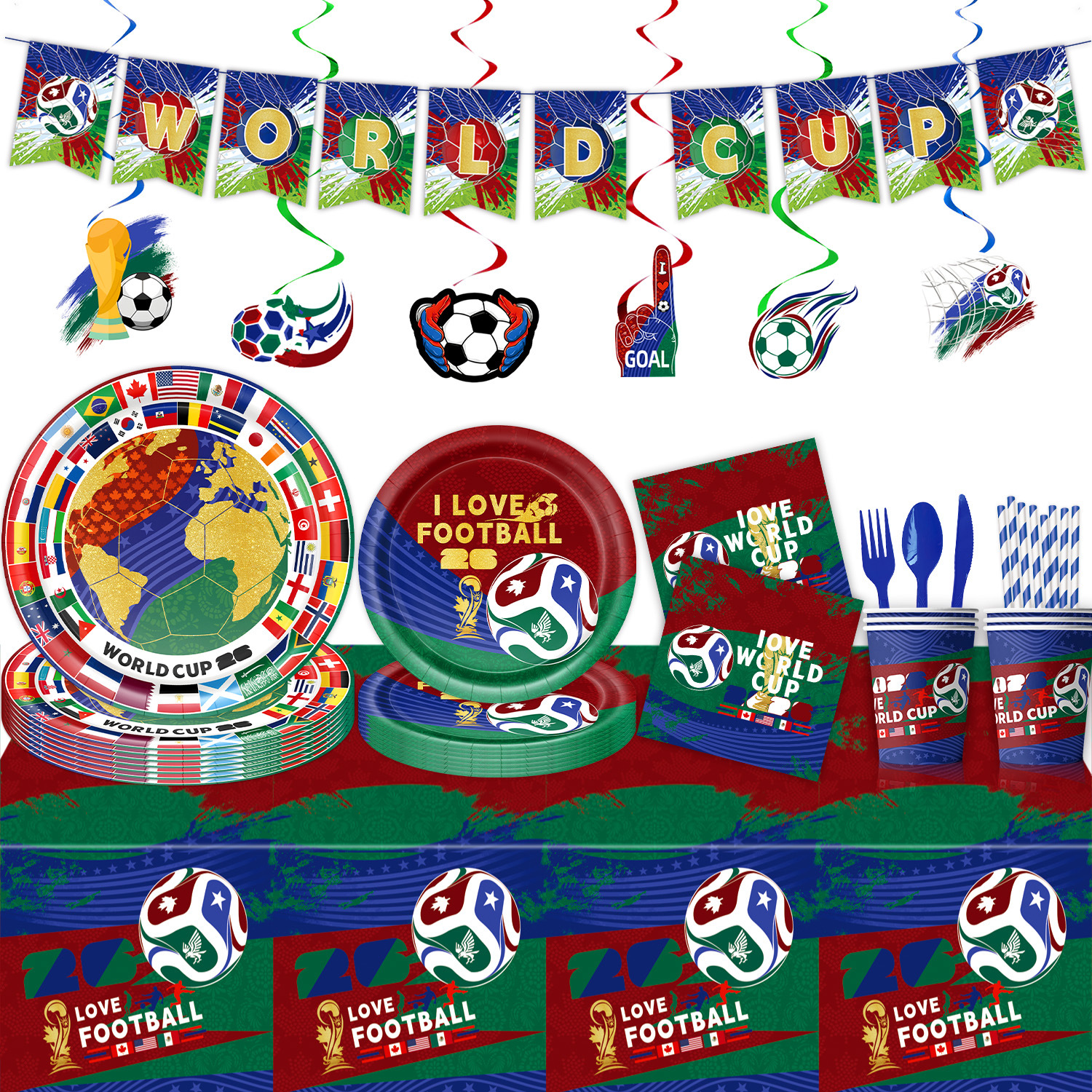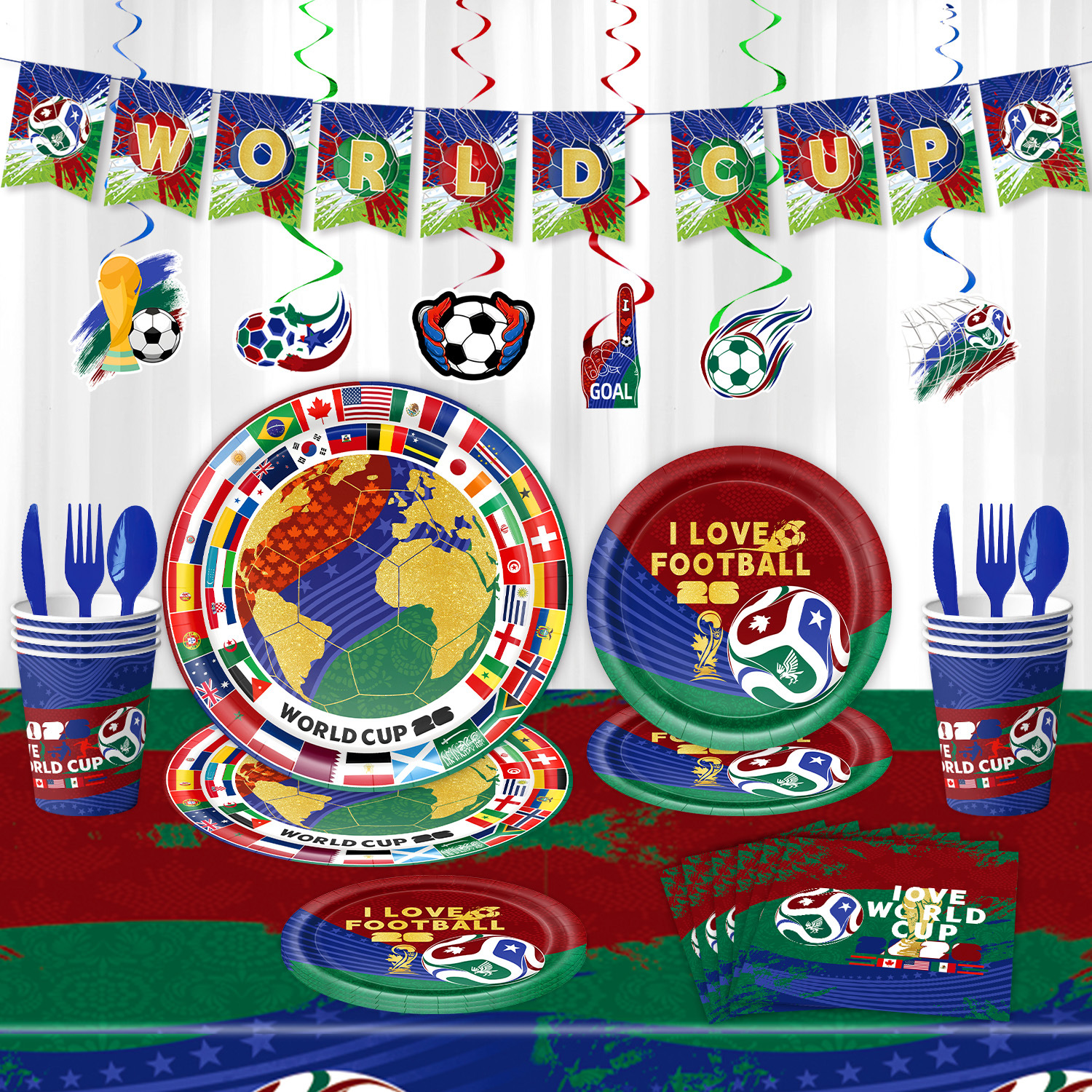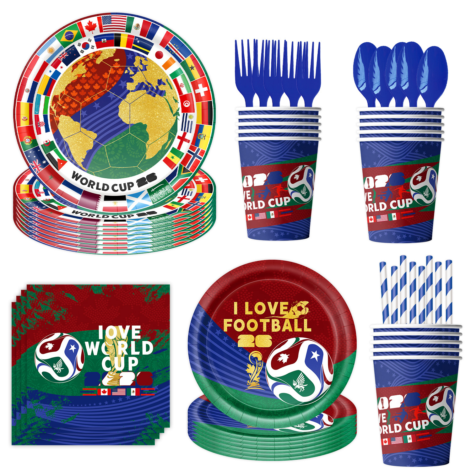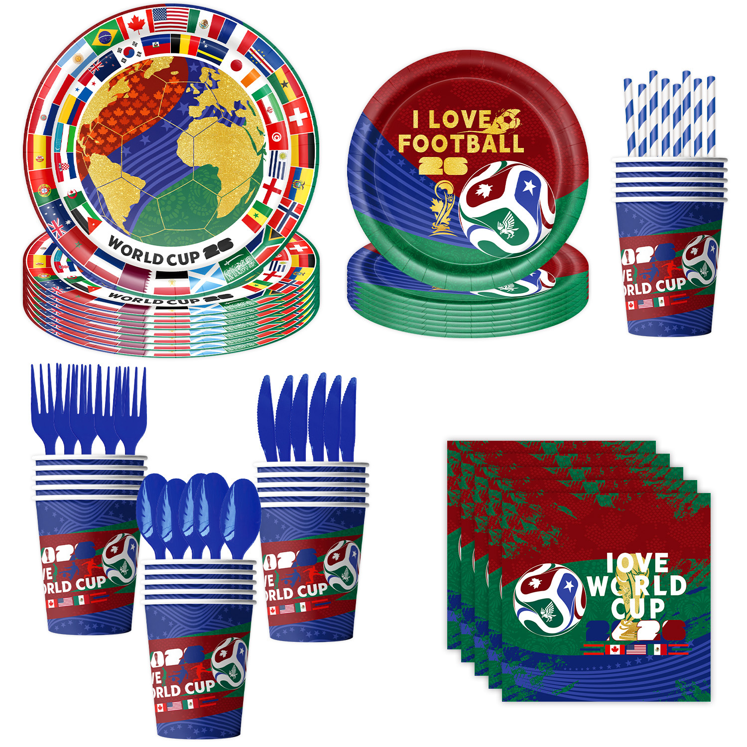 world cup 10-piece set (7-inch + 9-inch + hanging flag + paper napkins + paper cups + knife, fork and spoon straws + tablecloth)