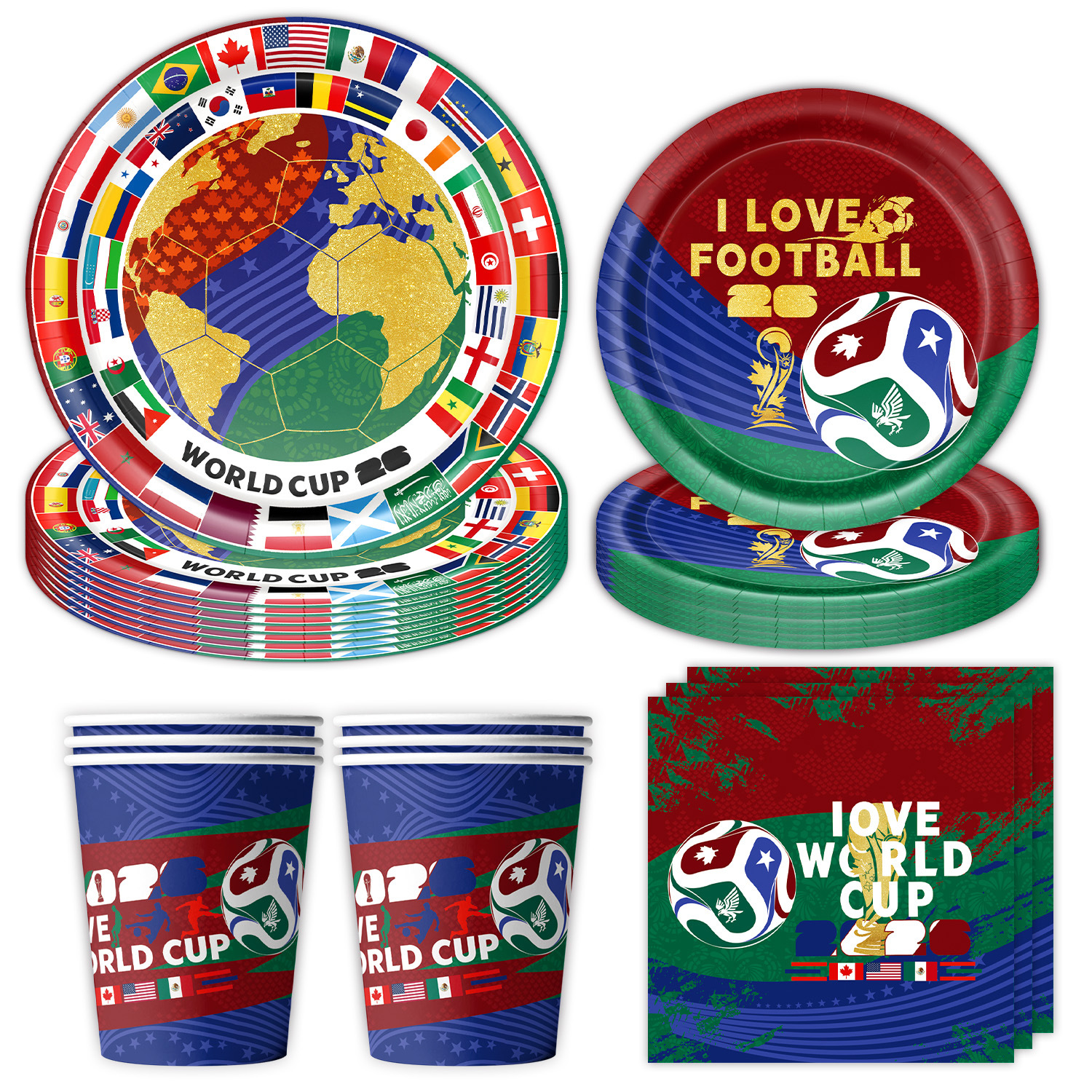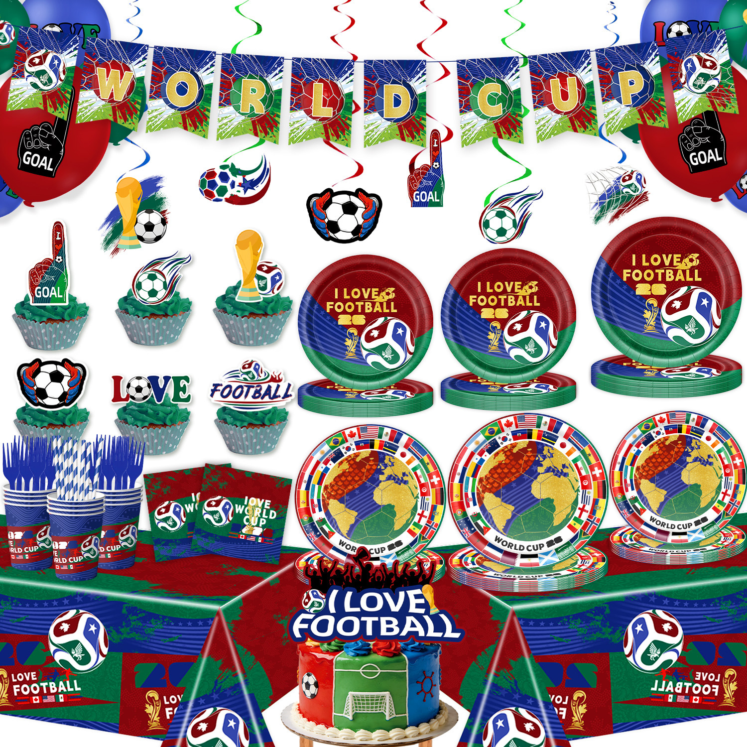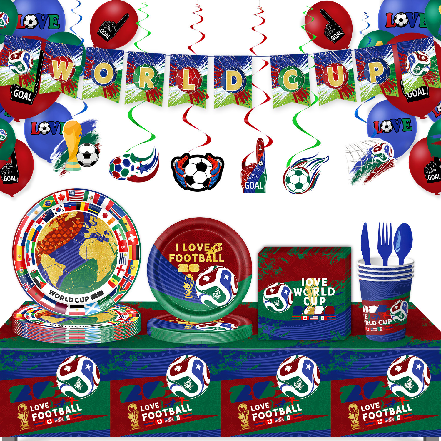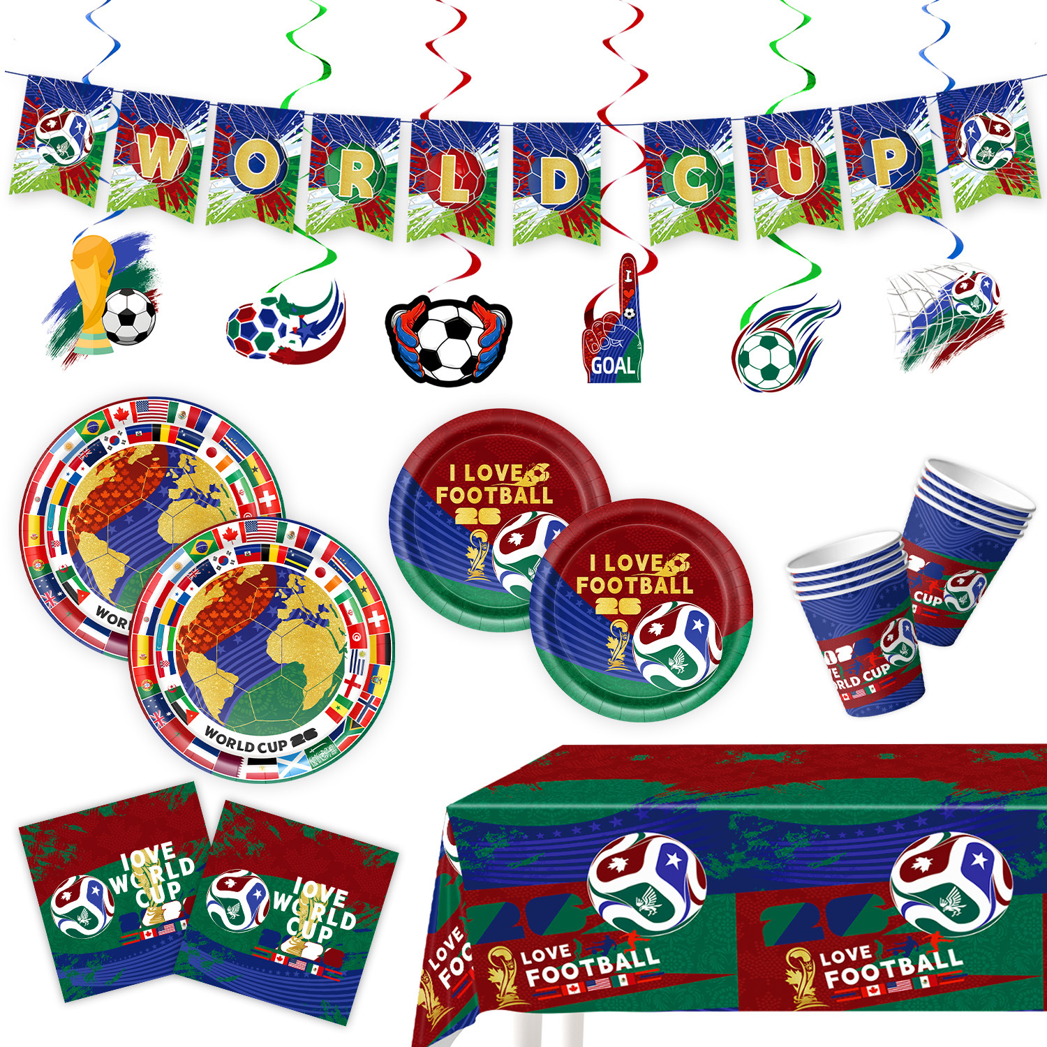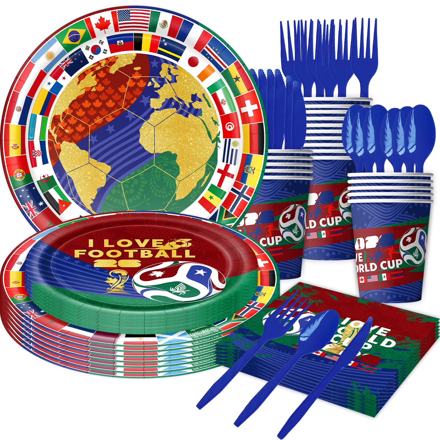 world cup 10-piece set (7-inch + 9-inch + hanging flag + paper napkins + paper cups + knife, fork and spoon straws + tablecloth)