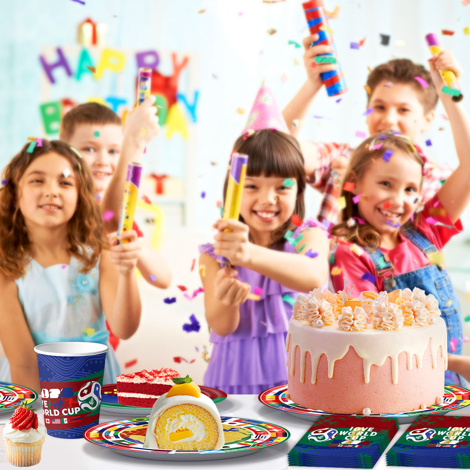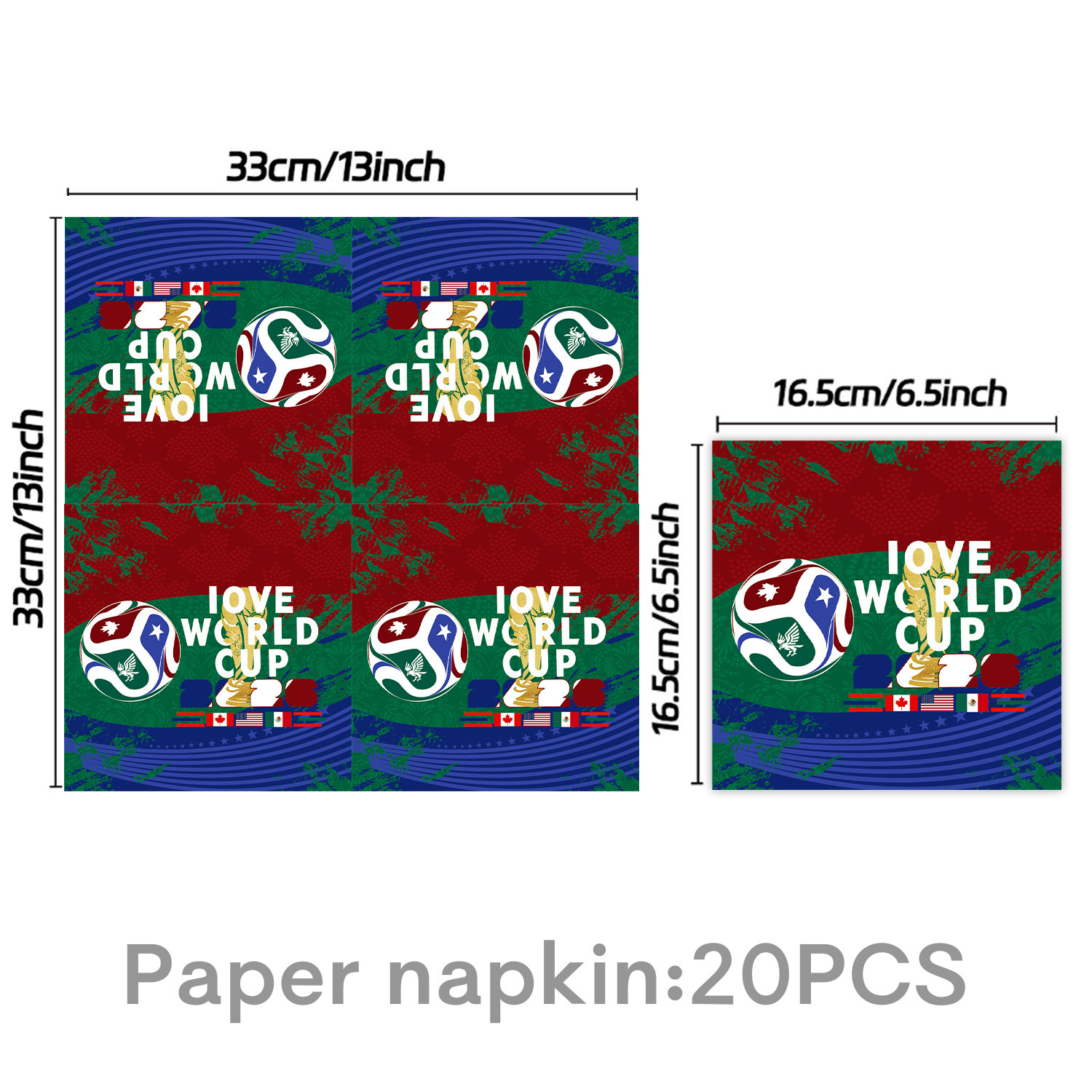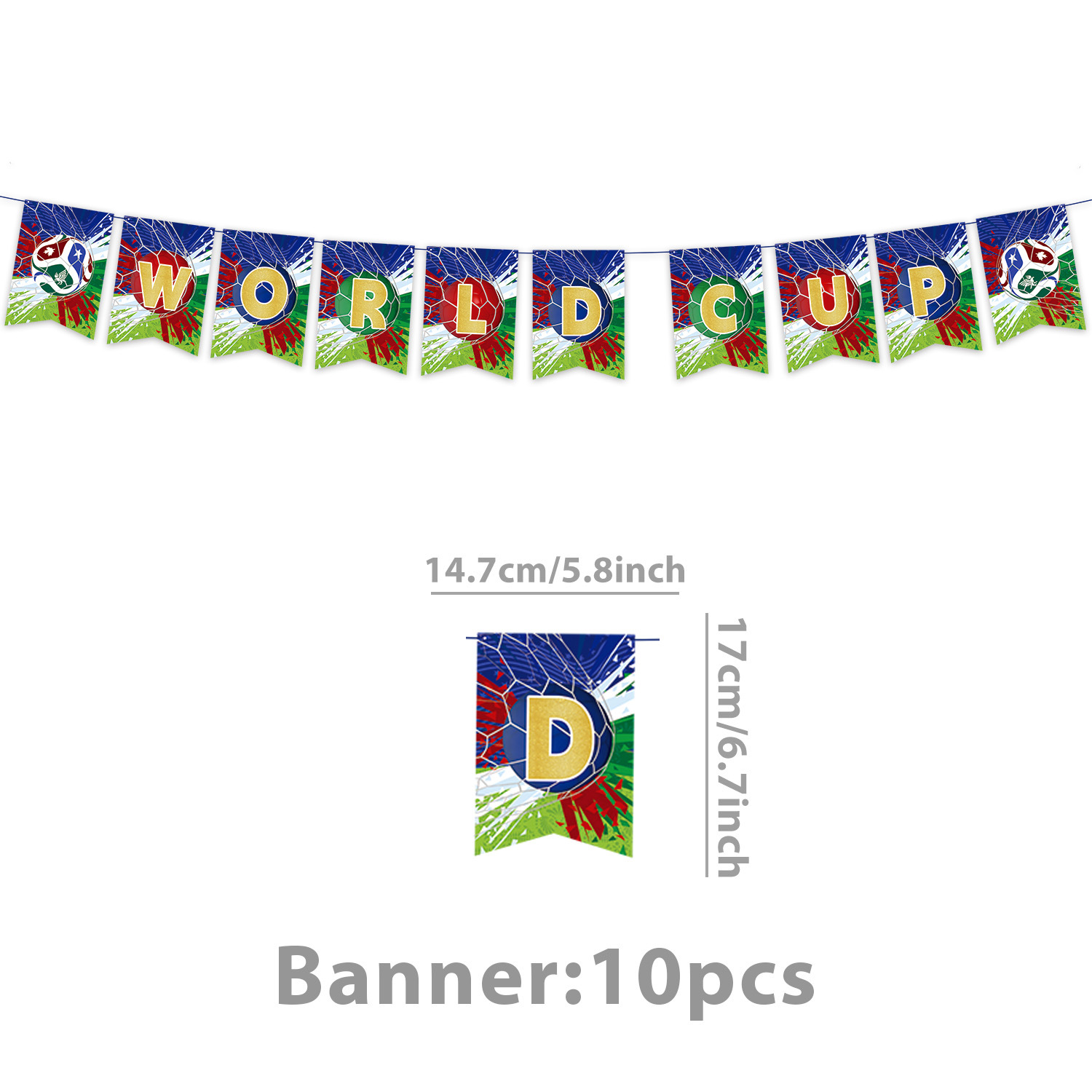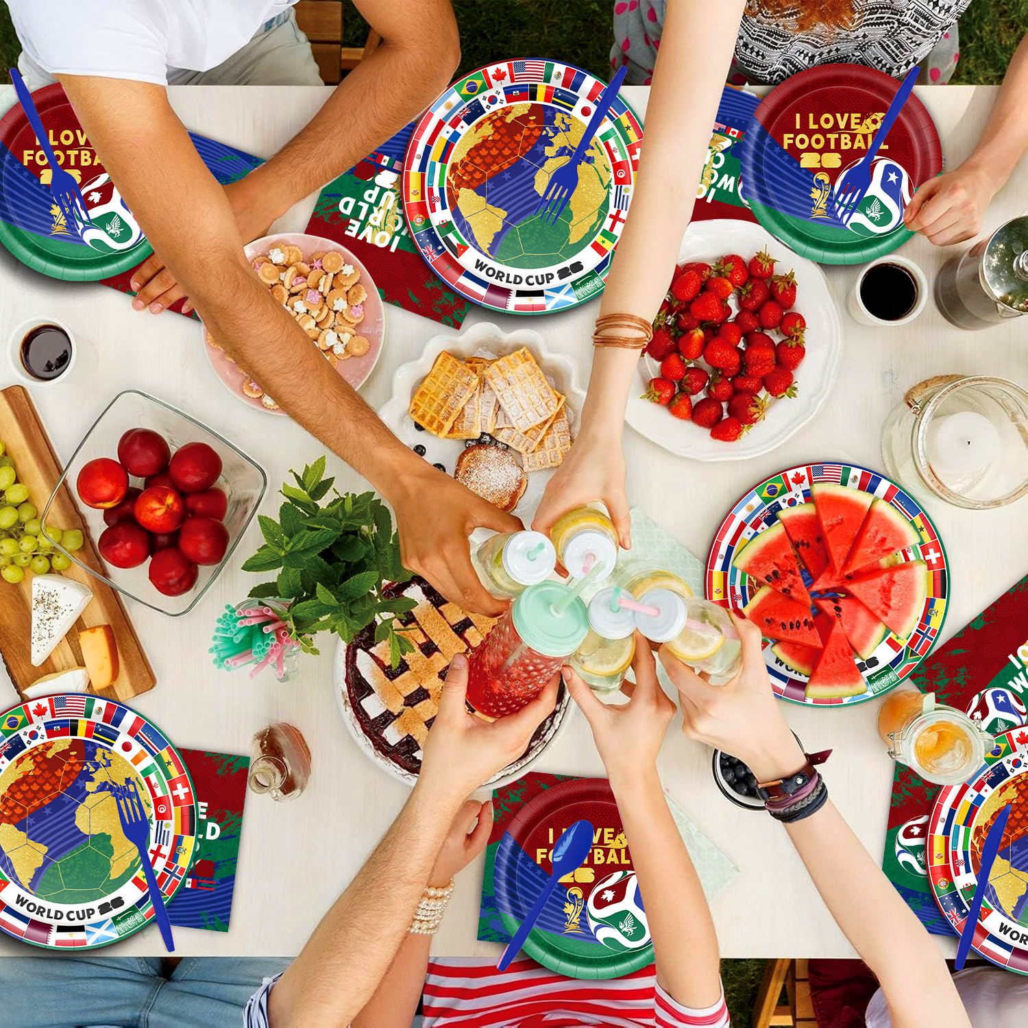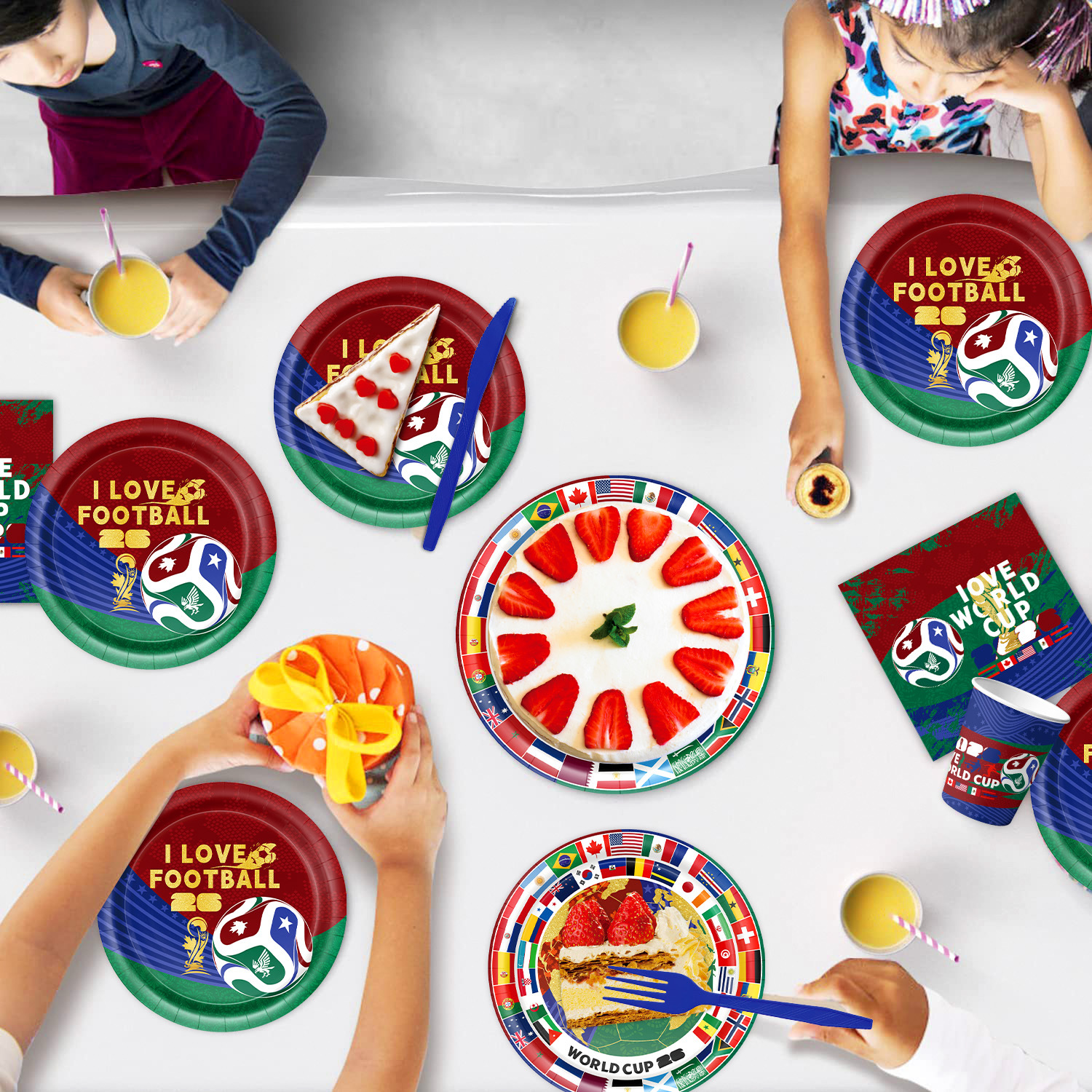 world cup 10-piece set (7-inch + 9-inch + hanging flag + paper napkins + paper cups + knife, fork and spoon straws + tablecloth)