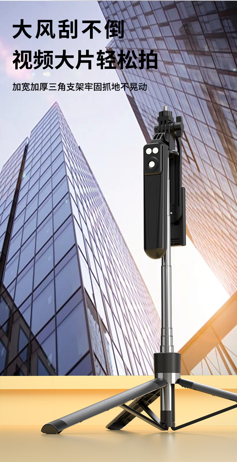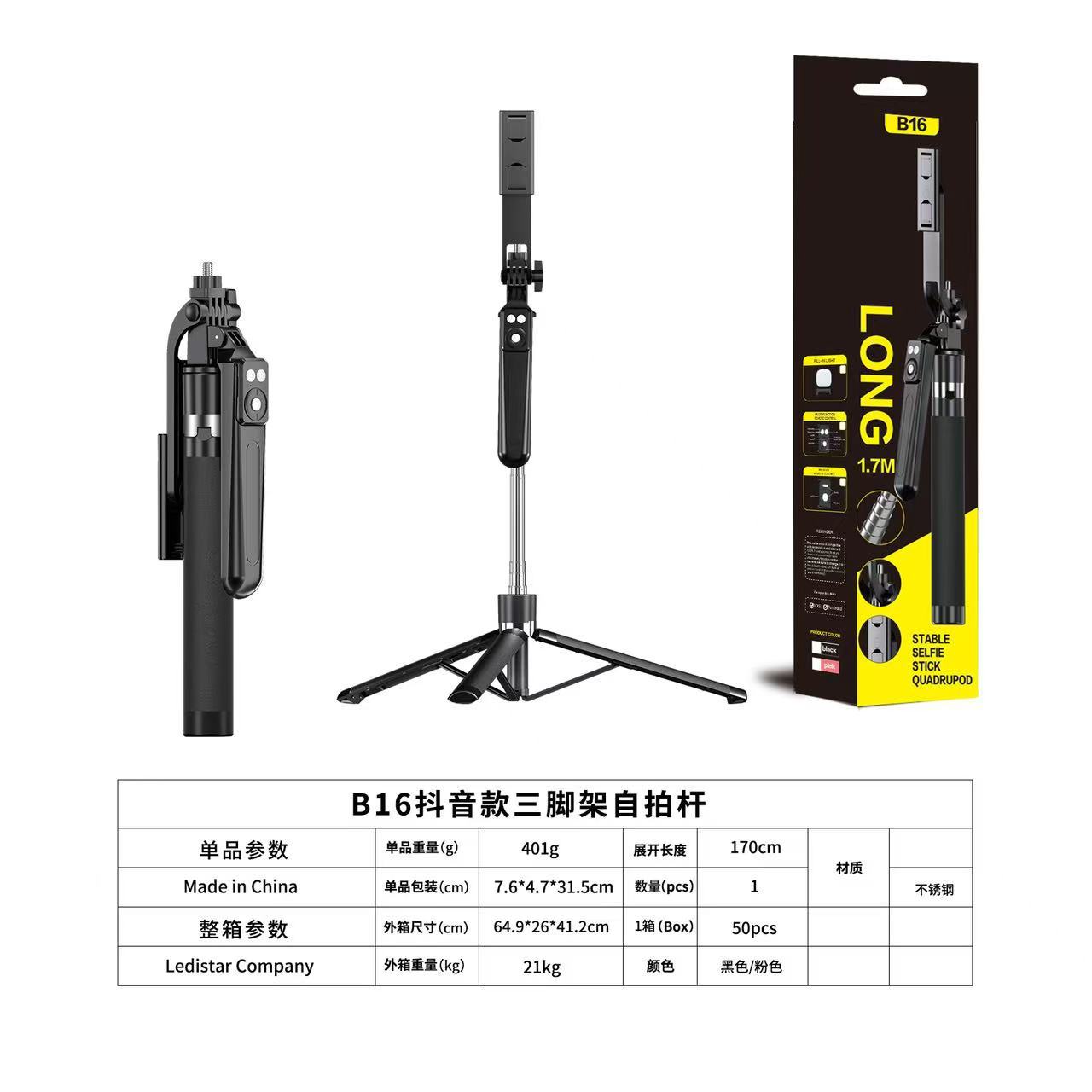 black 1.7m anti-shake selfie stick +1 small square light b16