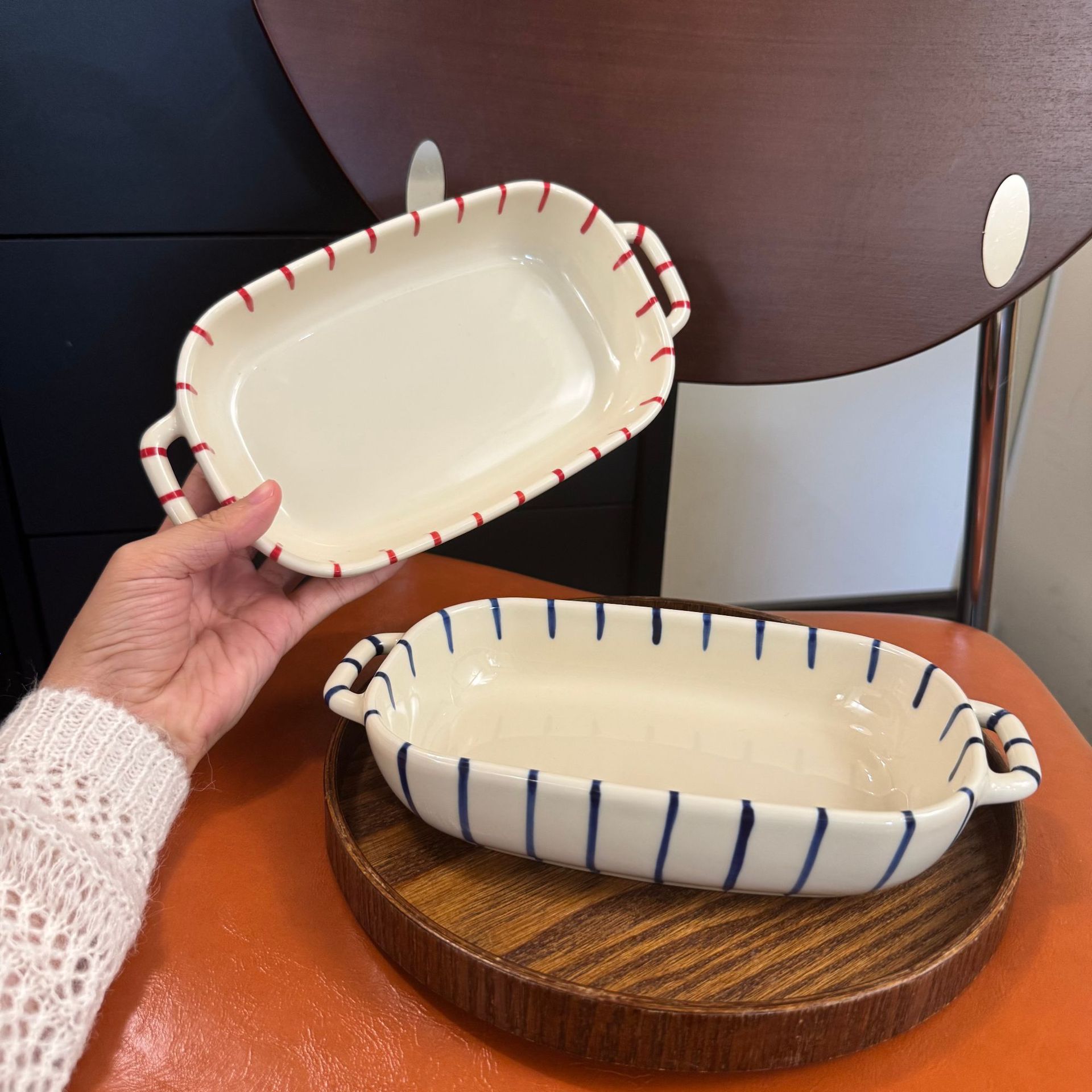 m67-9.5-inch double-ear rectangular baking bowl-striped red