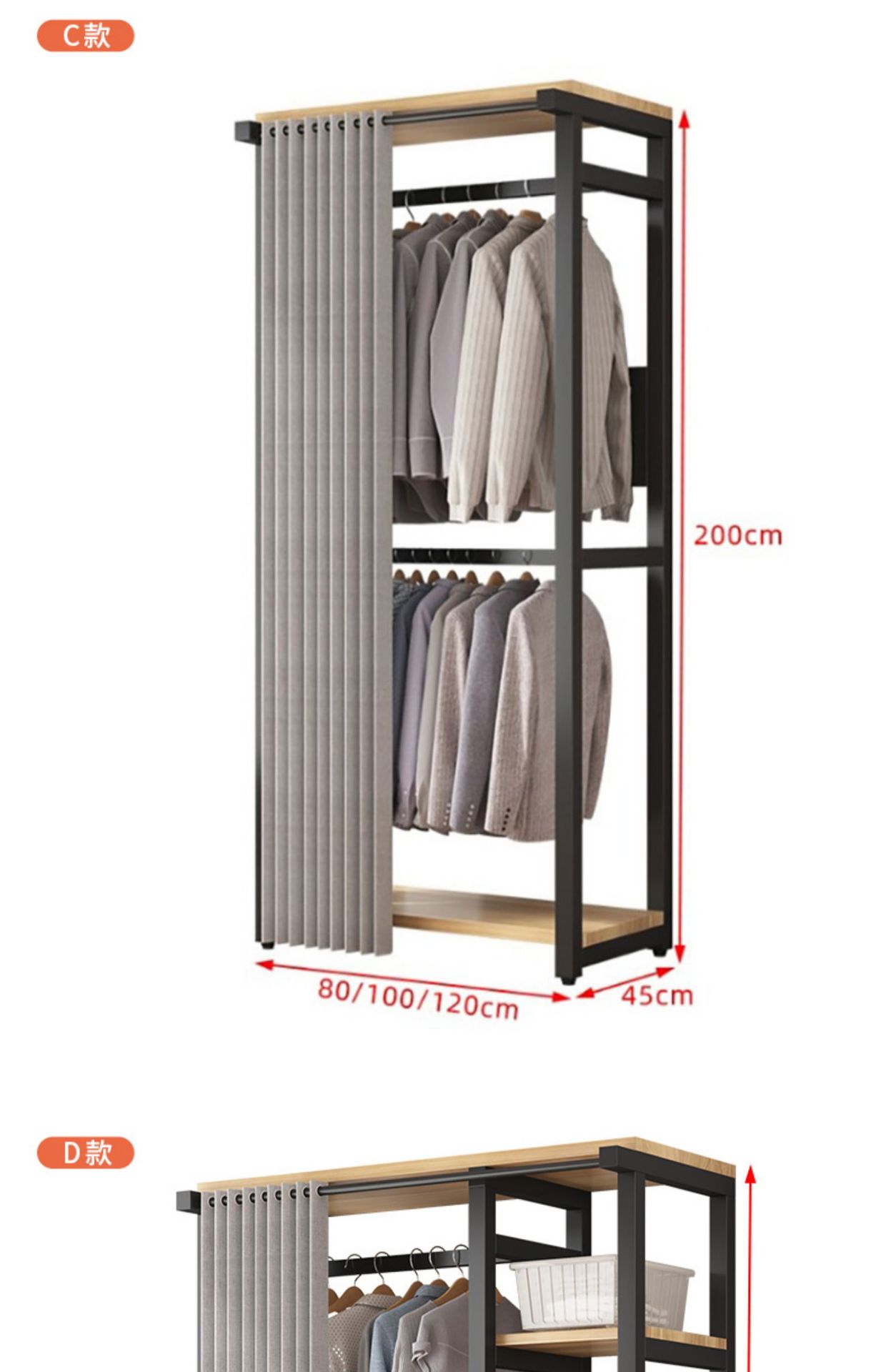 style c: 100cm long, 45cm wide, 200cm high; gray front curtain + rear cover.