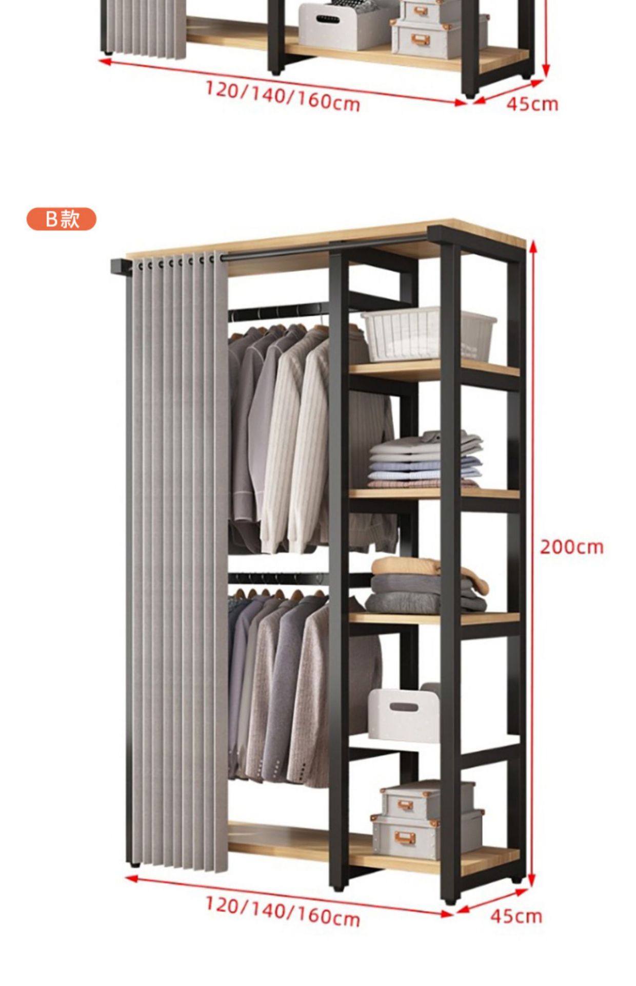 style b: 120cm long, 45cm wide, 200cm high; gray front curtain + back cover.
