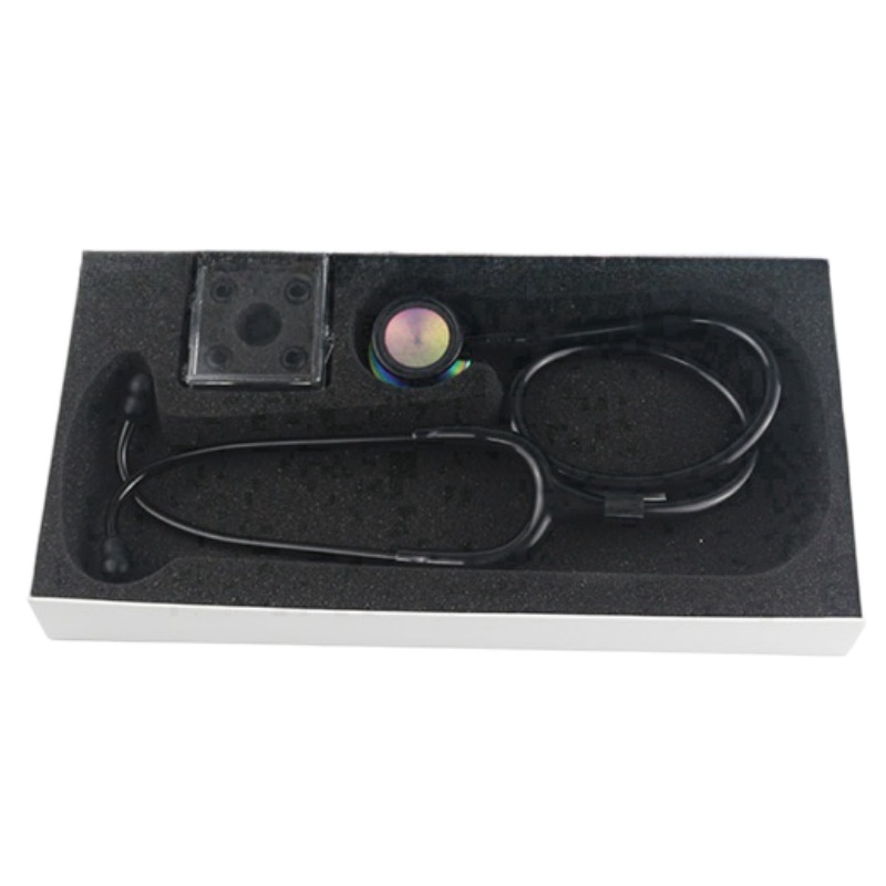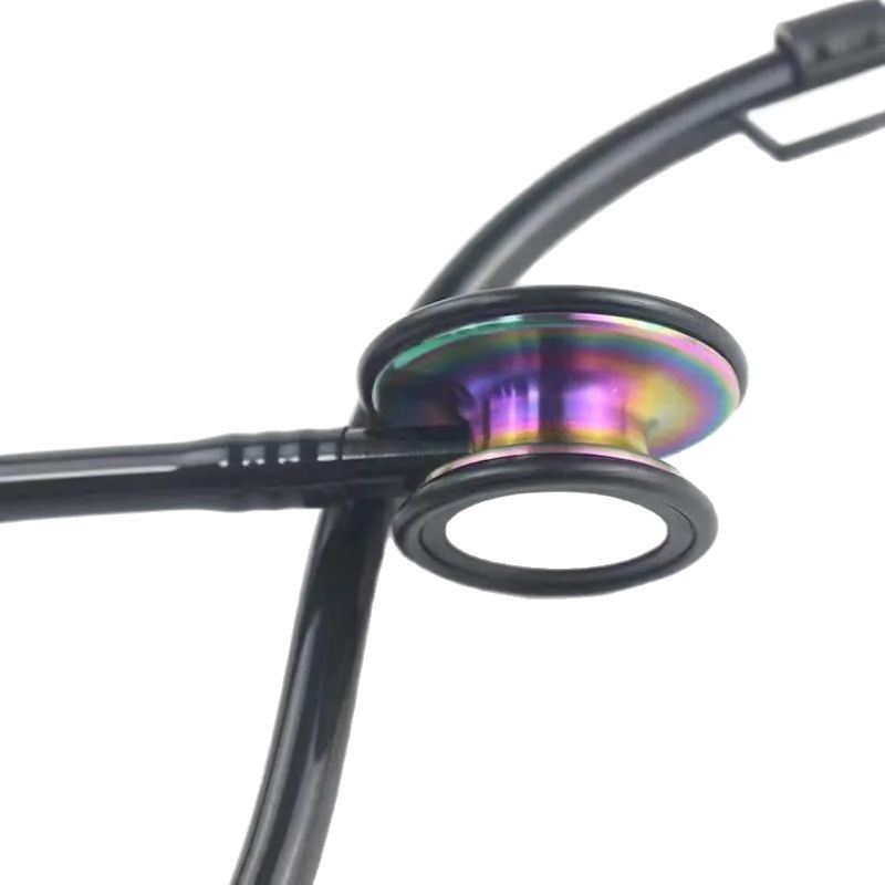 Newly designed dual-layer film stainless steel earpiece with rainbow finish, the film is a newly designed integrated film, with excellent sealing performance, and the ear hooks are black surface-treated.