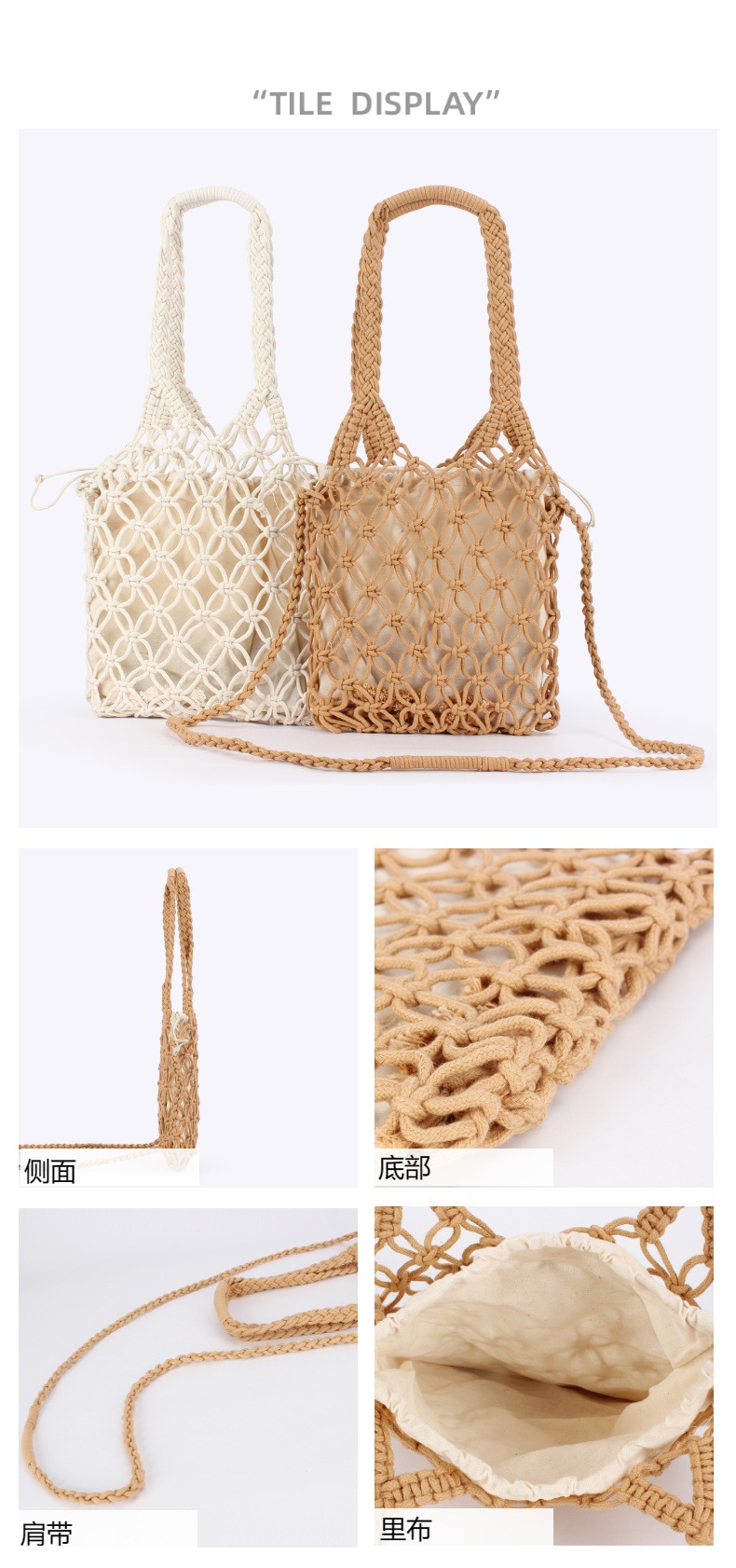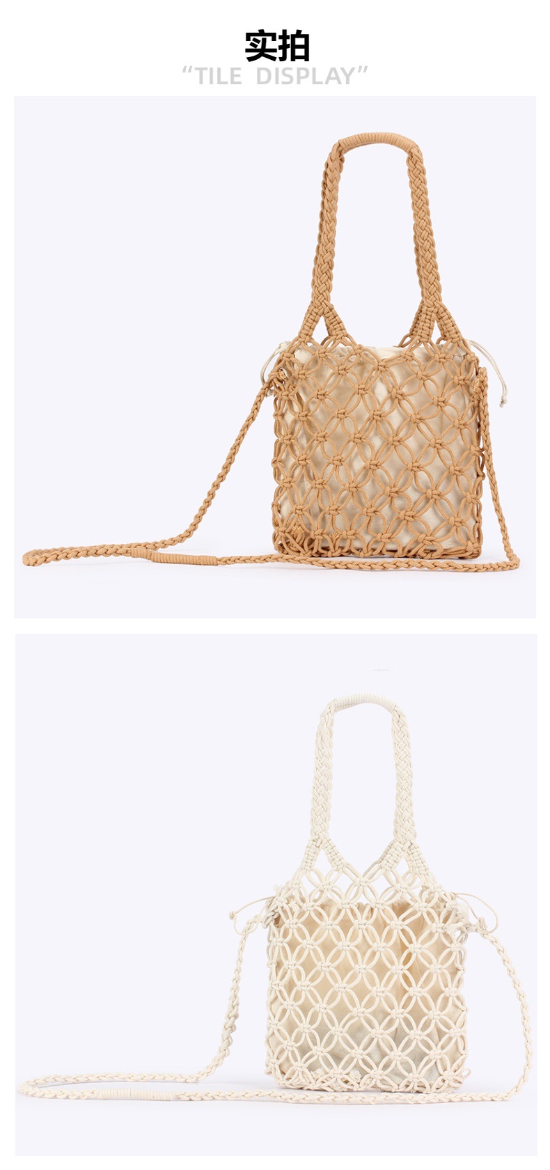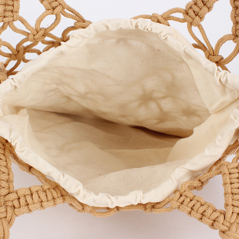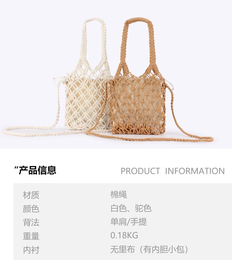 fashion commuter new pure color hand carrying crossbody dual-use hollow woven bag mori style cotton string net pocket vacation beach bag