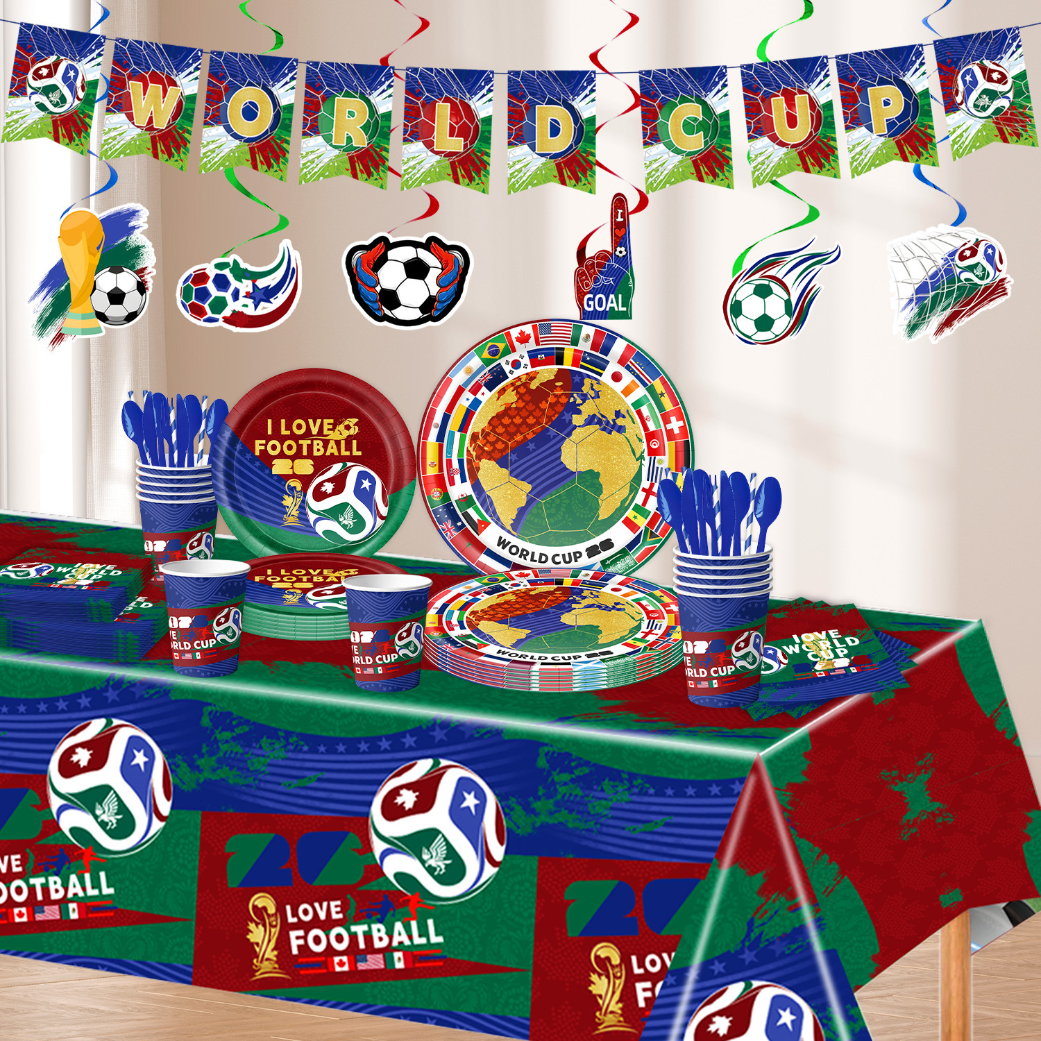 world cup 10-piece set (7-inch + 9-inch + hanging flag + paper napkins + paper cups + knife, fork and spoon straws + tablecloth)