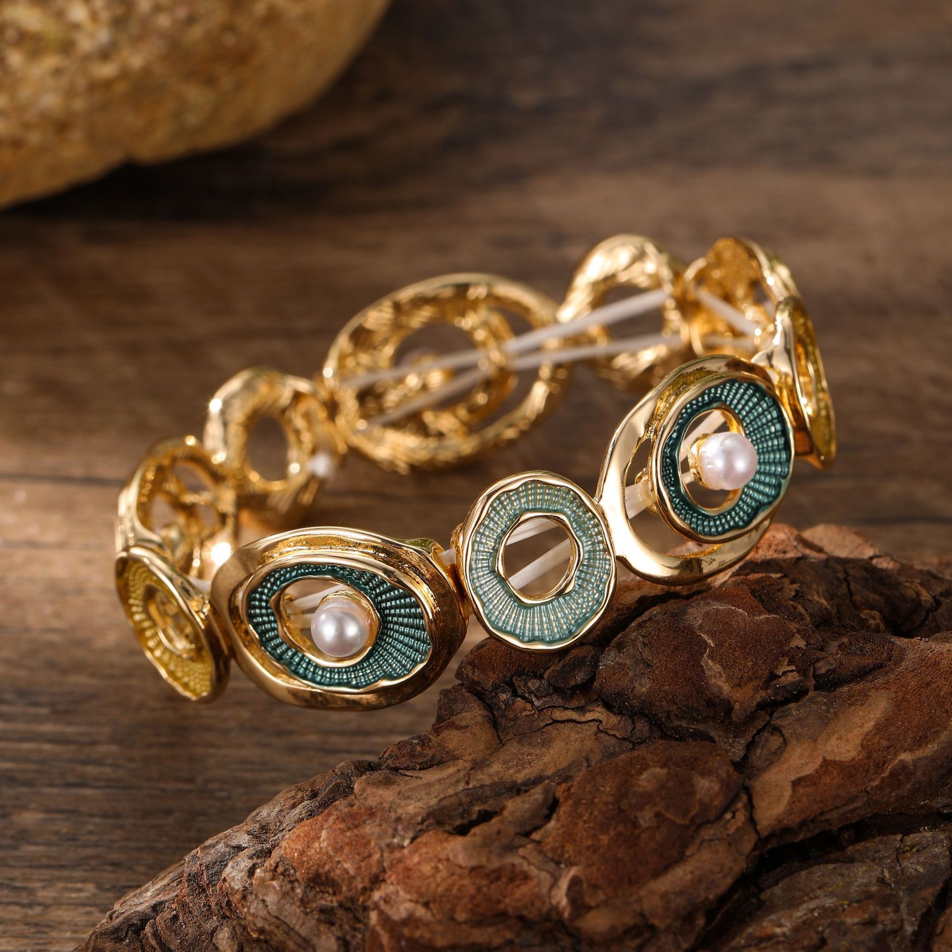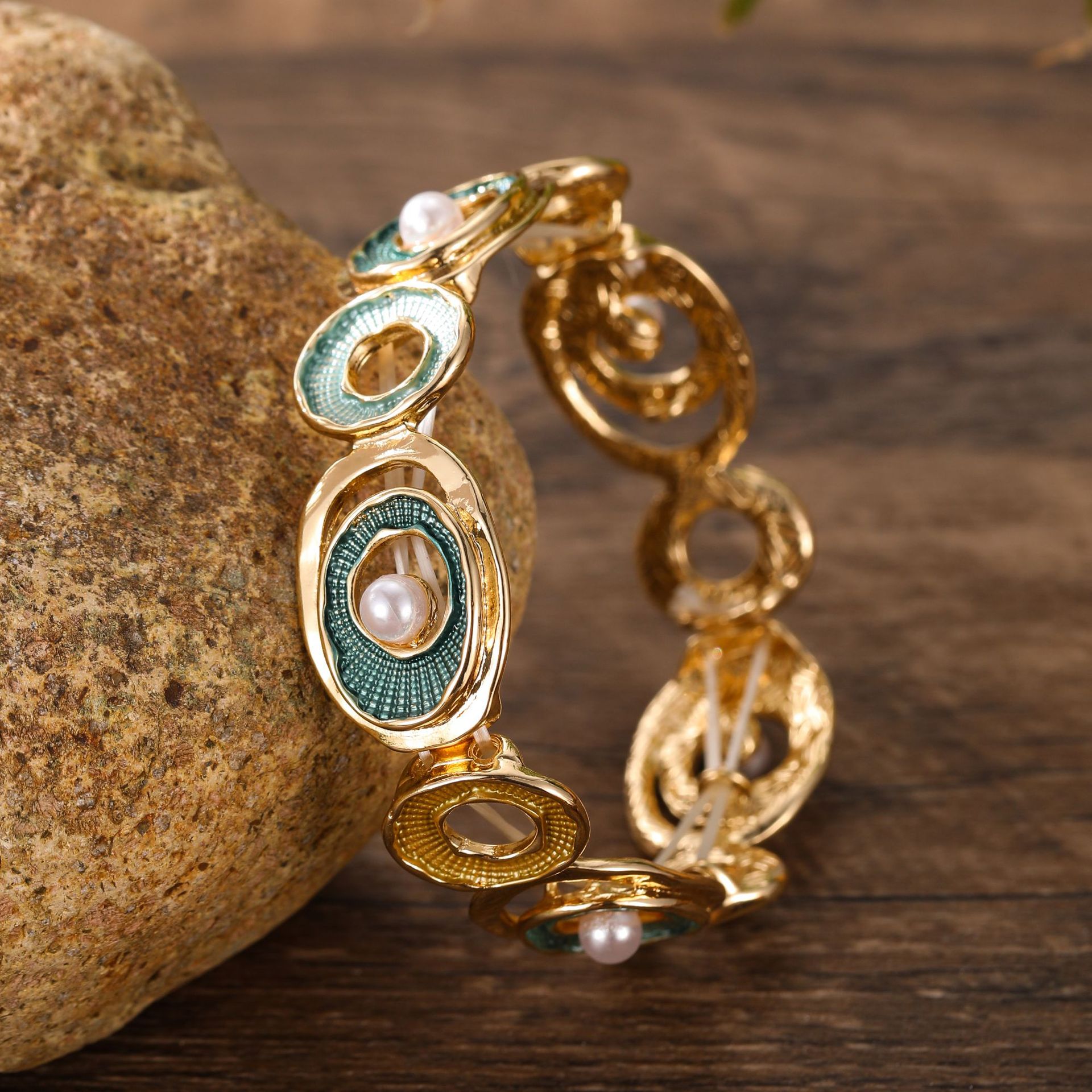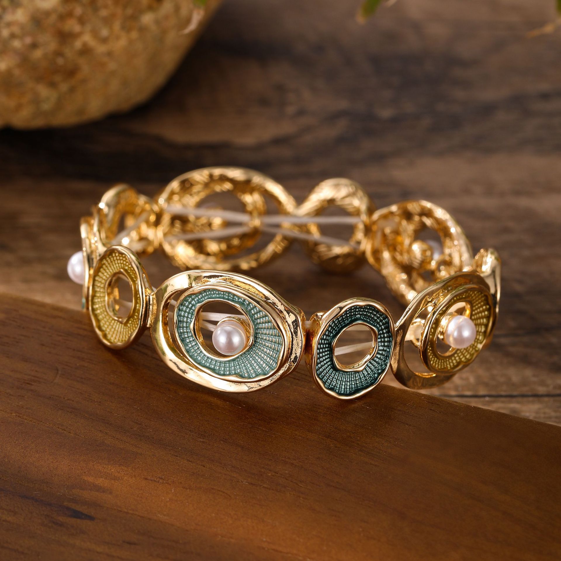 green hoop and pearl elastic bracelet-gold