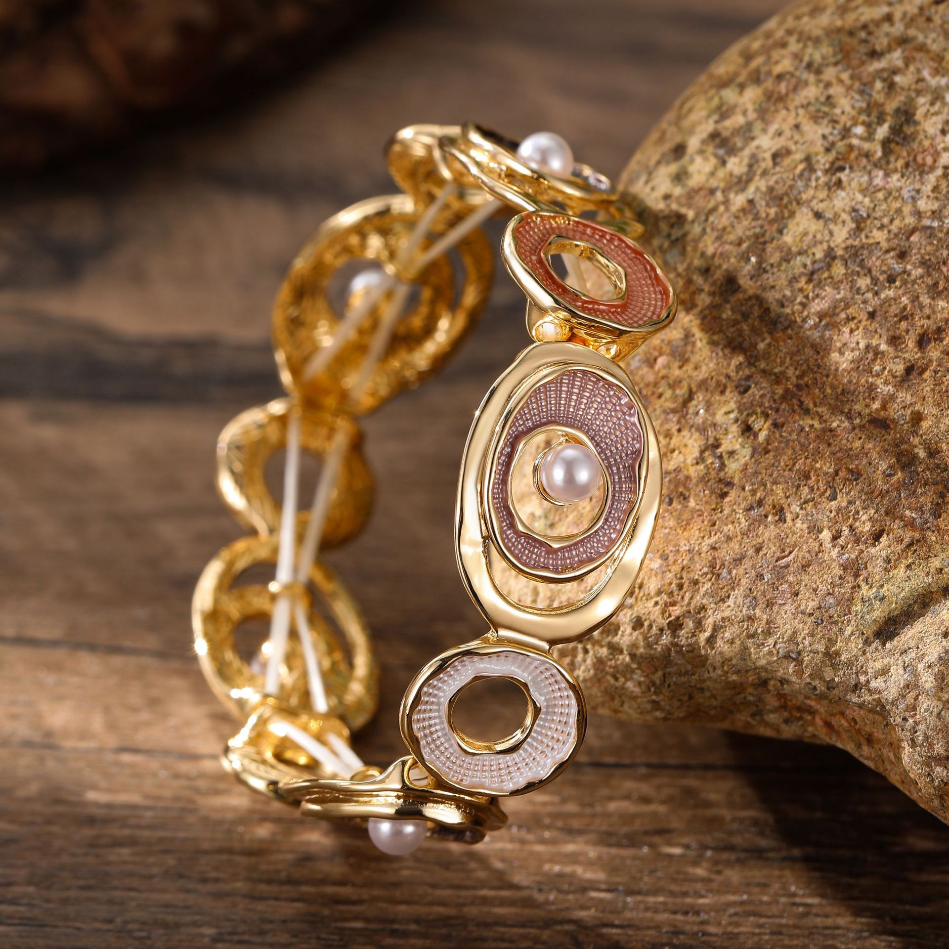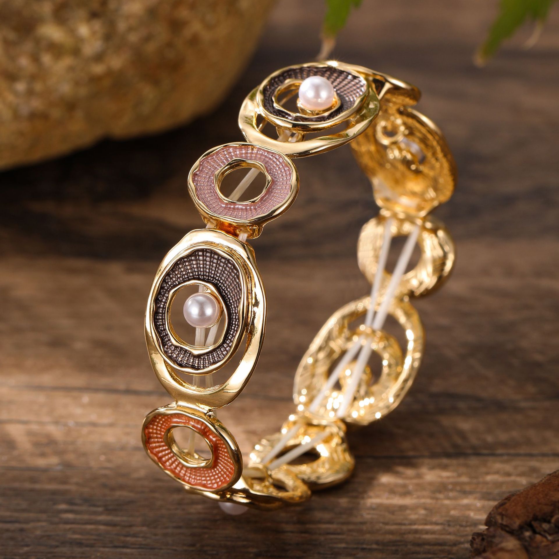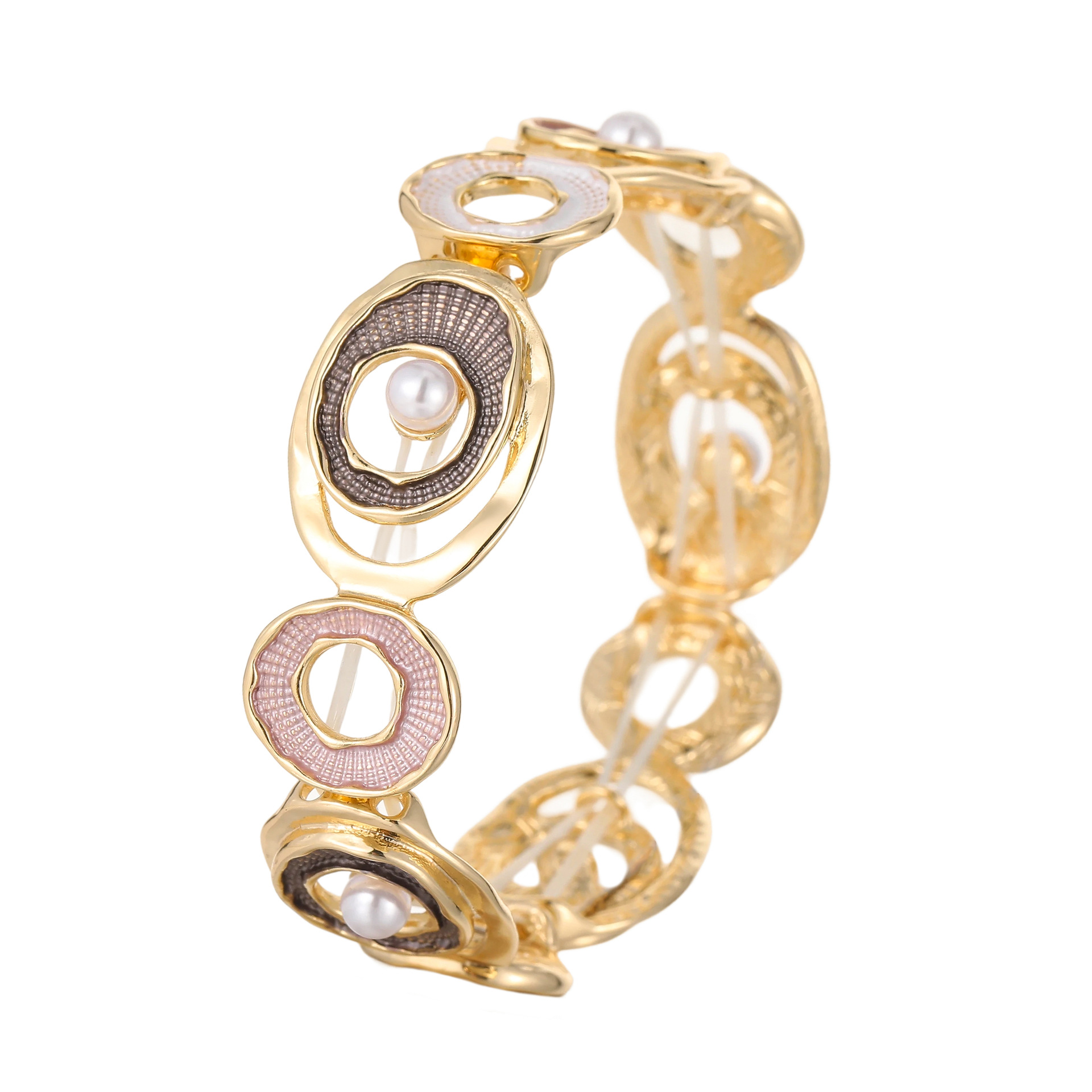 coffee color hoop and pearl stretch bracelet-gold