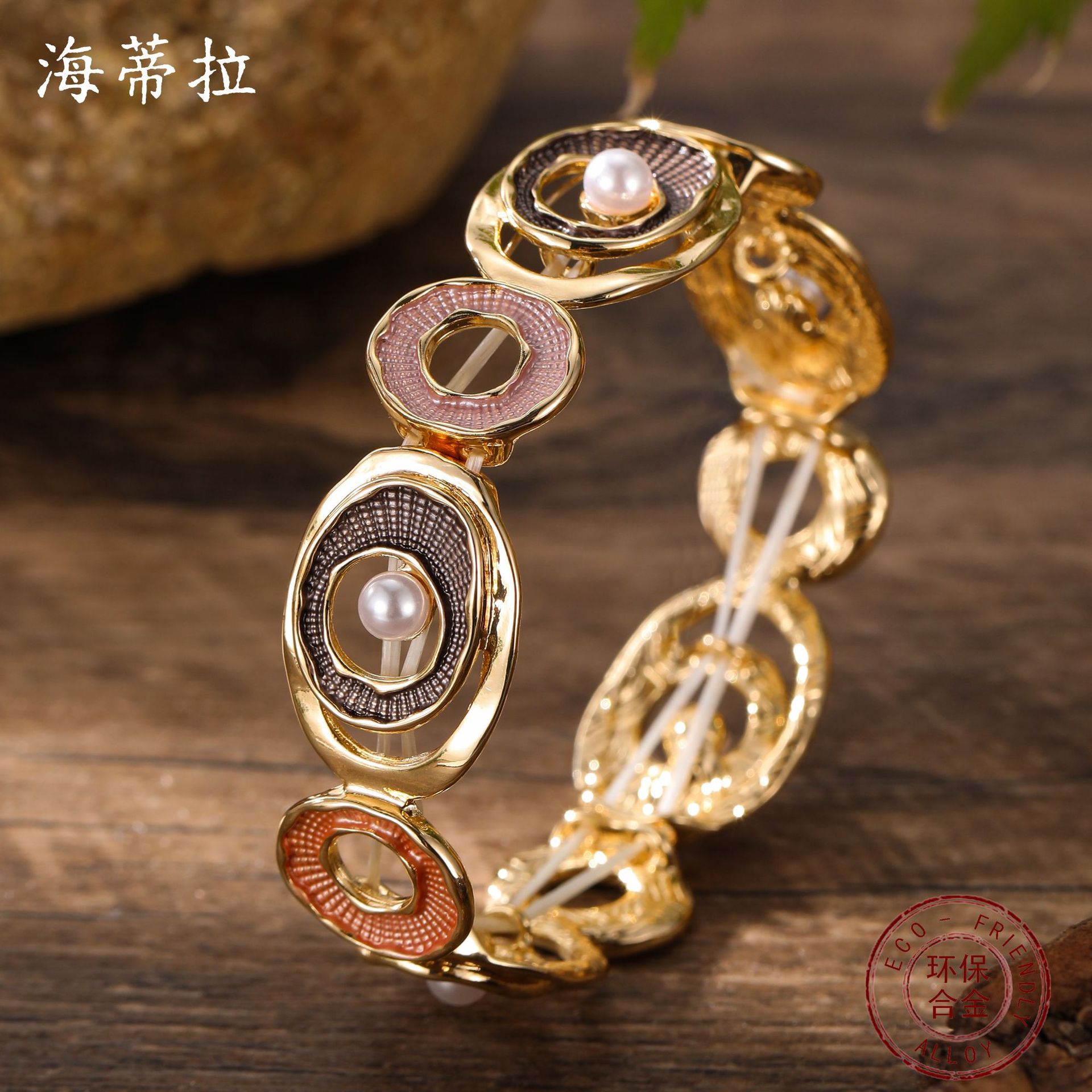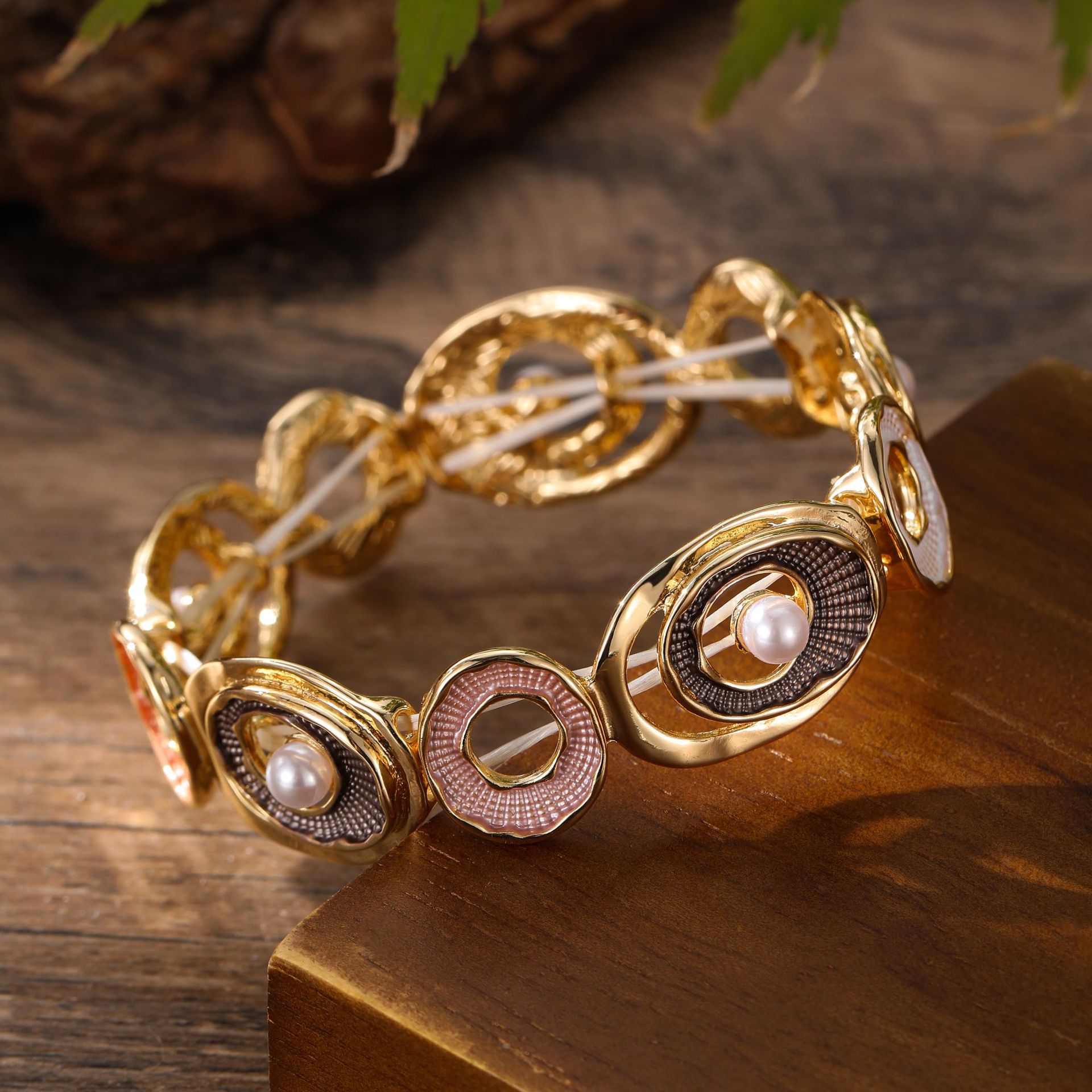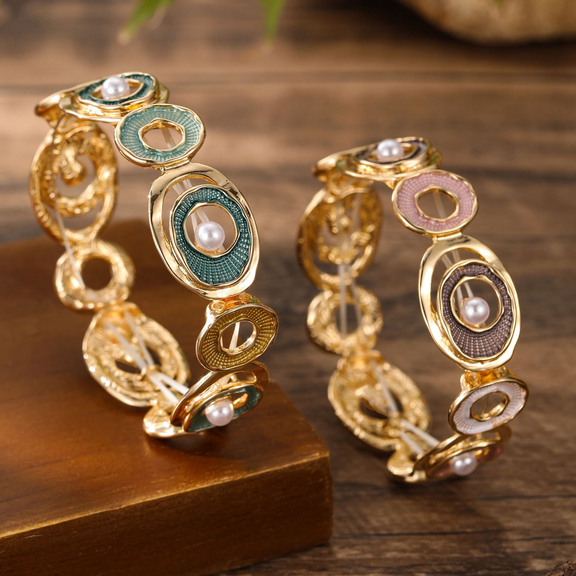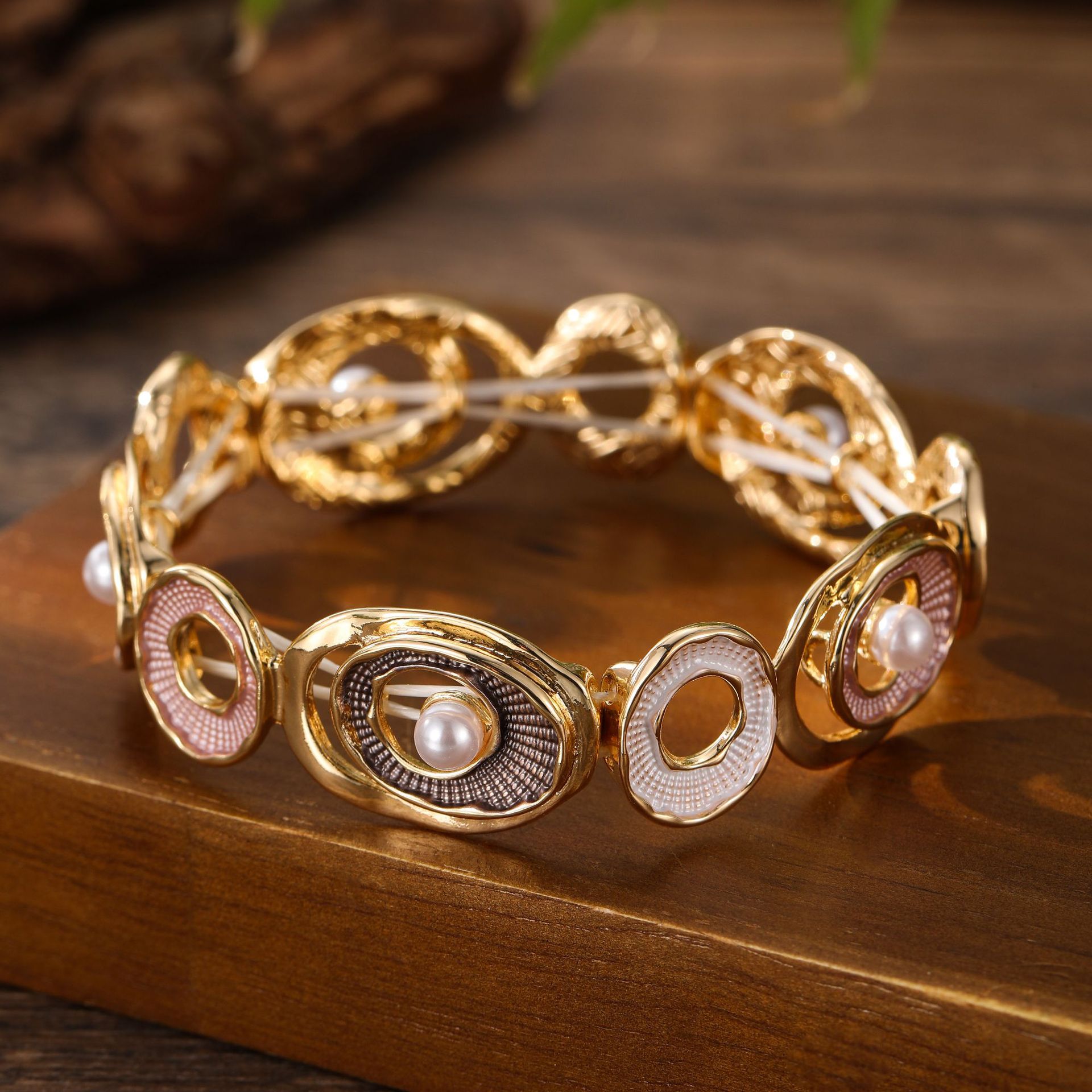 coffee color hoop and pearl stretch bracelet-gold