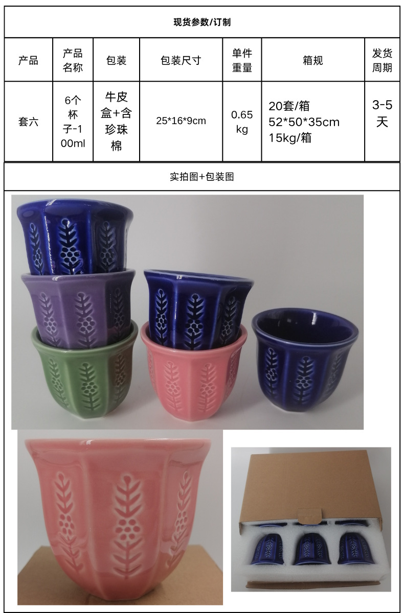 fcm arabic style 100ml six-piece set multicolor embossed tulip middle eastern ceramic coffee scented tea cup drop shipping