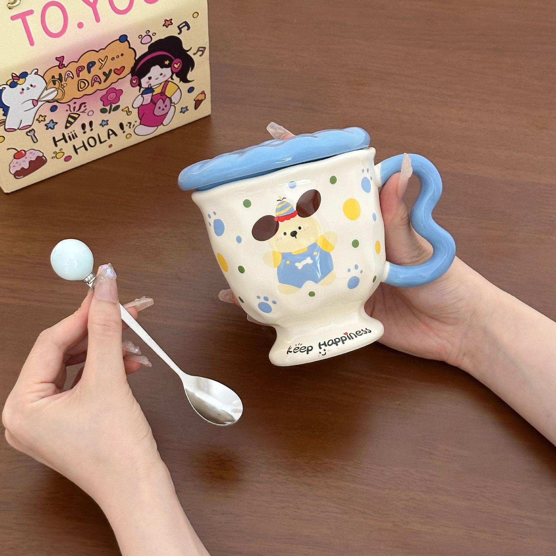 cute dot and bunny creative high-value cartoon drinking cup ceramic mug with cover spoon birthday gift for girls