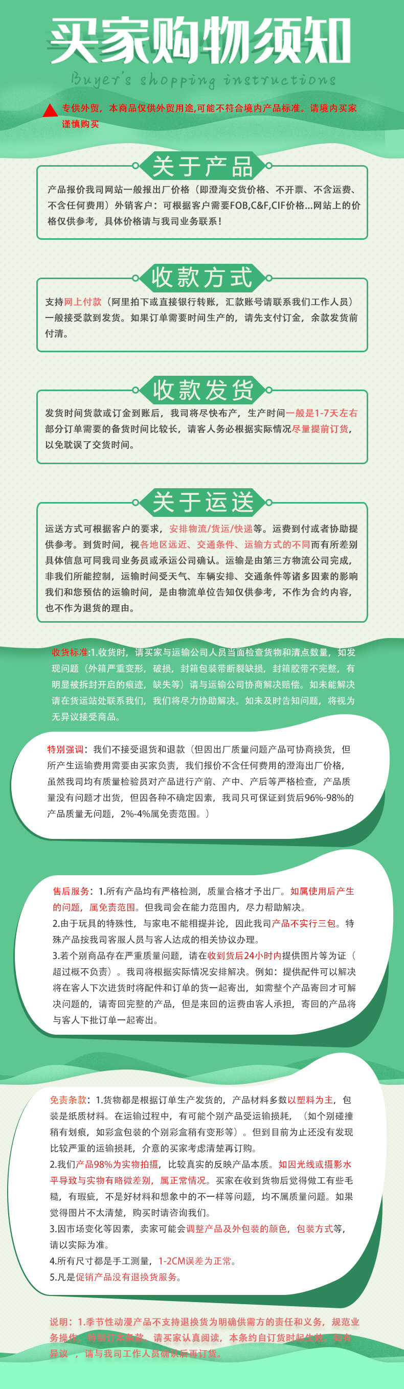 1. This product is exclusively for export trade and is not sold domestically. Please do not order for domestic customers.