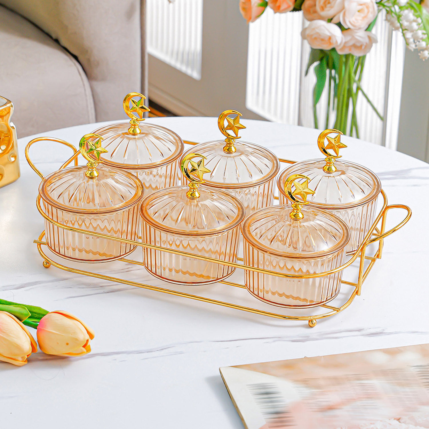 golden round frame 4-compartment amber dried fruit tray, star and moon beads, style b