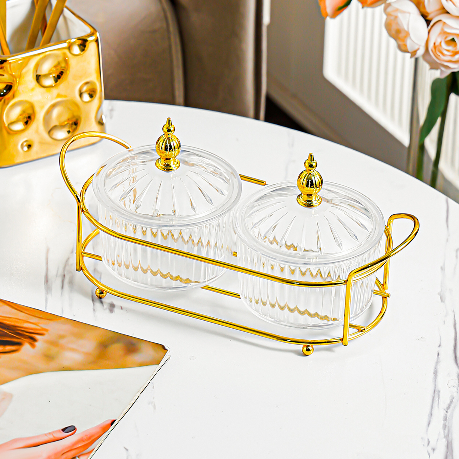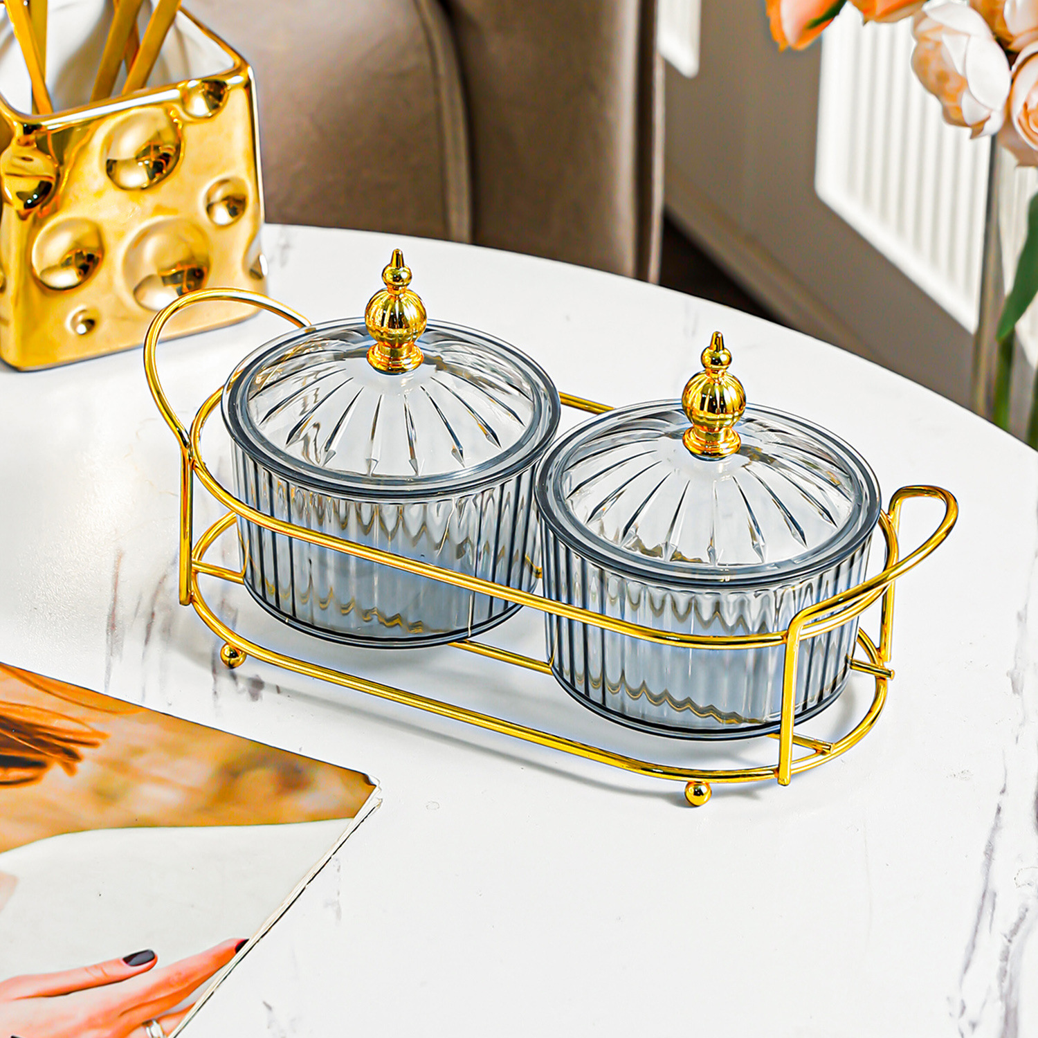 golden round frame 2-grid transparent dried fruit plate beads style